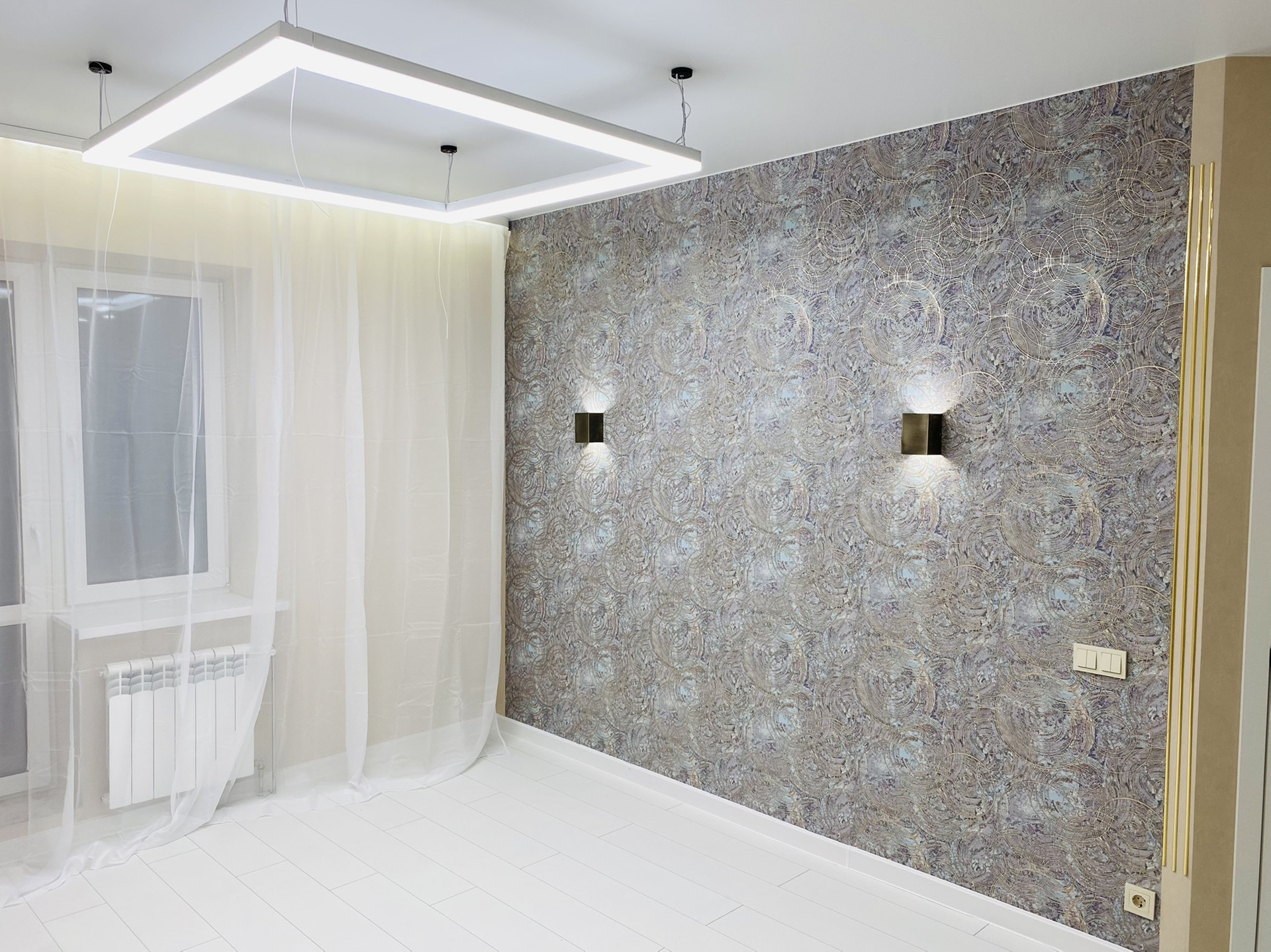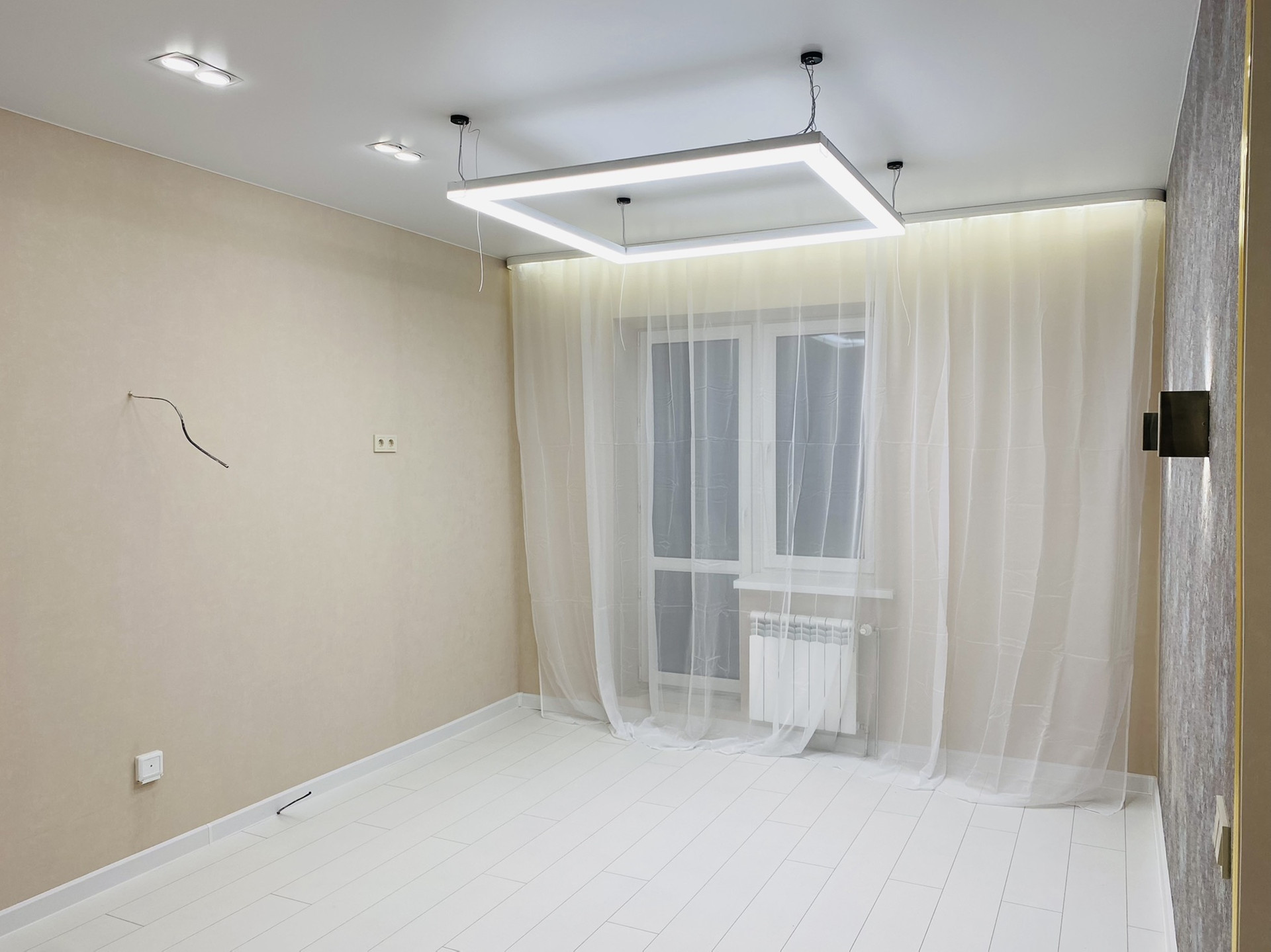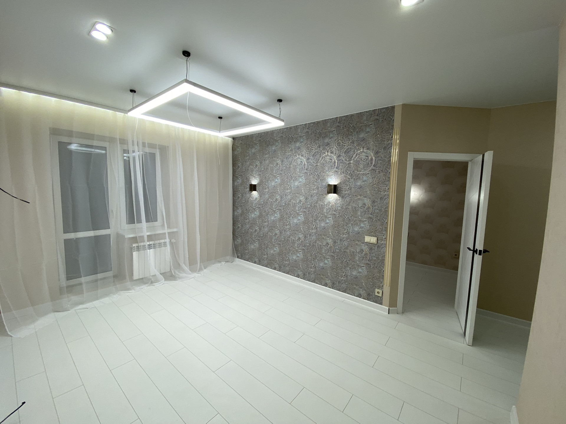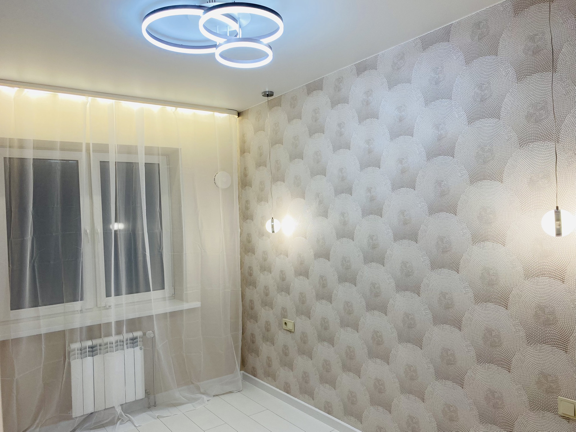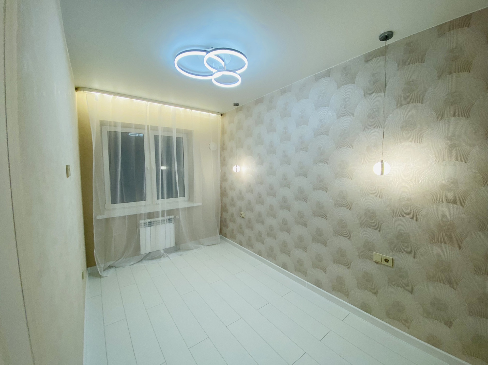 Сделан качественный , ремонт! Led подсветки в спальни , гостиной , карнизах. Прикроватные светильники, led люстра с различными режимами !