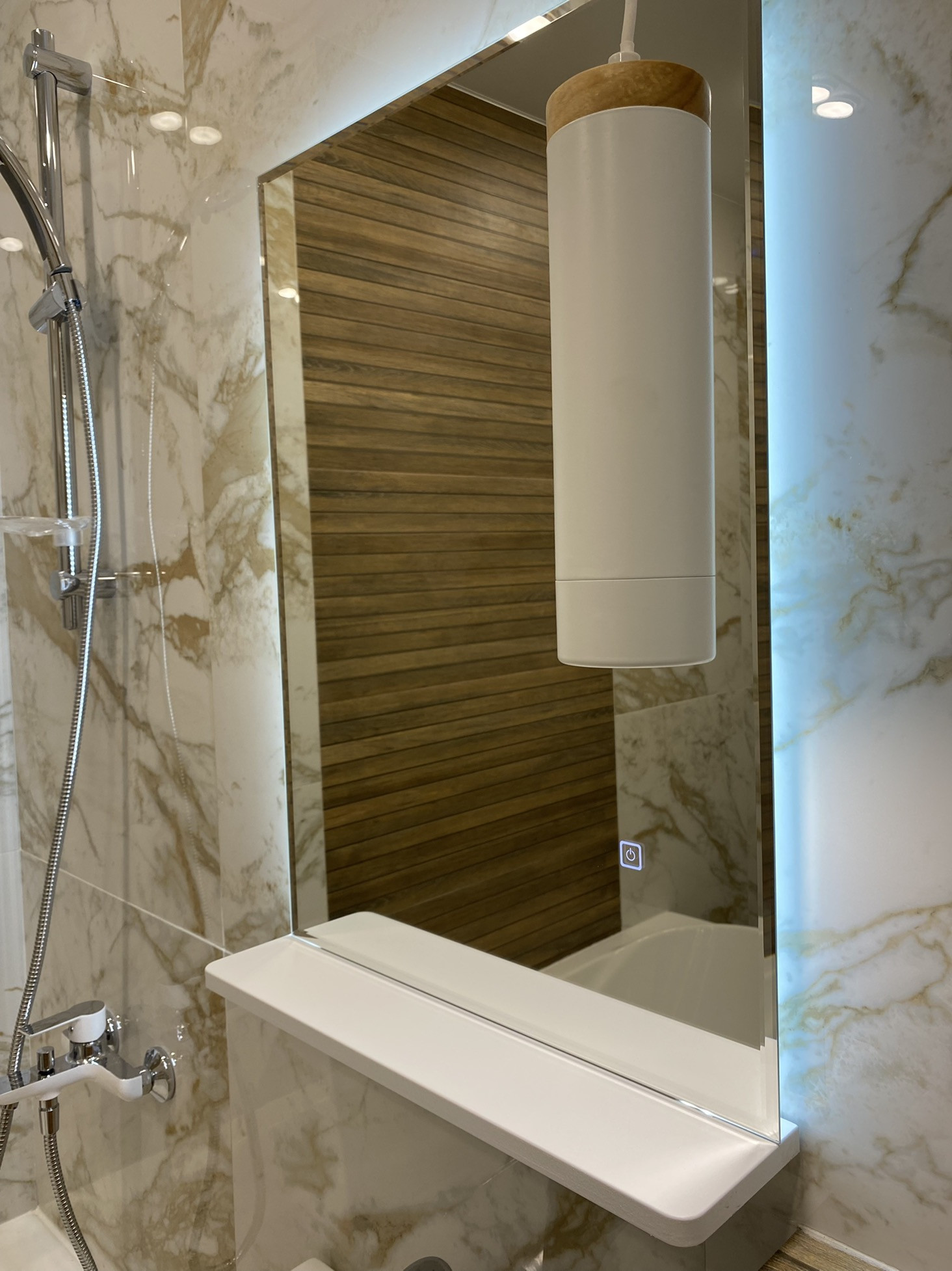 В ванной комнате подогрев полов , зеркало с подсветкой, подогревом .