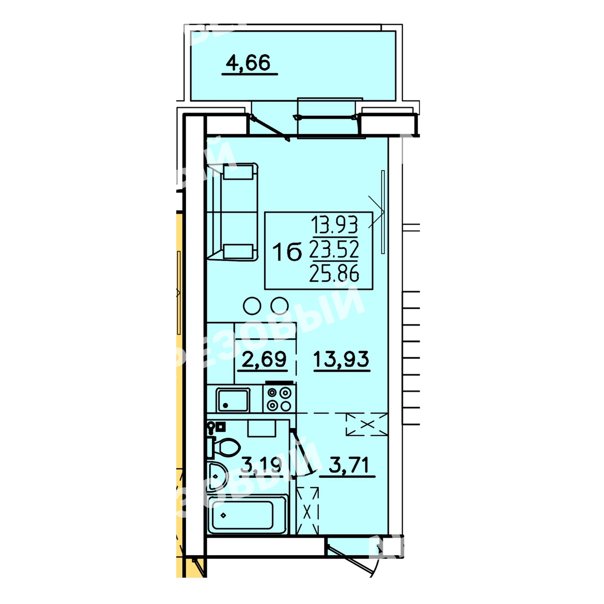 Общая площадь 28 кв.м. из них 23,52 кв.м. площадь самой квартиры и 4,66кв.м лоджия.