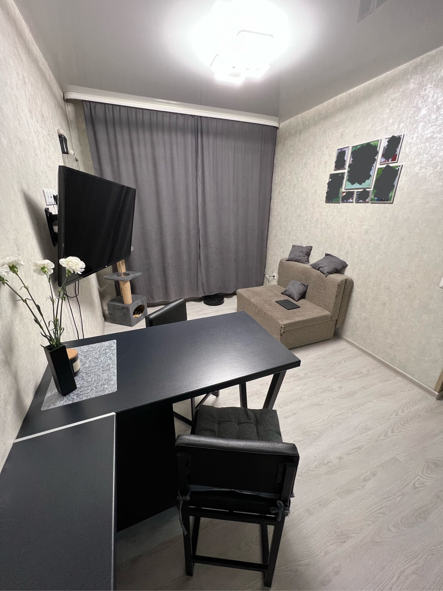 окна выходят на южную сторону, поэтому в помещении солнечно в любое время года. проблему ярких лучей по утрам решают шторы «блэкаут»