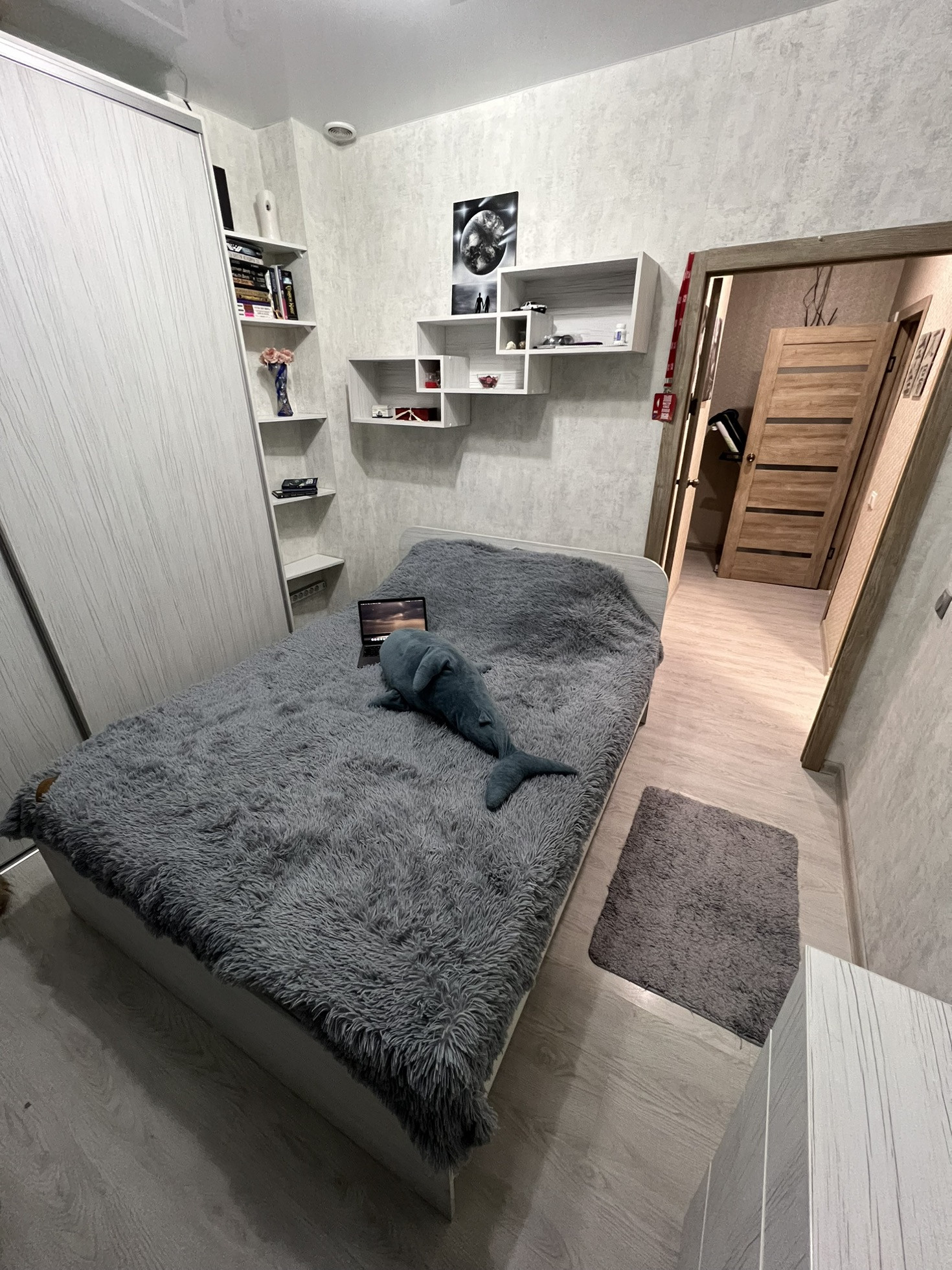 мебель в спальне сделана в едином стиле. оставим: кровать, выстроенный вместительный шкаф, комод и полки.