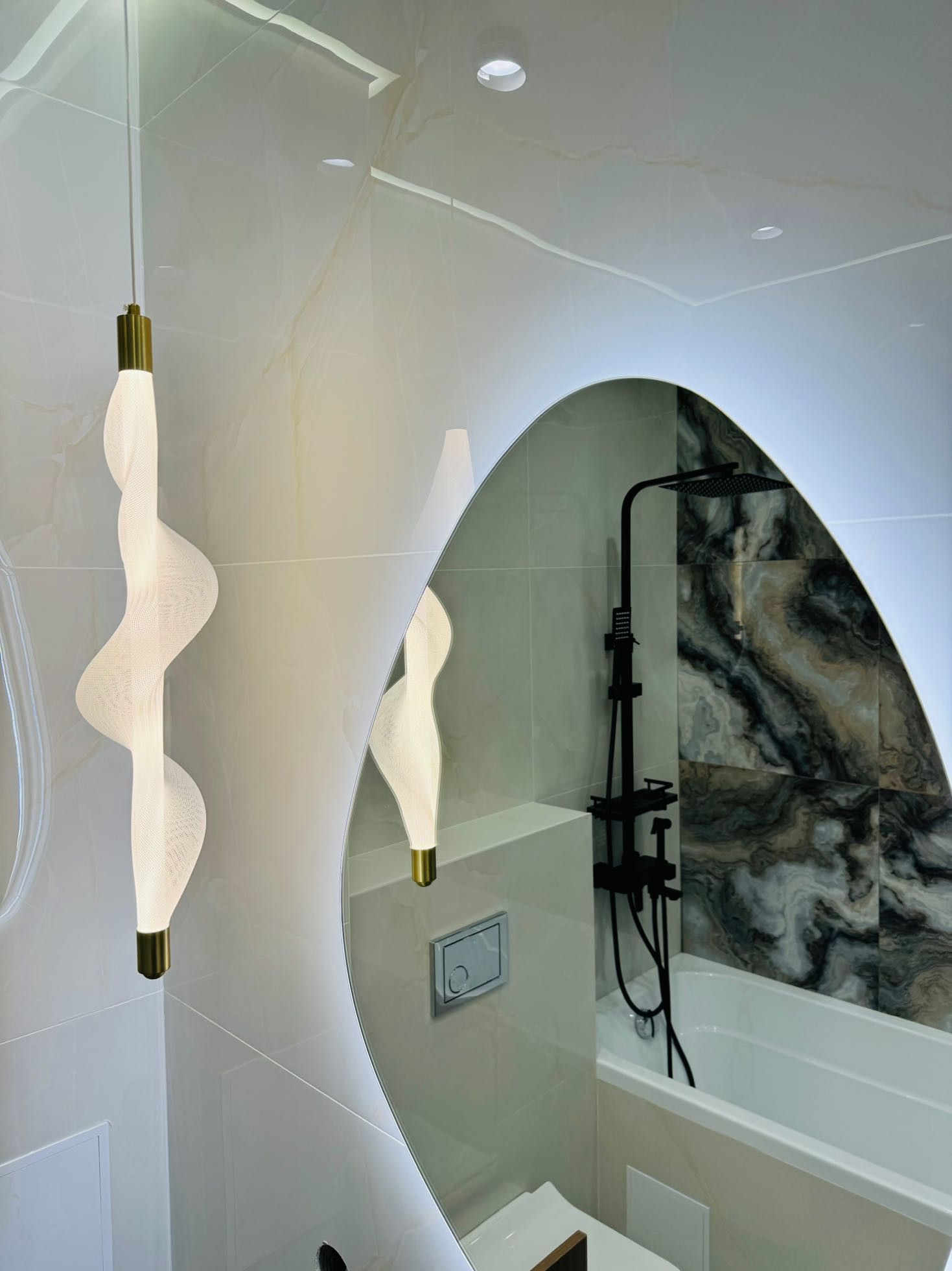 В ванных комнатах подогрев полов , зеркало с подсветкой .