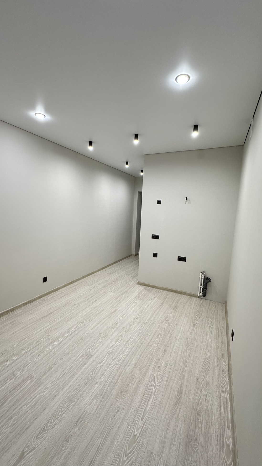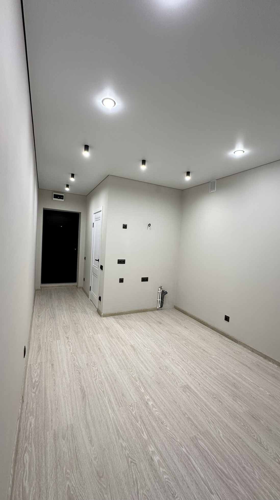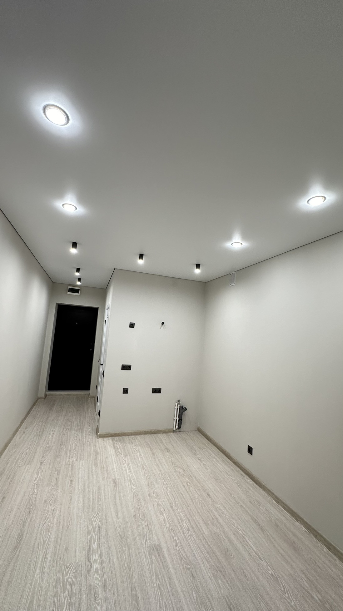 ✅ Потолки натяжные с теневым профилем. Освещение выполнено точечными светильниками и акцентными софитами в зоне кухни и коридора