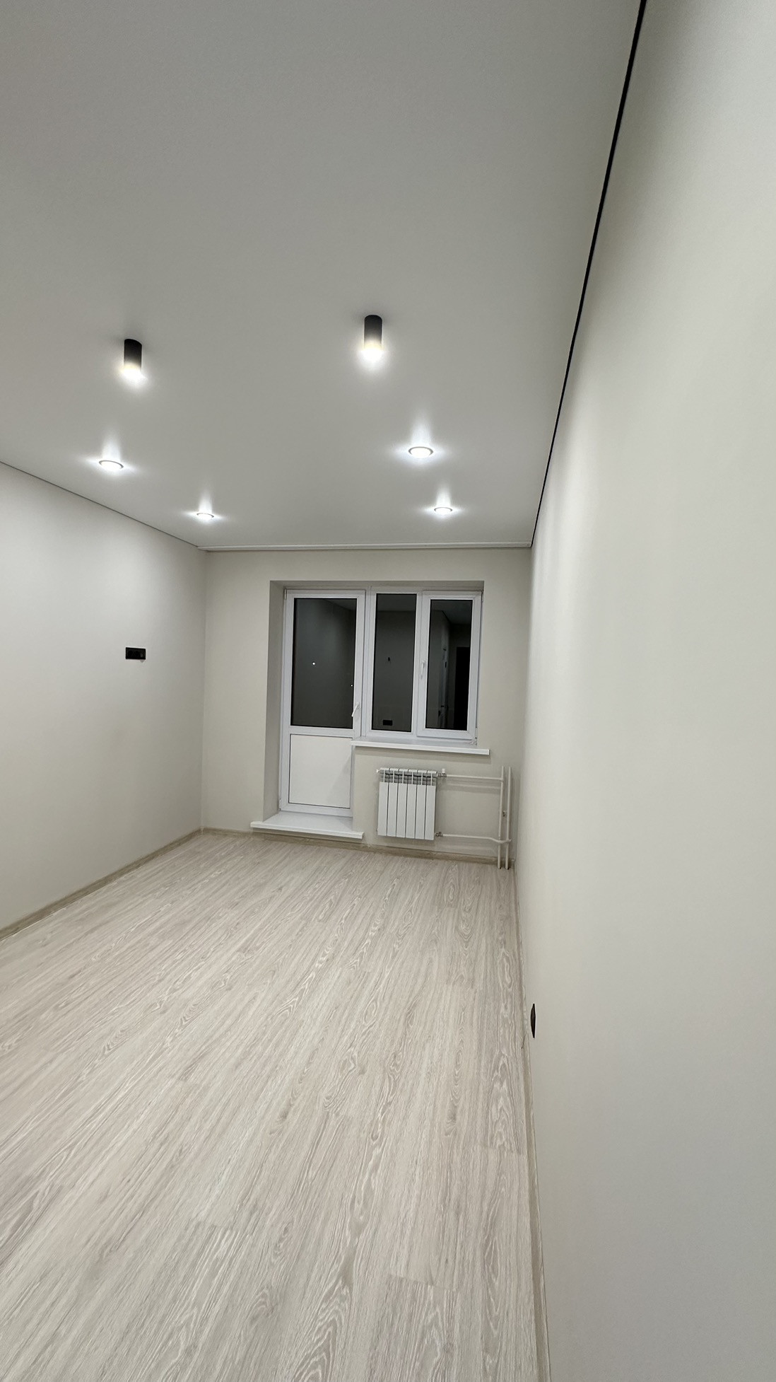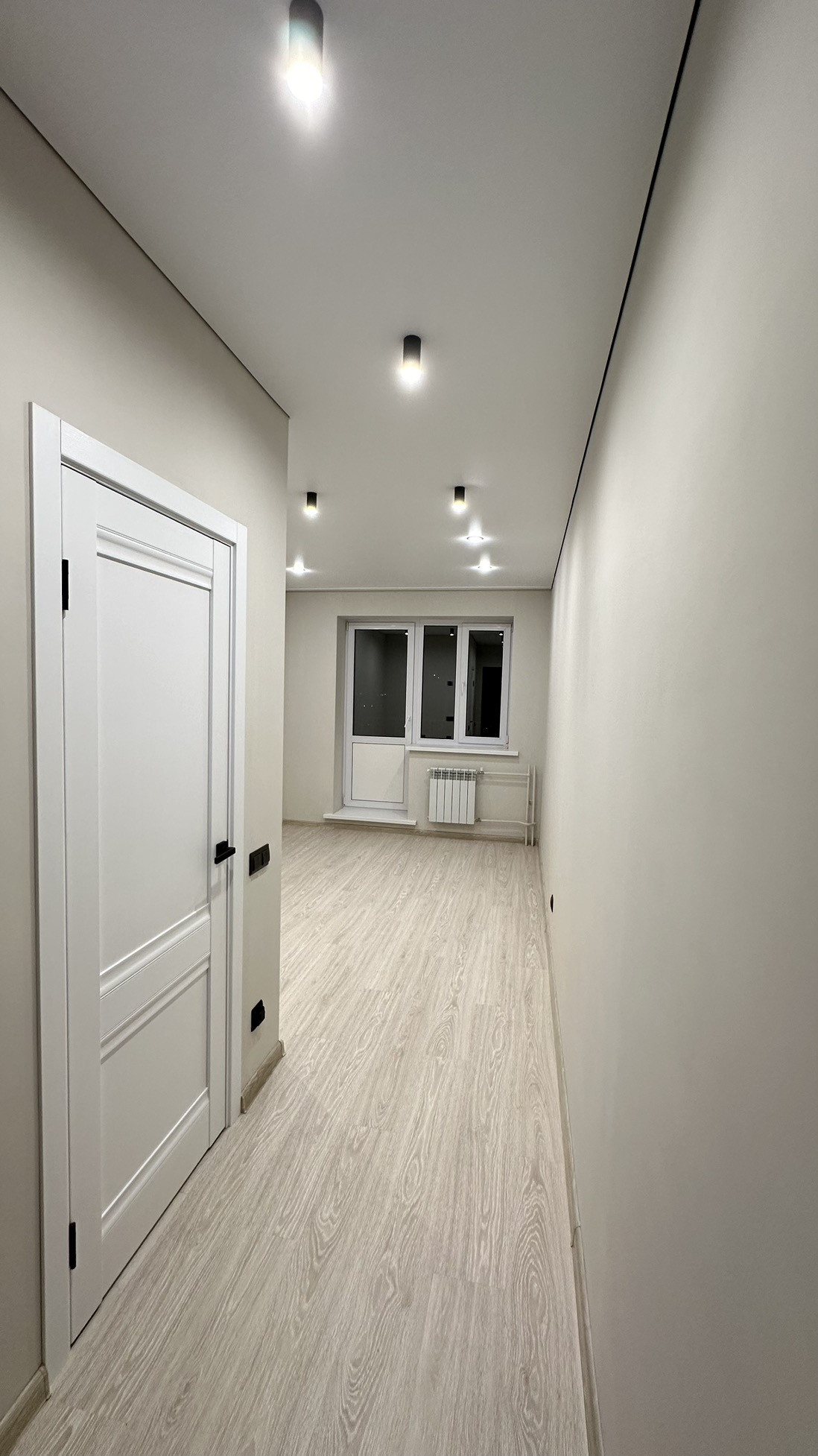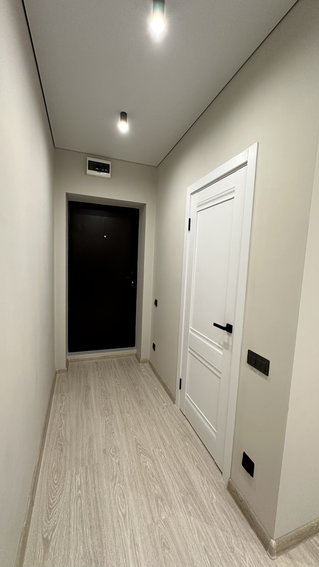 ✅ Потолки натяжные с теневым профилем. Освещение выполнено точечными светильниками и акцентными софитами в зоне кухни и коридора