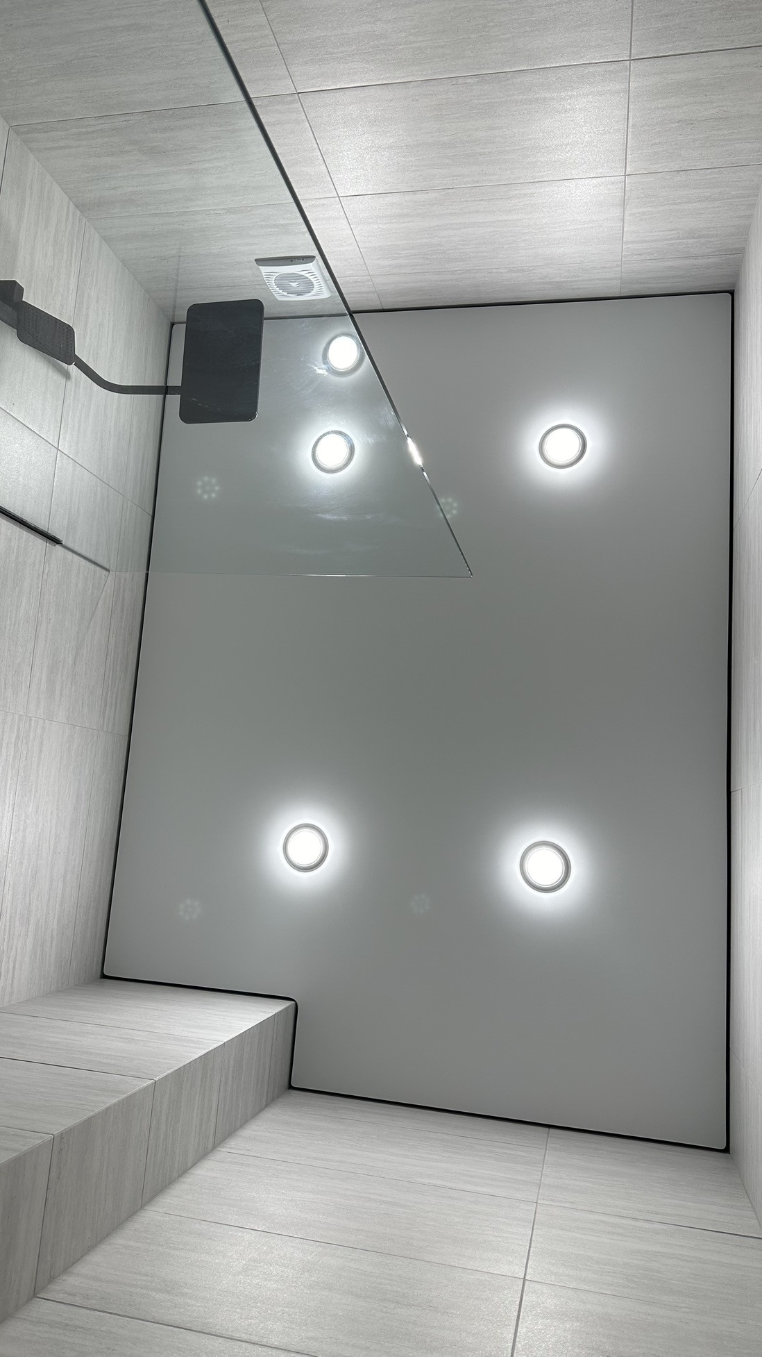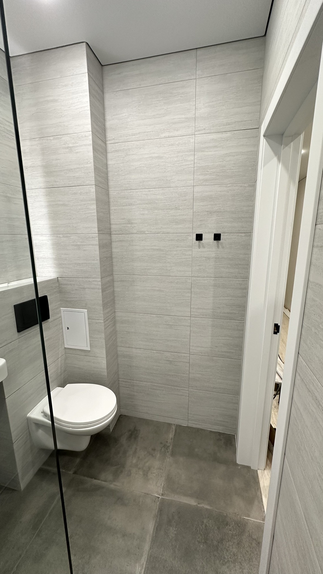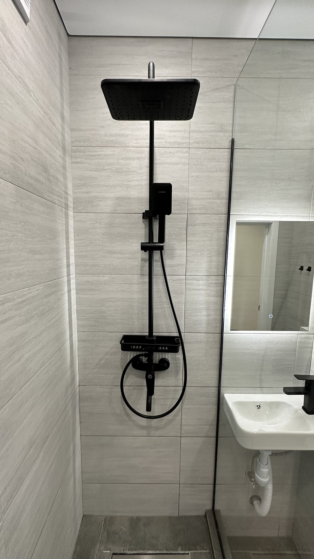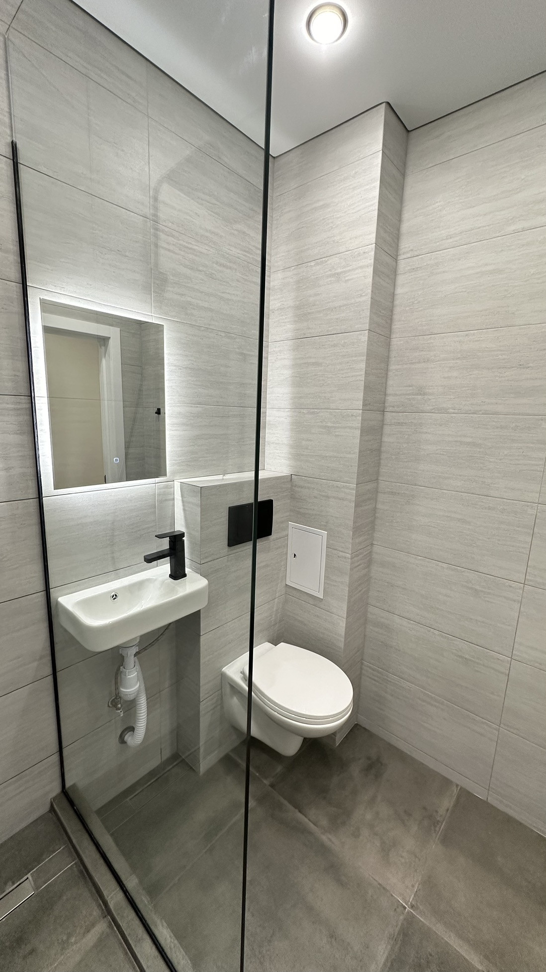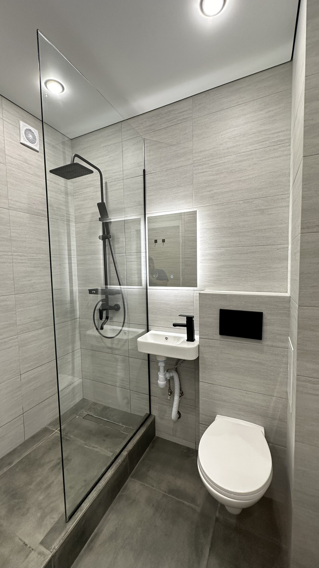 ✅ Сан узел покрыт керамогранитом. Все внешние углы выполнены стыковкой в 45 градусов. В сан узле обустроен трап и душевой поддон из керамогранита. Выполнена гидроизоляция. Теплый пол. Установлена инсталляция, душевая система с тропическим душем, зеркало с тремя режимами подсветки, подвесная раковина с накладным смесителем.