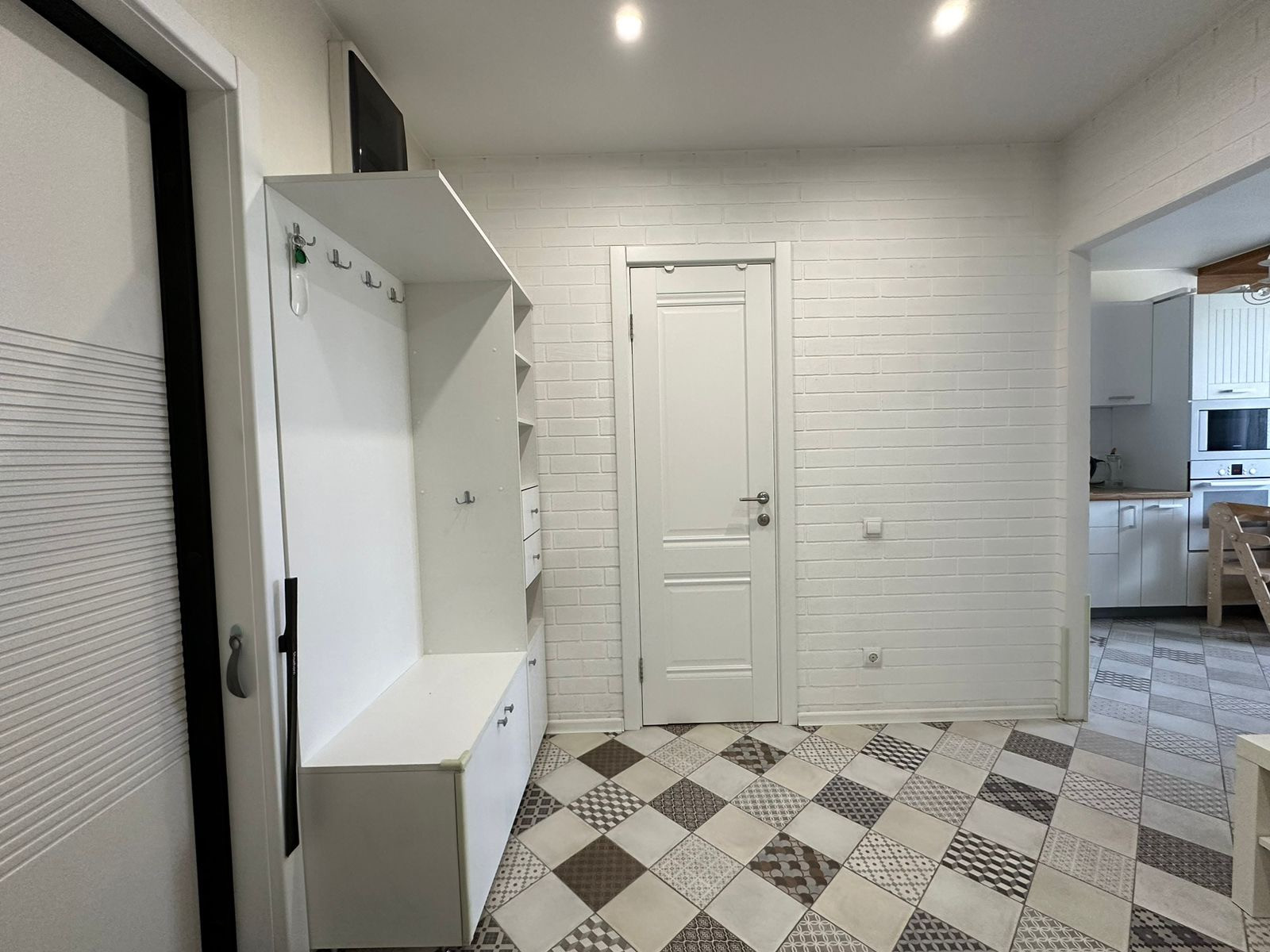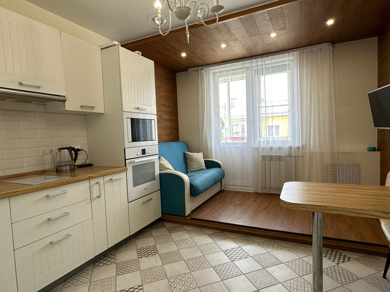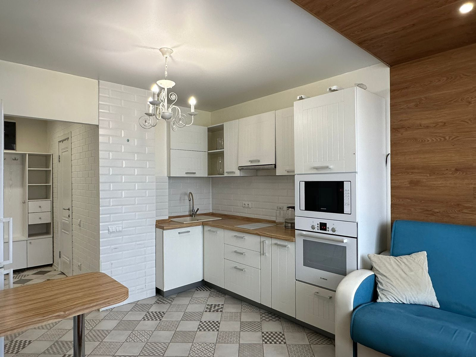 Встроенная кухня с техникой: духовой шкаф, варочная панель, вытяжка, микроволновая печь. В прихожей большой, вместительный встроенный шкаф-купе, балкон застеклённый. Установлены приборы учёта воды. Электросчётчик в квартире.