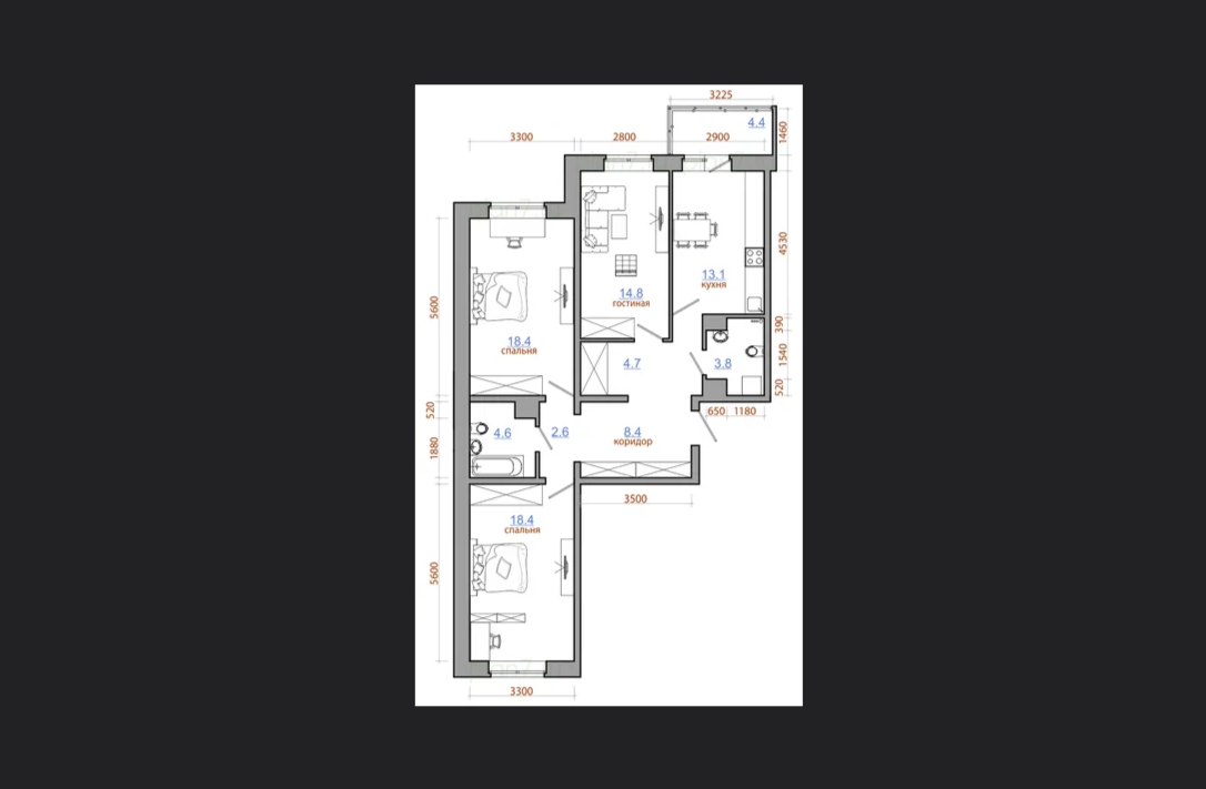 2.  три спальни 18, 18, 15 м2