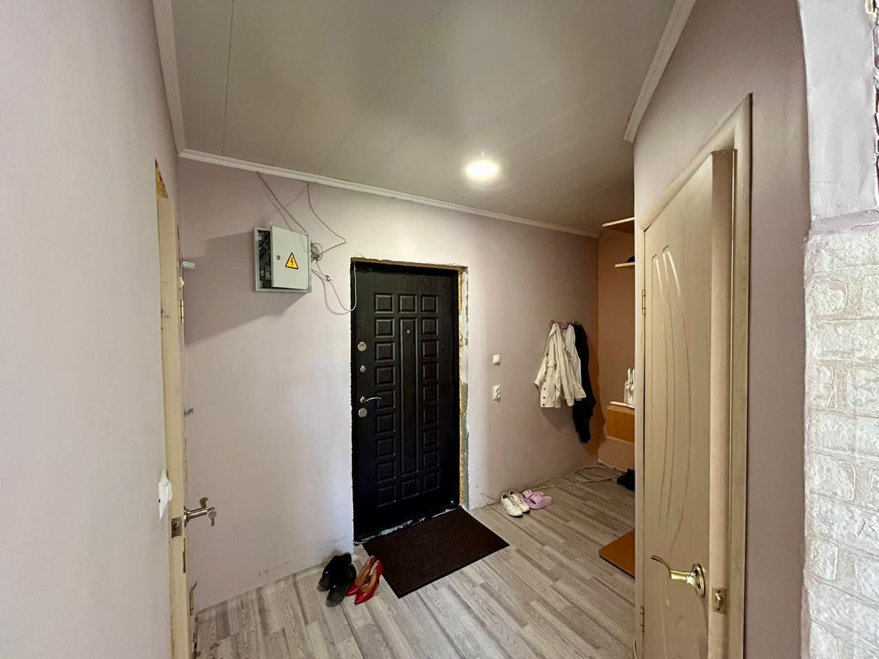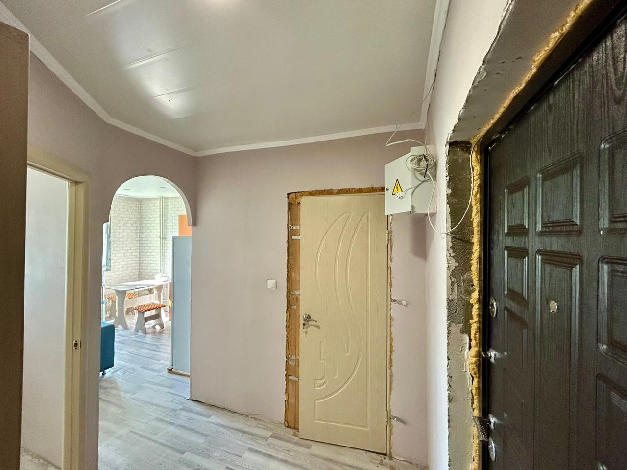 В квартире стены выровнены с обоями, установлен натяжной потолок, а также современные межкомнатная и входная двери.