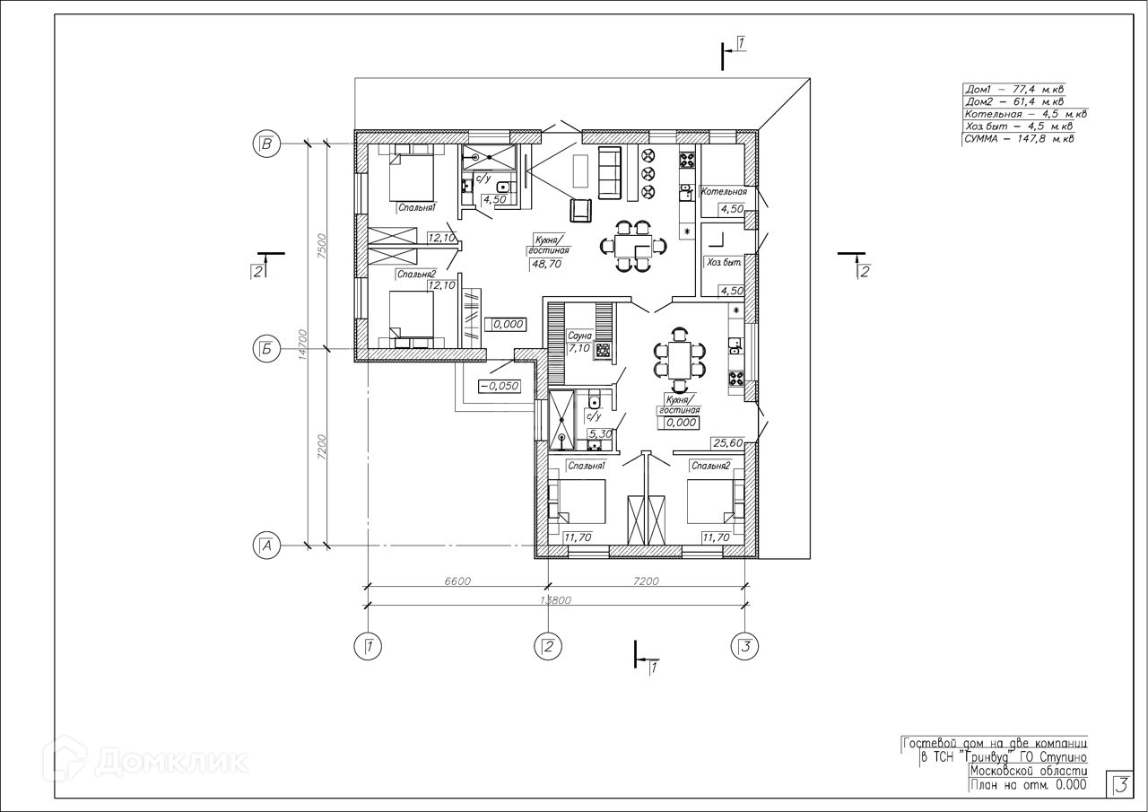 - 2 большие кухни-гостиные со встроенной кухонной мебелью (духовые шкафы 2 шт., газовые плиты 2 шт., 2 холодильника, стиральная машины).