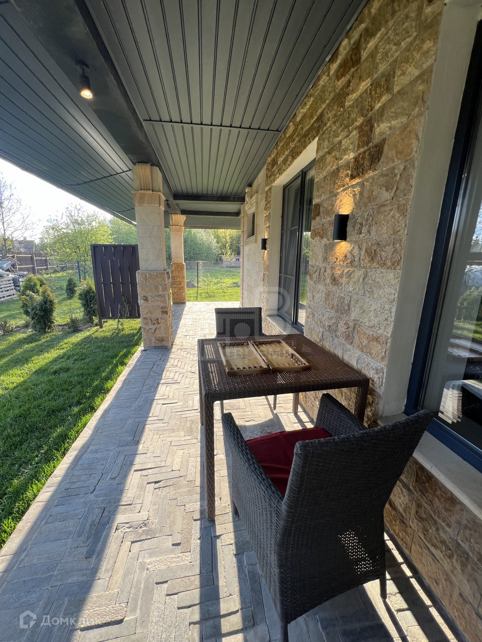 Ухоженный земельный участок при доме площадью 700 кв.м. полностью застлан рулонным газоном, по периметру с соседом высажены туи, декоративными деревья и кустарники.