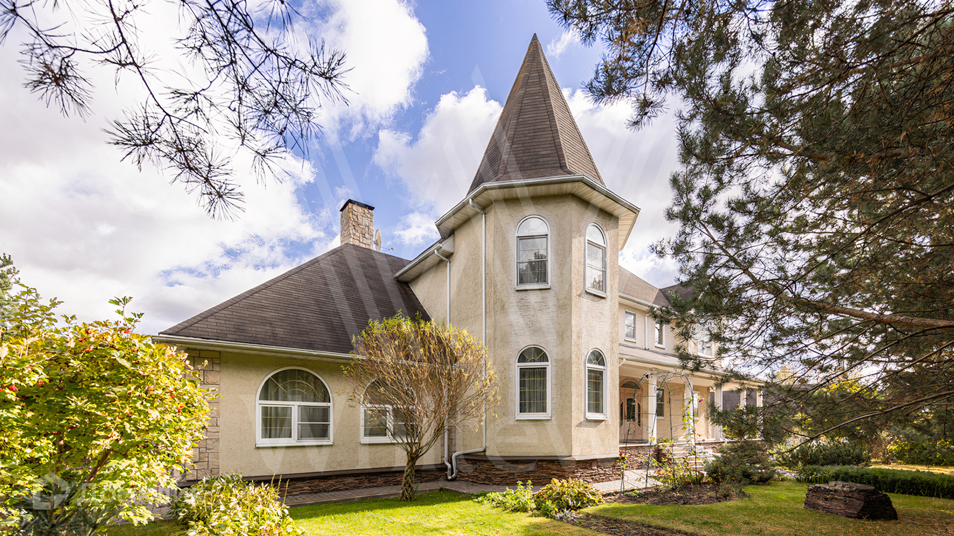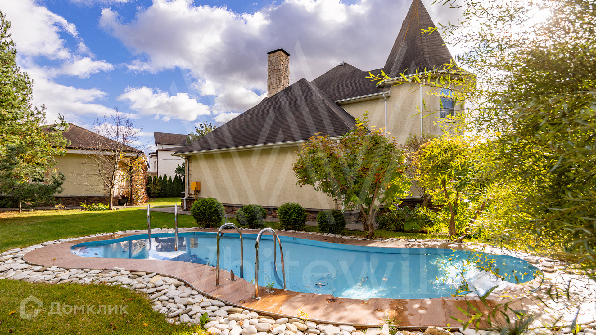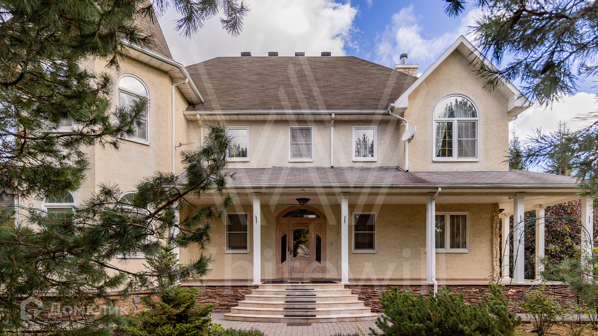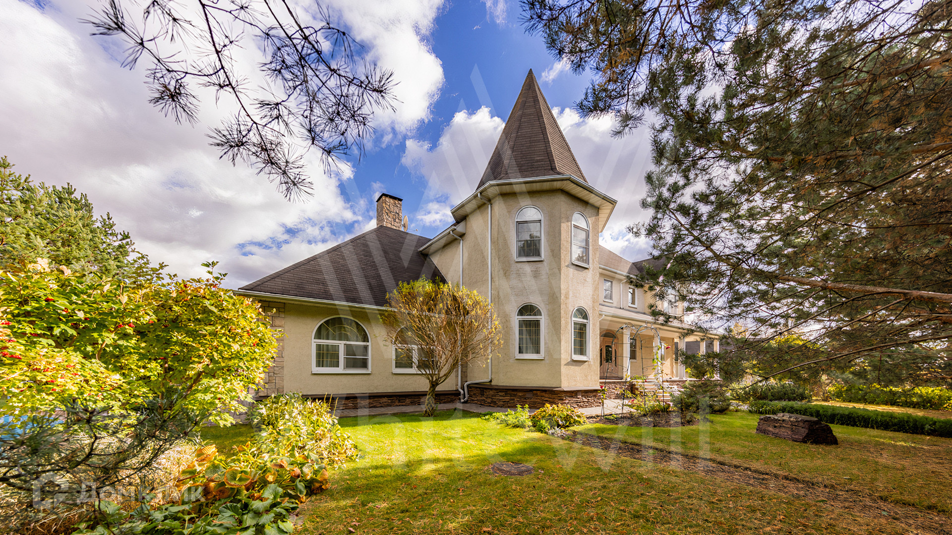 ID 11 845. Княжье Озеро. Загородный дом площадью 350 м² расположен на полевом участке 20 соток с видом на озеро. Фасад здания выполнен в европейском стиле и облицован бежевой штукатуркой. В отделке интерьера использованы теплые оттенки, создающие атмосферу уюта. В доме разместили 4 спальни, гостиную с камином, кухню-столовую, кабинет, зимний сад и домашний кинотеатр. Рядом построены гараж на 2 машины и домик для персонала. На участке выполнен ландшафтный дизайн и обустроен уличный бассейн.