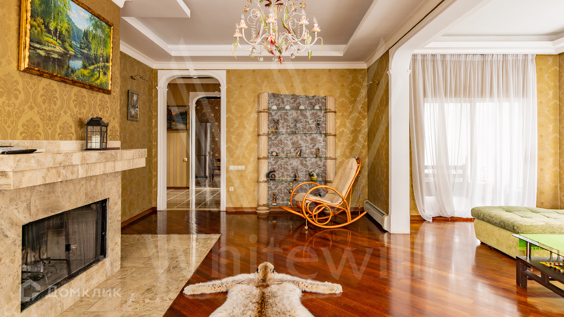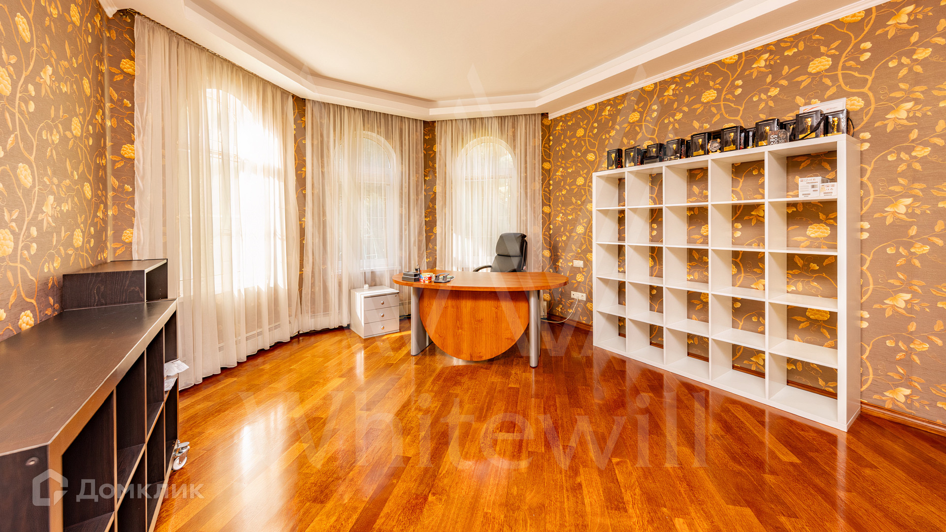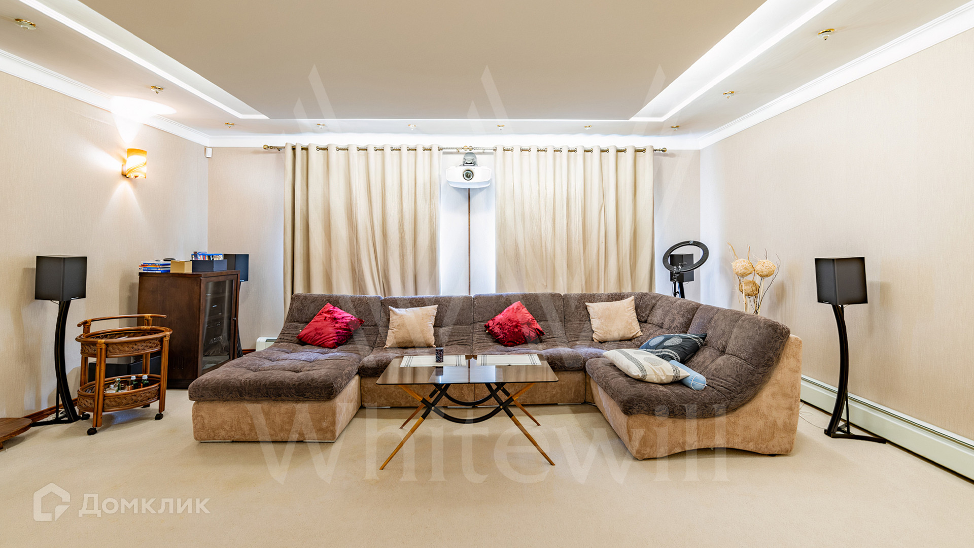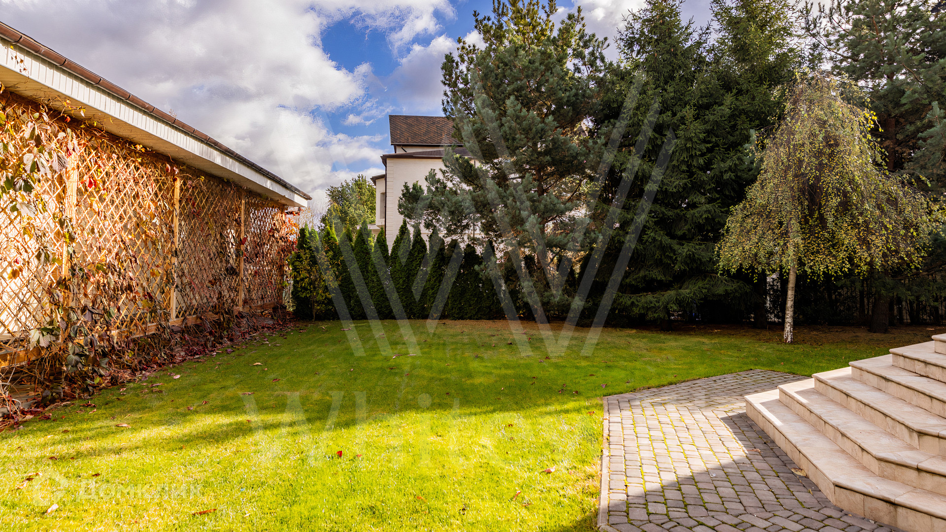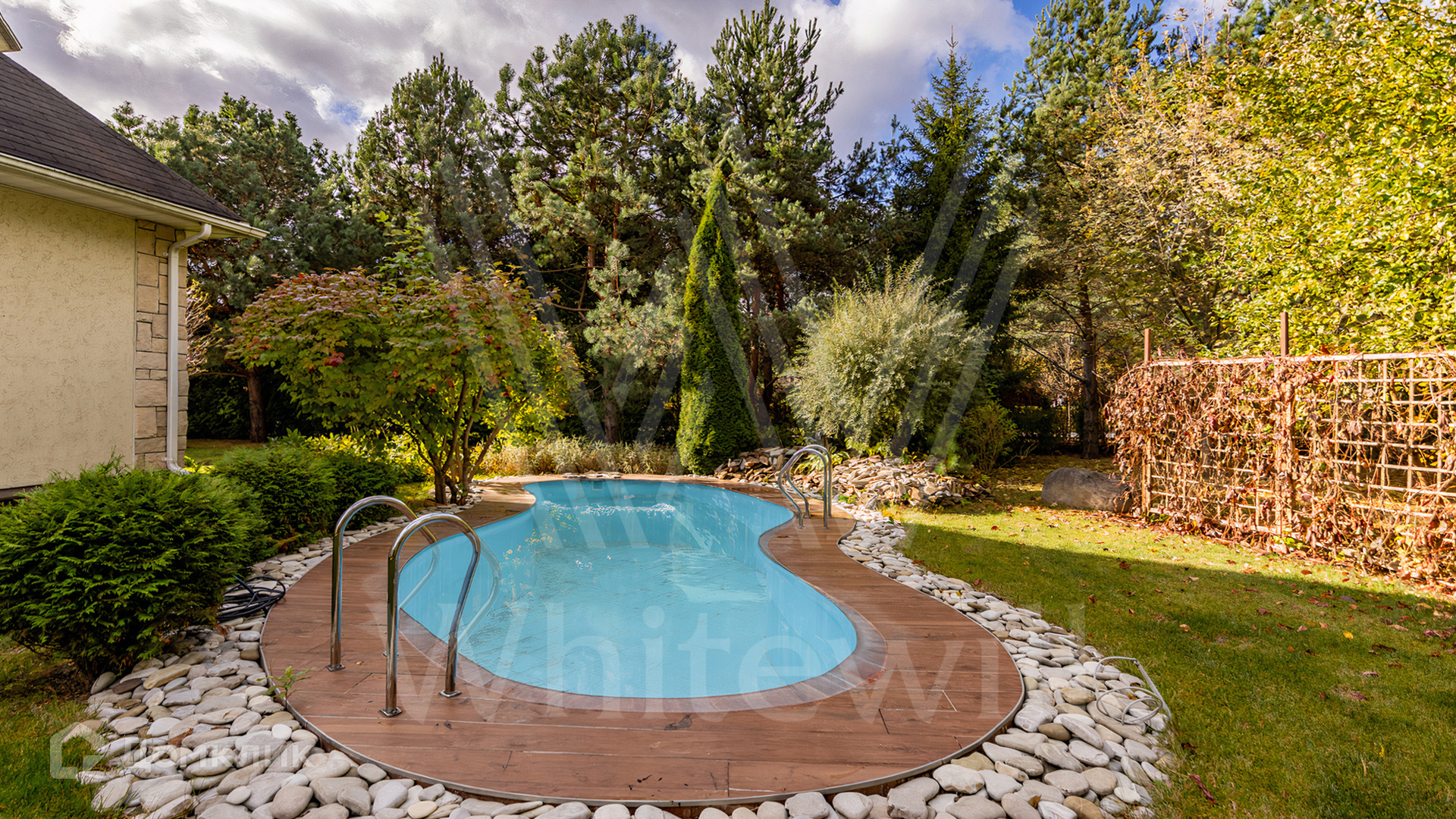 ID 11 845. Княжье Озеро. Загородный дом площадью 350 м² расположен на полевом участке 20 соток с видом на озеро. Фасад здания выполнен в европейском стиле и облицован бежевой штукатуркой. В отделке интерьера использованы теплые оттенки, создающие атмосферу уюта. В доме разместили 4 спальни, гостиную с камином, кухню-столовую, кабинет, зимний сад и домашний кинотеатр. Рядом построены гараж на 2 машины и домик для персонала. На участке выполнен ландшафтный дизайн и обустроен уличный бассейн.