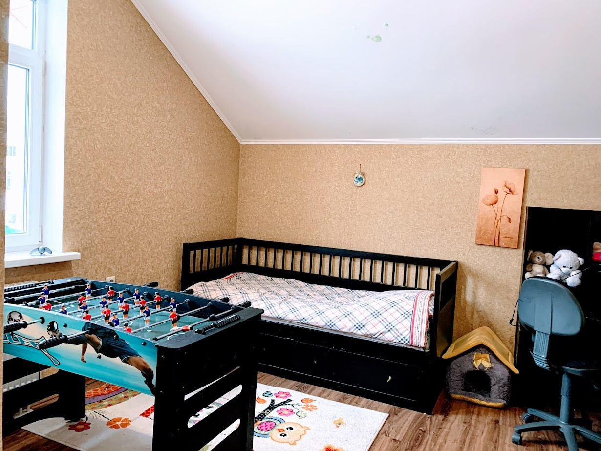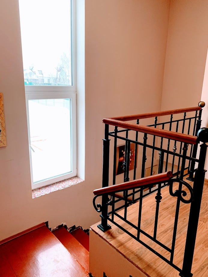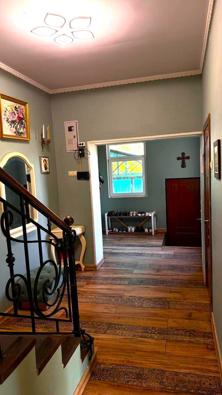 Коммуникации центральные, газ, бойлерная. К дому пристроен гараж и навес под машины с отдельным входом и воротами. На первом этаже расположена кухня, гостиная , комната и санузел с ванной. На втором этаже 5 комнат и 1 санузел совмещен (душ,туалет).