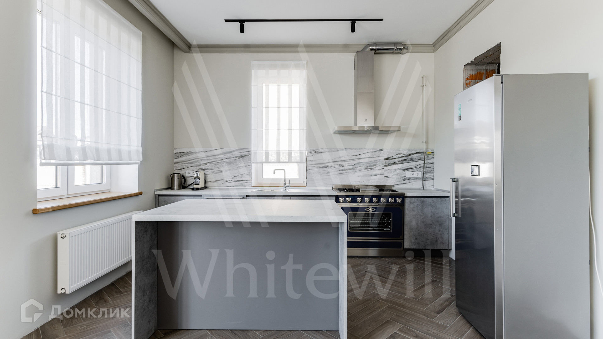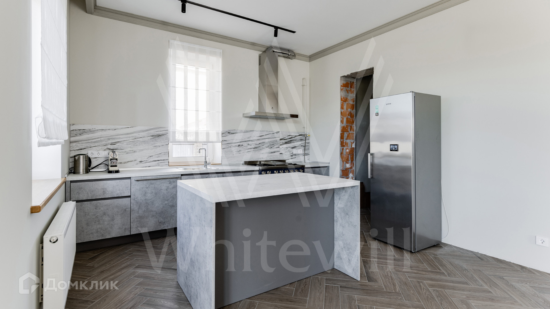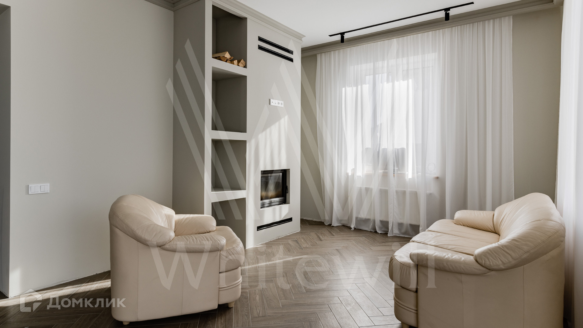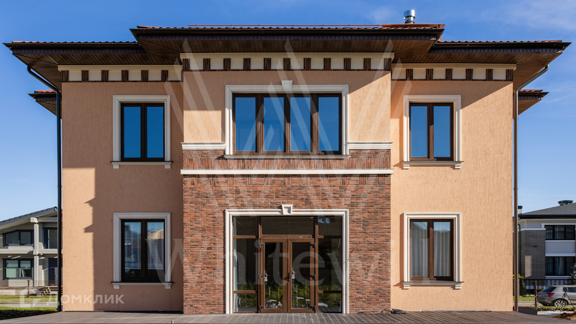 ID 11 920. Новорижский. Загородный дом площадью 311 м² построен на полевом участке 13 соток в дальней части поселка. Фасад здания облицован песочно-розовой штукатуркой, декорирован красно-коричневой плиткой и белыми наличниками. В отделке светлого лаконичного интерьера использованы бежево-серые оттенки, фактура дерева и камня. Планировкой предусмотрены 4 спальни, гостиная с дровяным камином, просторная кухня-столовая, кабинет и сауна. На участке можно выполнить ландшафтный дизайн и обустроить беседку с зоной барбекю.