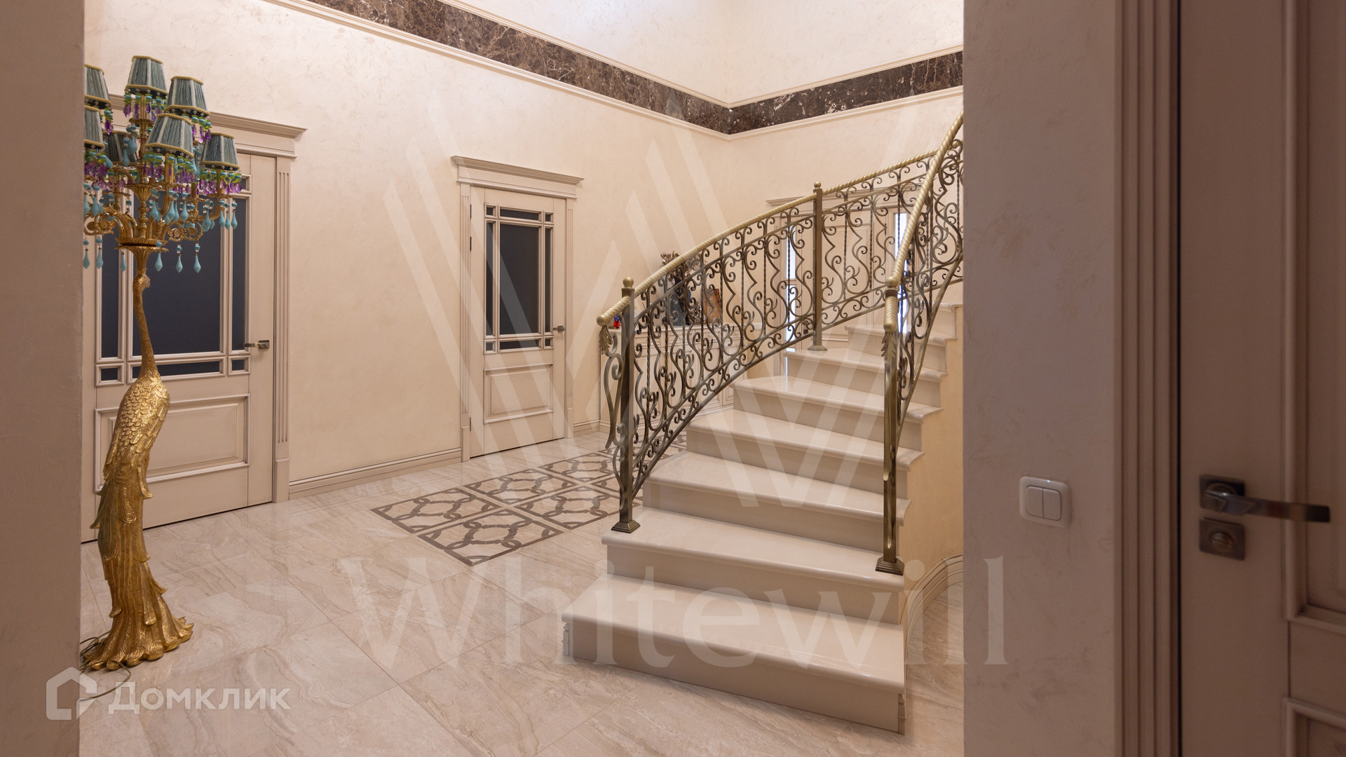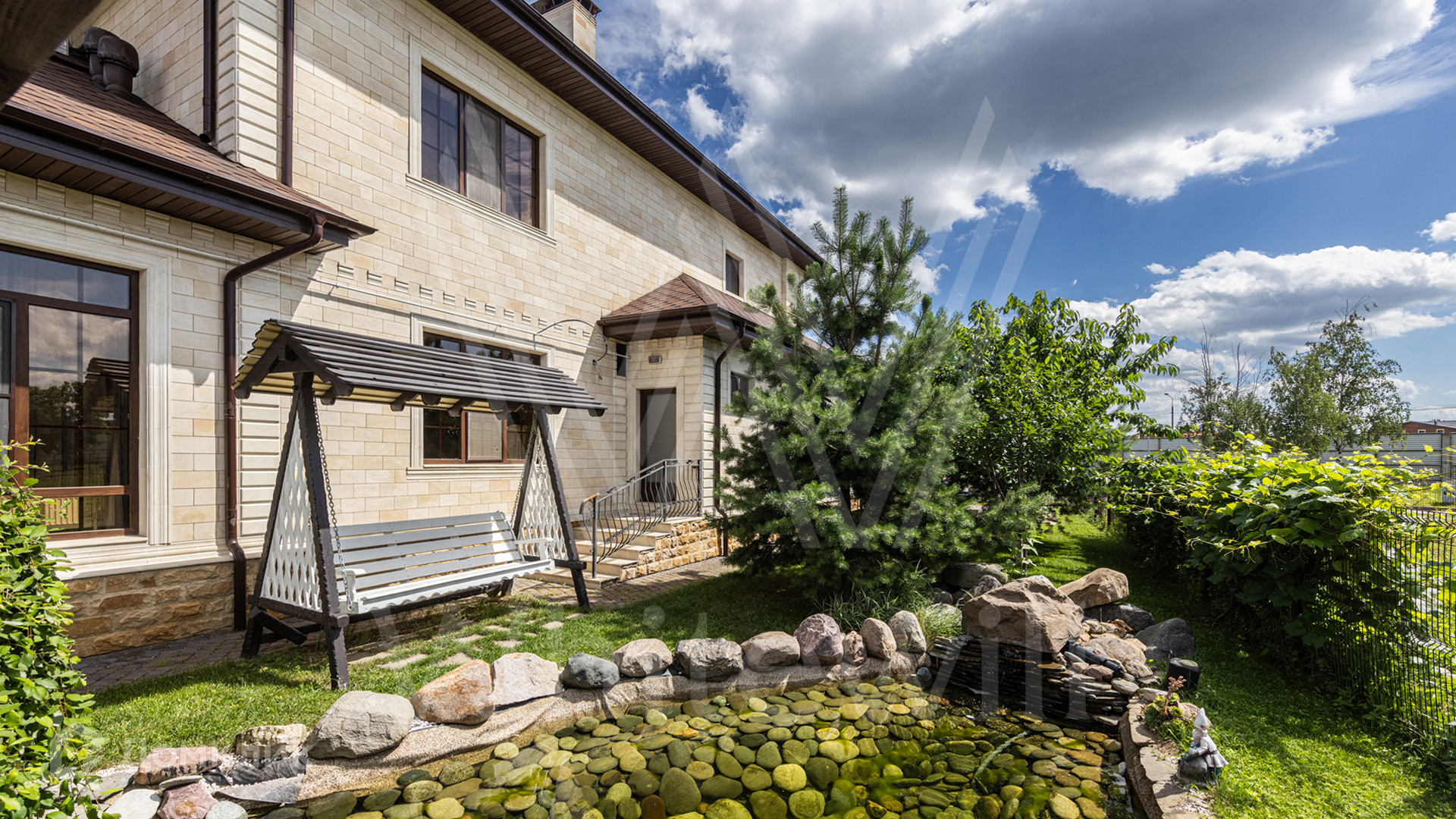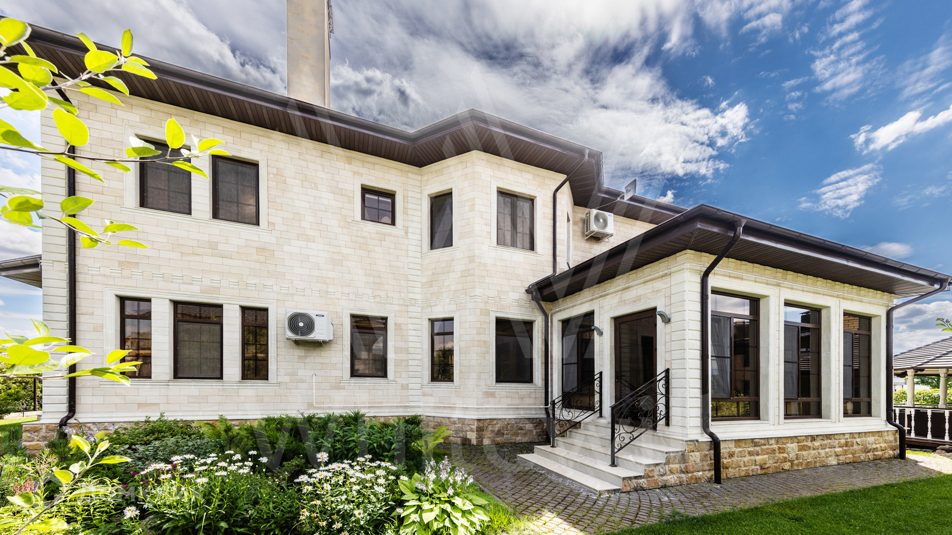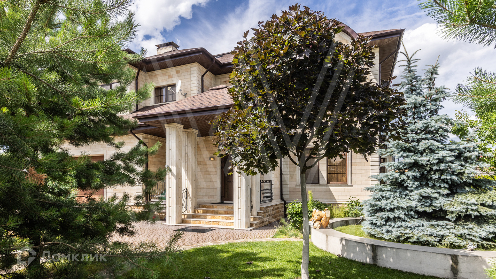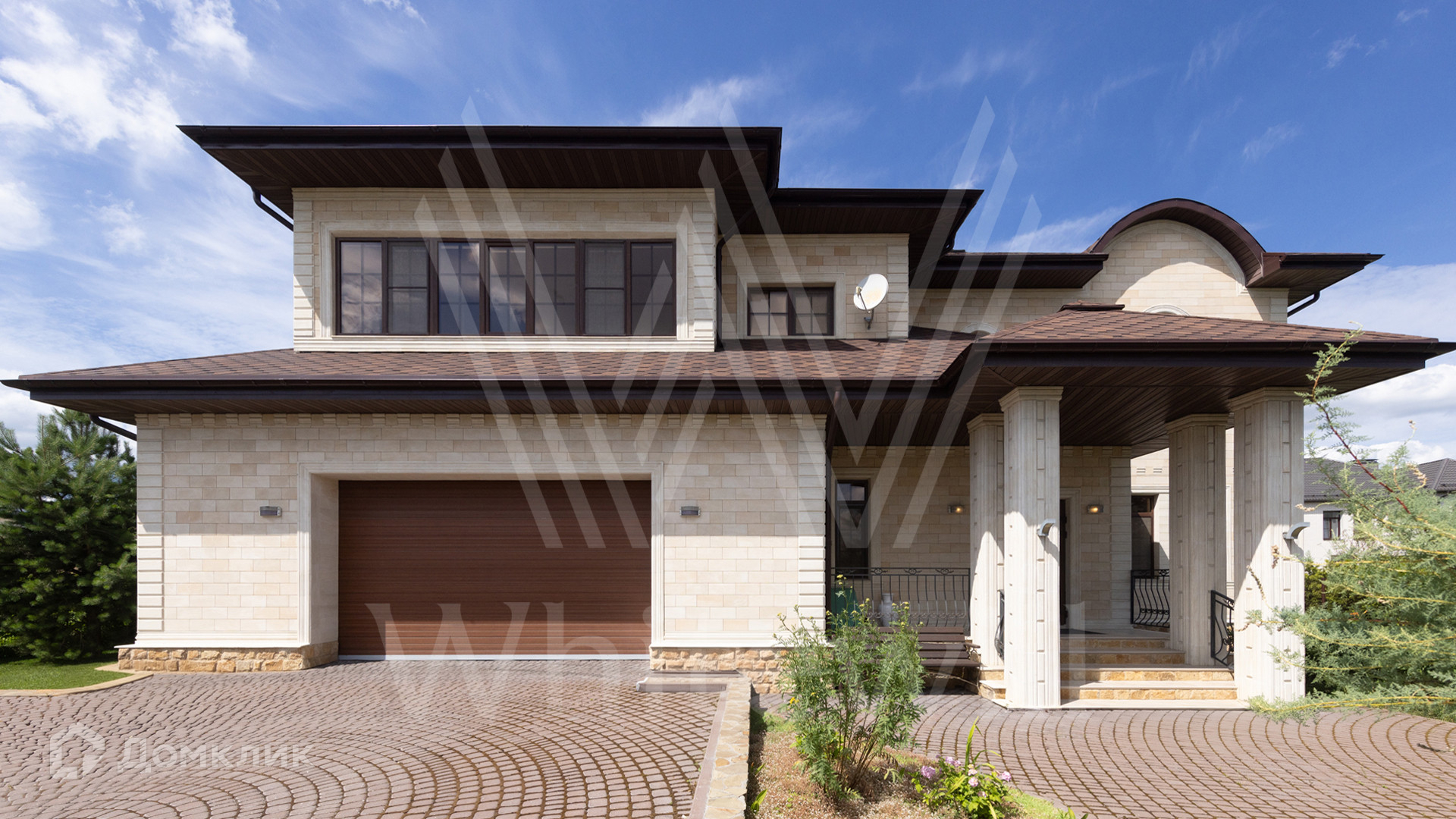 ID 12 539. Новорижский. Загородный дом площадью 368 м² построен на полевом участке 11 соток. Фасад здания облицован бежевым клинкером, декорирован колоннами и коваными элементами. В отделке интерьера в классическом стиле использованы теплые оттенки, орнаменты, ковка. Планировка резиденции включает 4 спальни, гостиную с действующим дровяным камином и домашним кинотеатром, кухню-столовую, зимний сад, комнату отдыха, сауну и бассейн. В контуре дома предусмотрен гараж на 2 машины. На участке выполнен ландшафтный дизайн и вымощена площадка перед домом.