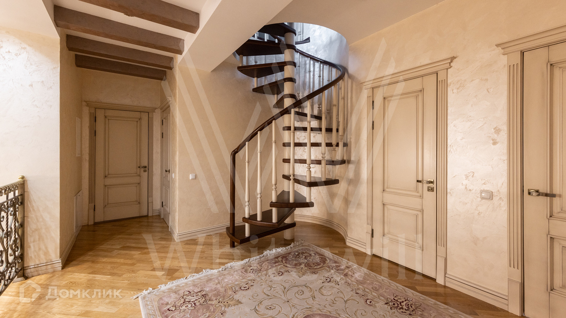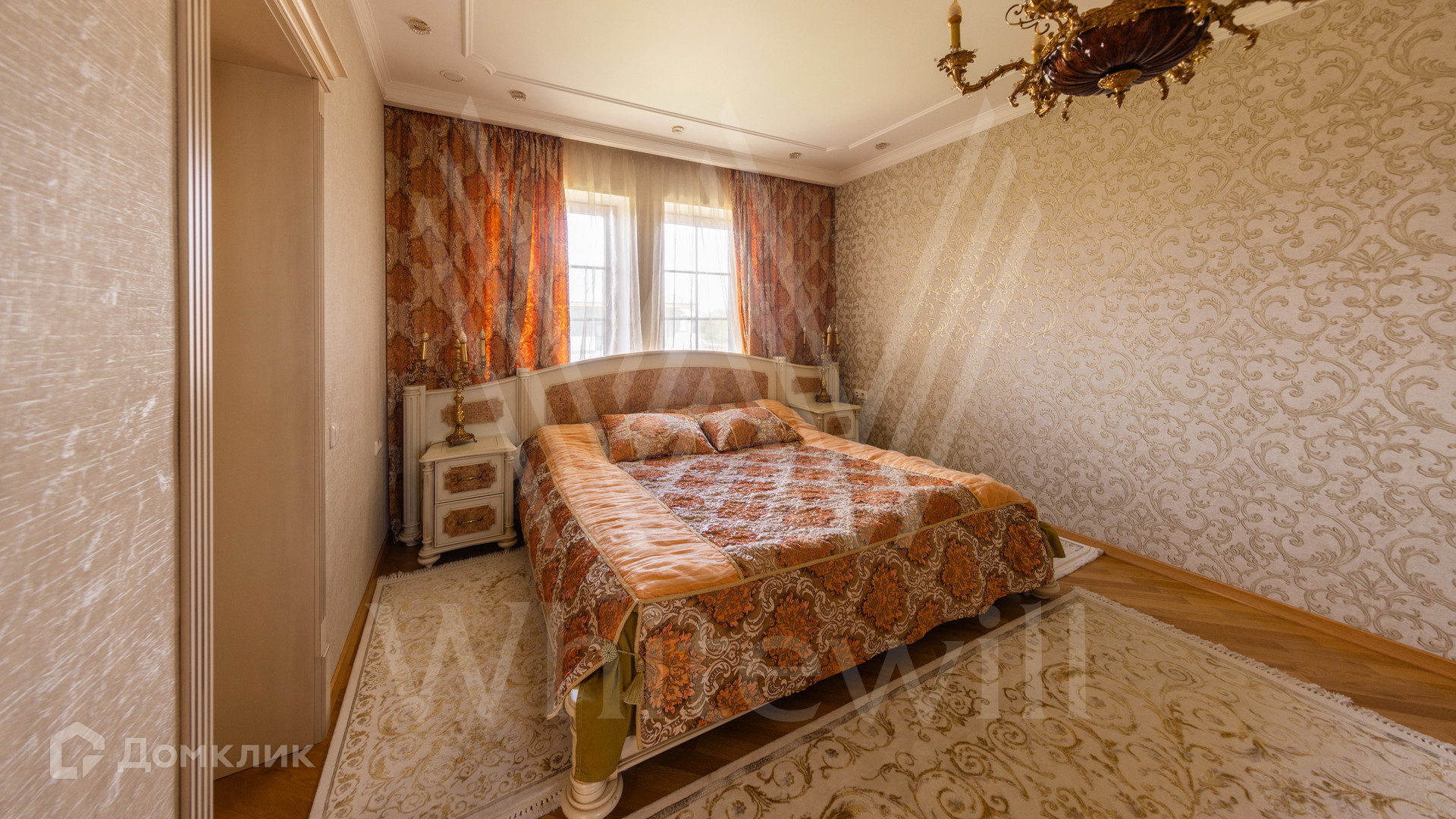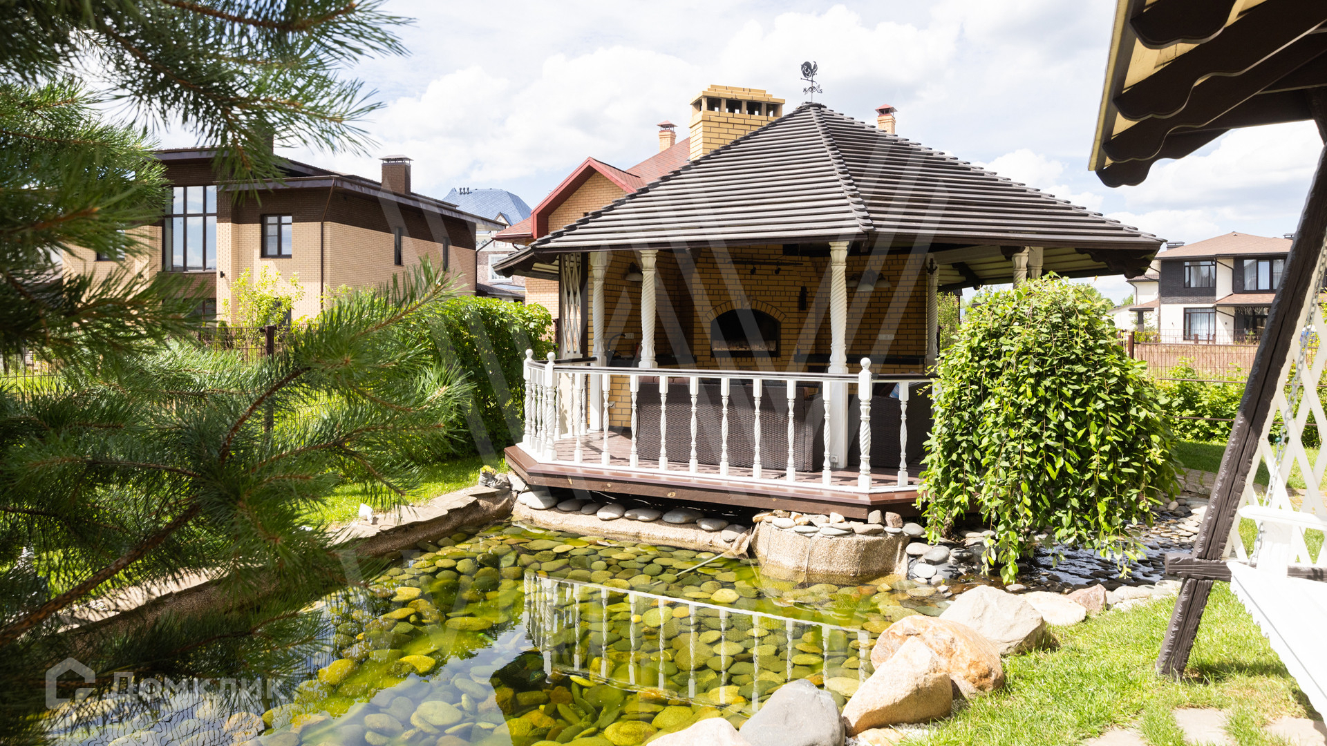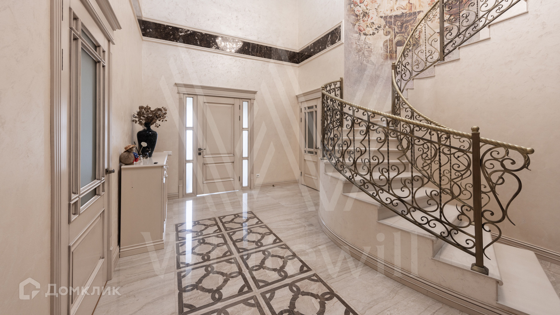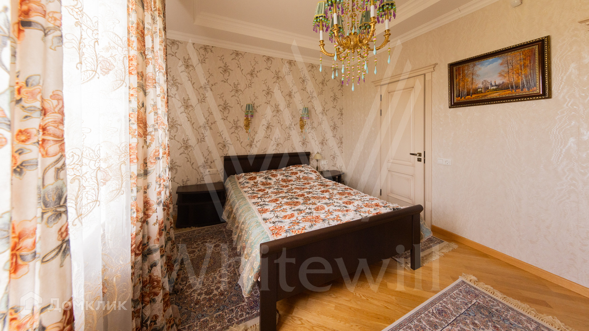 ID 12 539. Новорижский. Загородный дом площадью 368 м² построен на полевом участке 11 соток. Фасад здания облицован бежевым клинкером, декорирован колоннами и коваными элементами. В отделке интерьера в классическом стиле использованы теплые оттенки, орнаменты, ковка. Планировка резиденции включает 4 спальни, гостиную с действующим дровяным камином и домашним кинотеатром, кухню-столовую, зимний сад, комнату отдыха, сауну и бассейн. В контуре дома предусмотрен гараж на 2 машины. На участке выполнен ландшафтный дизайн и вымощена площадка перед домом.