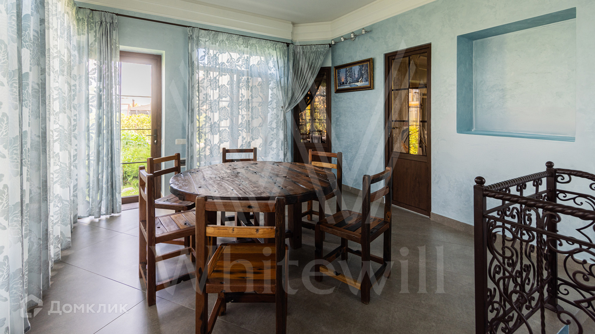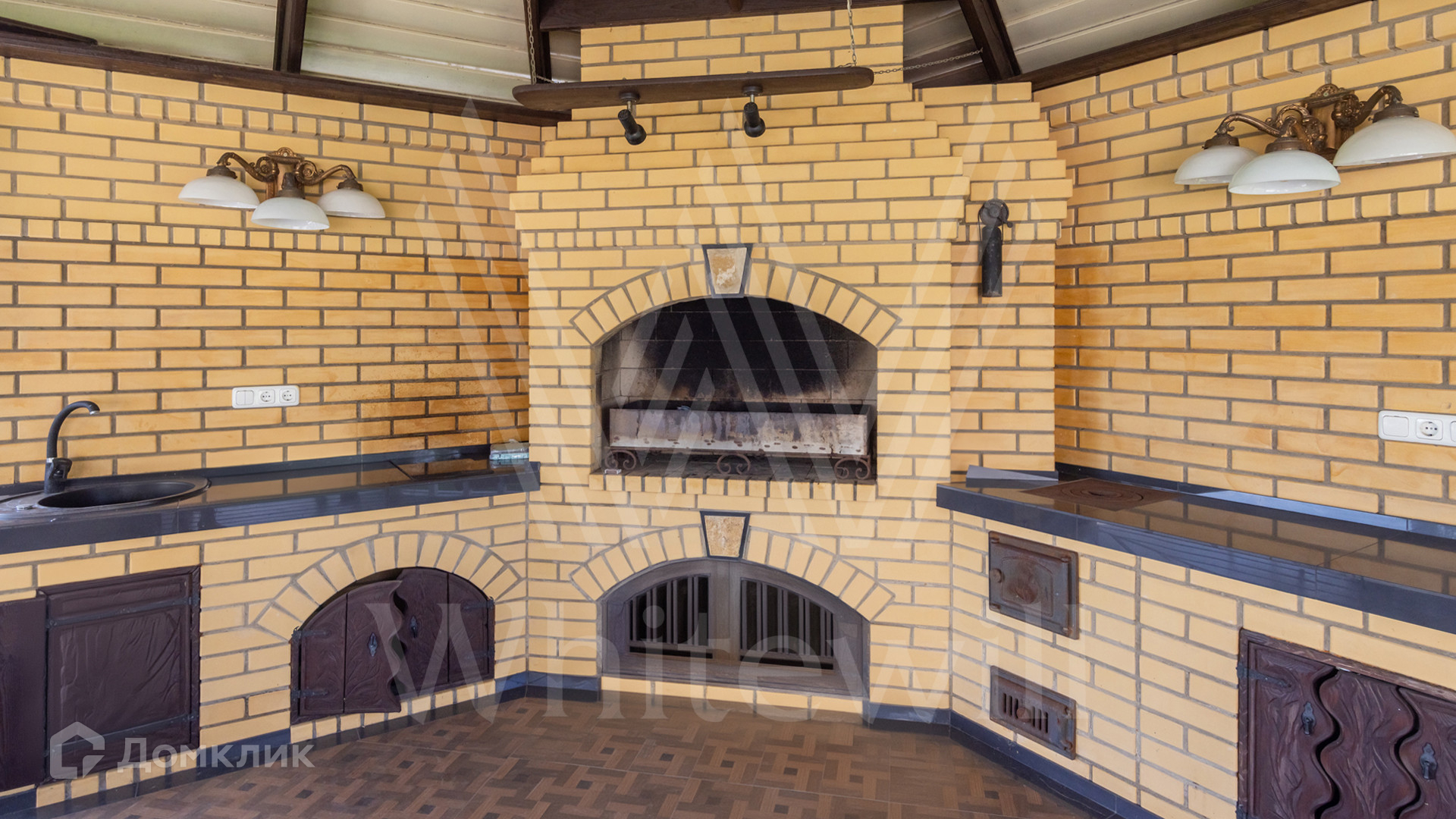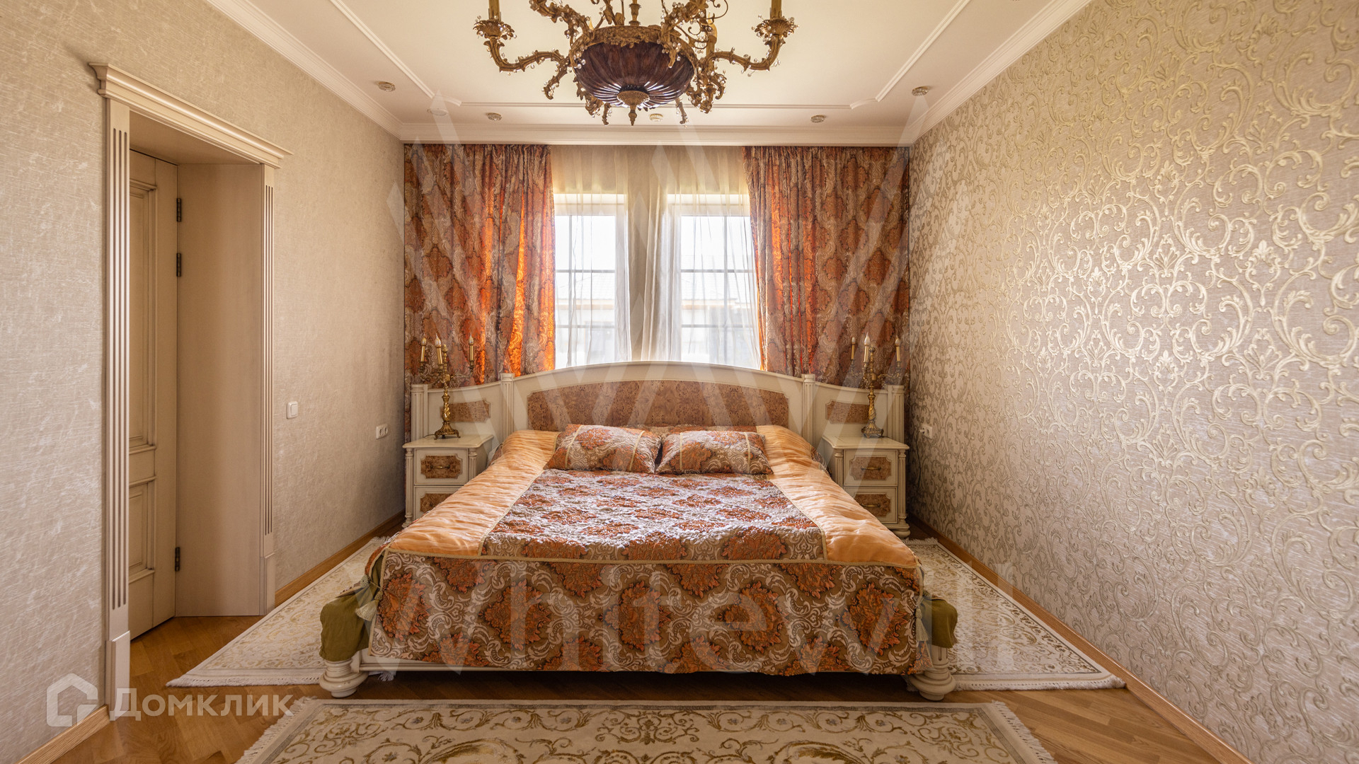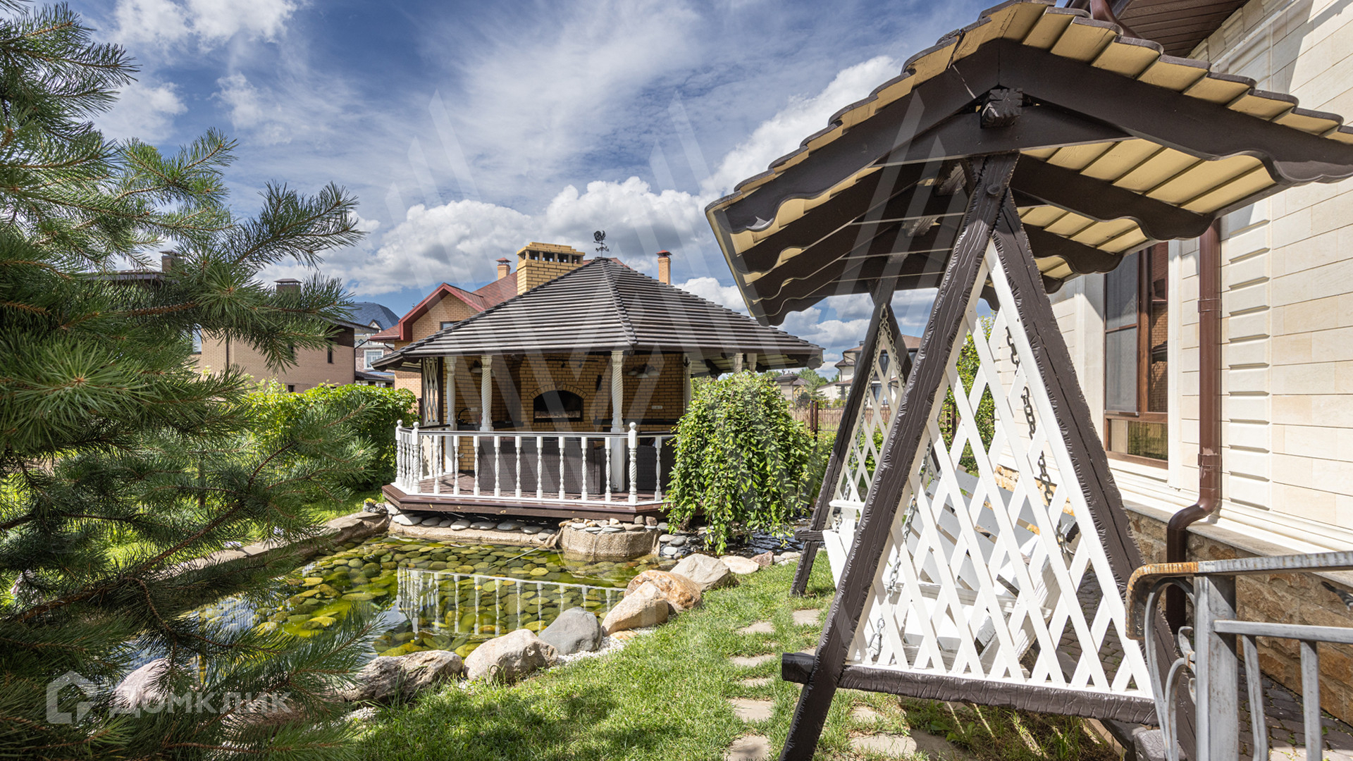 ID 12 539. Новорижский. Загородный дом площадью 368 м² построен на полевом участке 11 соток. Фасад здания облицован бежевым клинкером, декорирован колоннами и коваными элементами. В отделке интерьера в классическом стиле использованы теплые оттенки, орнаменты, ковка. Планировка резиденции включает 4 спальни, гостиную с действующим дровяным камином и домашним кинотеатром, кухню-столовую, зимний сад, комнату отдыха, сауну и бассейн. В контуре дома предусмотрен гараж на 2 машины. На участке выполнен ландшафтный дизайн и вымощена площадка перед домом.
