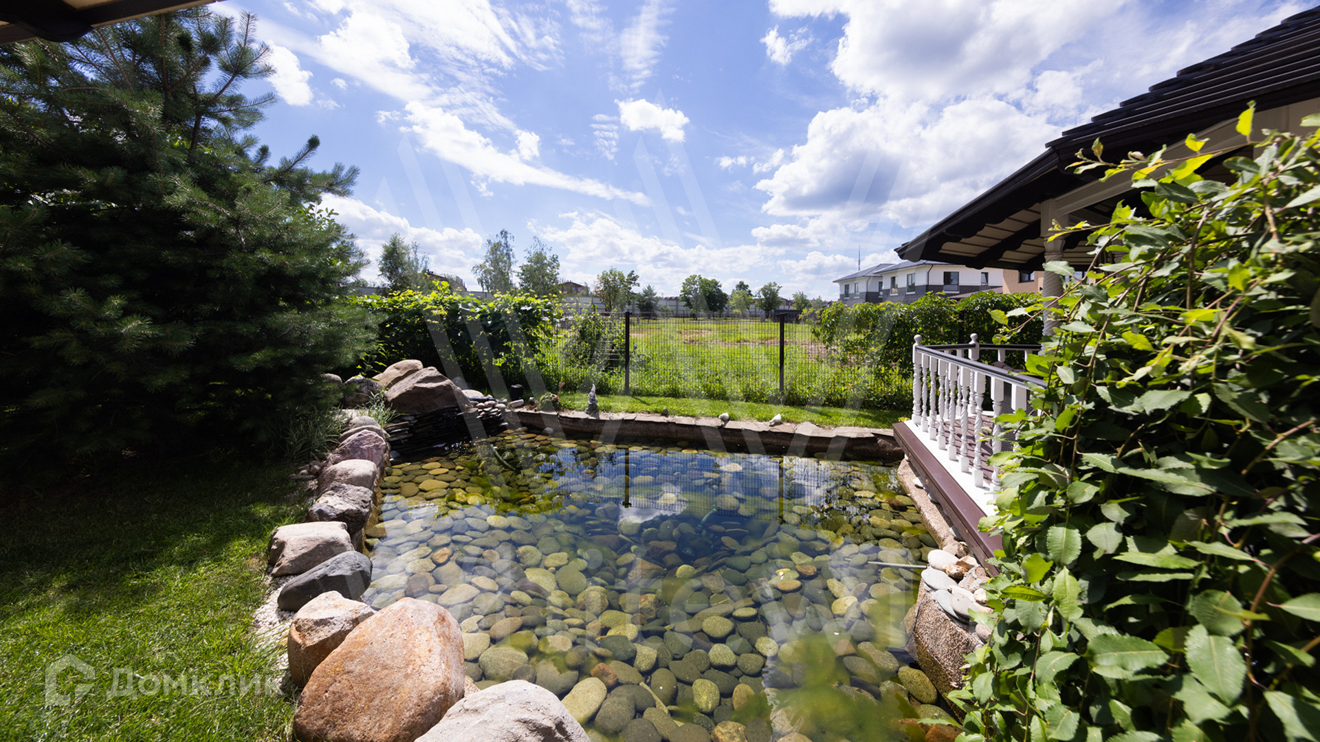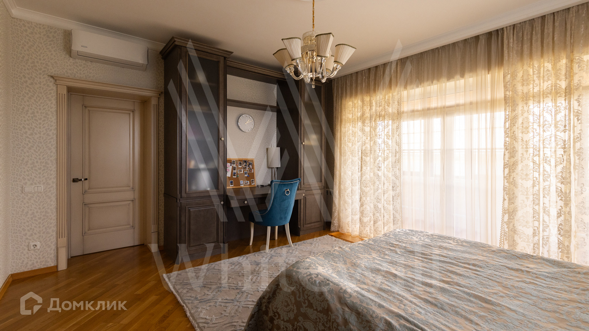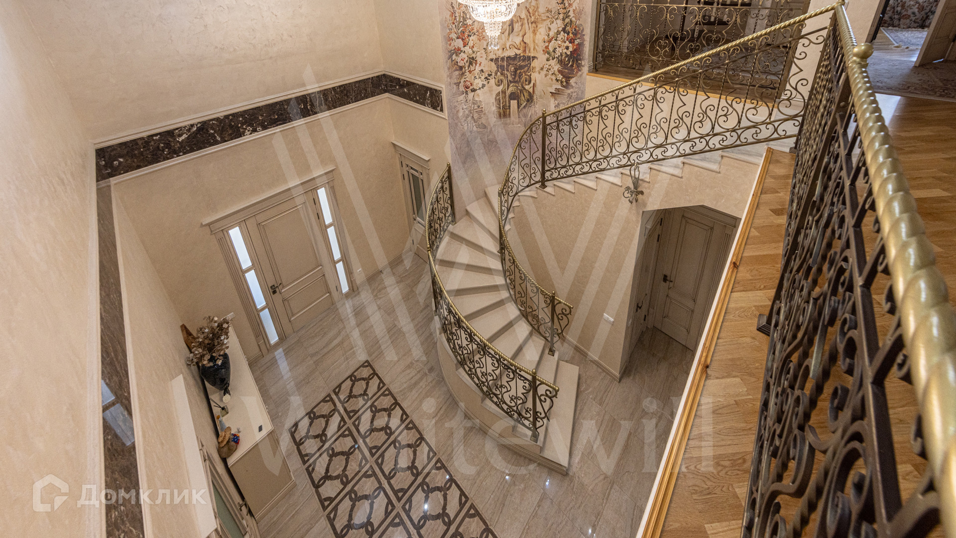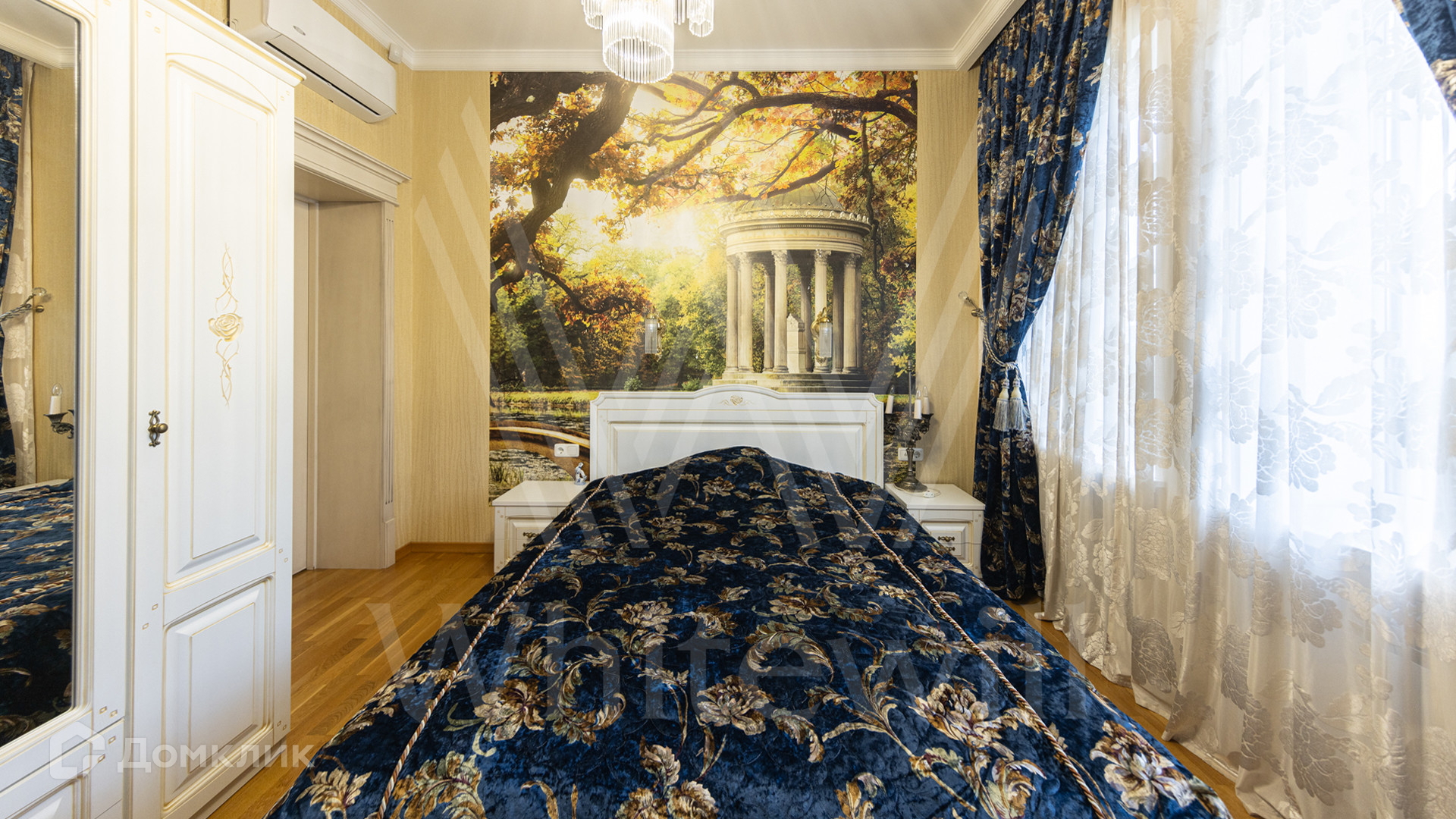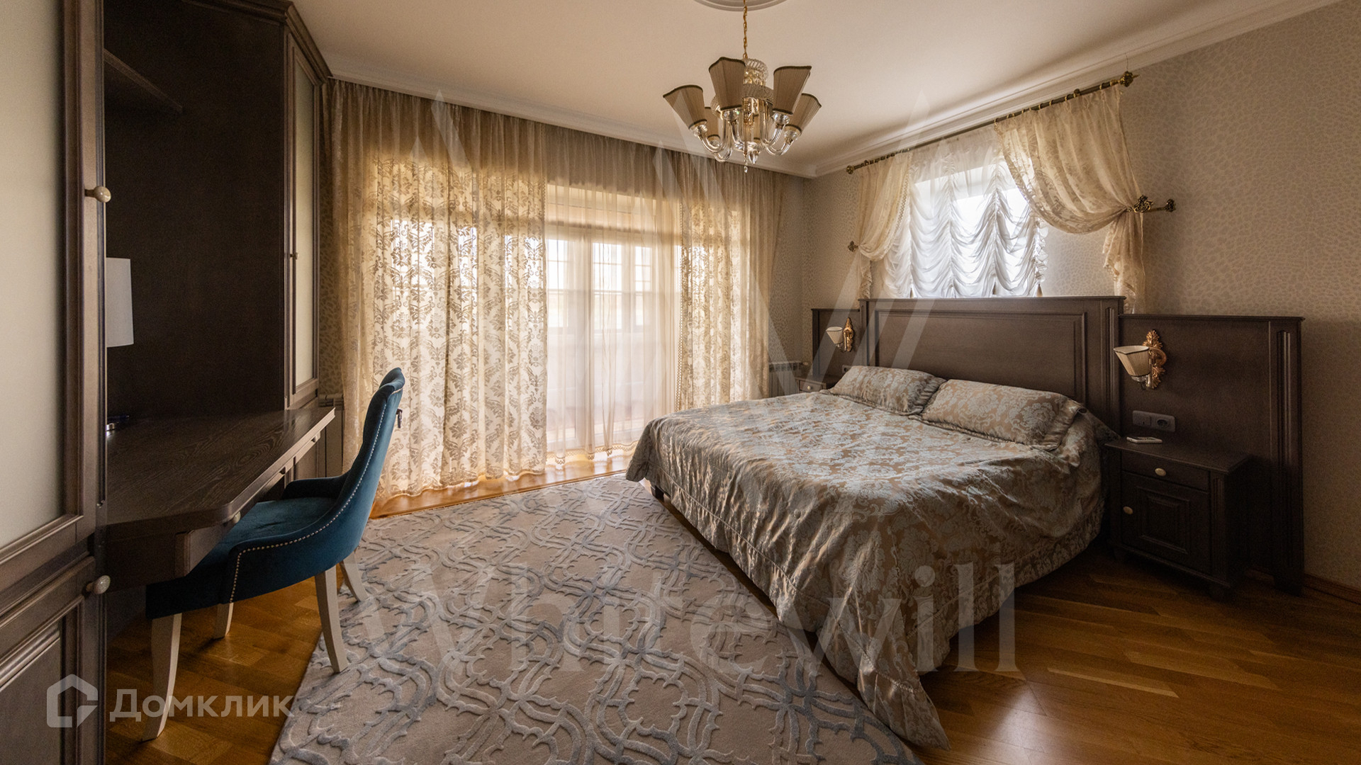 ID 12 539. Новорижский. Загородный дом площадью 368 м² построен на полевом участке 11 соток. Фасад здания облицован бежевым клинкером, декорирован колоннами и коваными элементами. В отделке интерьера в классическом стиле использованы теплые оттенки, орнаменты, ковка. Планировка резиденции включает 4 спальни, гостиную с действующим дровяным камином и домашним кинотеатром, кухню-столовую, зимний сад, комнату отдыха, сауну и бассейн. В контуре дома предусмотрен гараж на 2 машины. На участке выполнен ландшафтный дизайн и вымощена площадка перед домом.