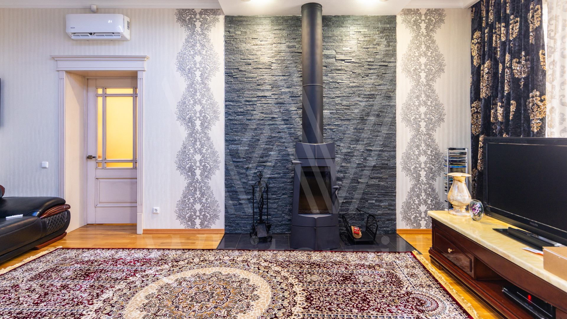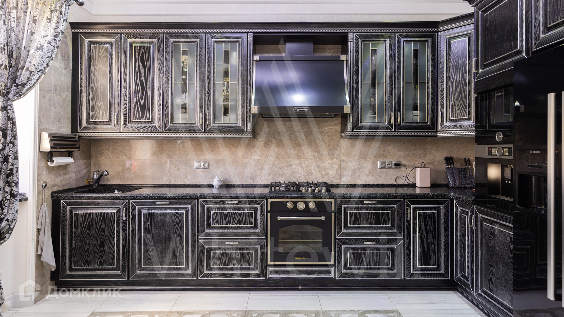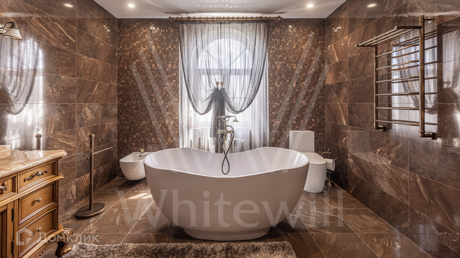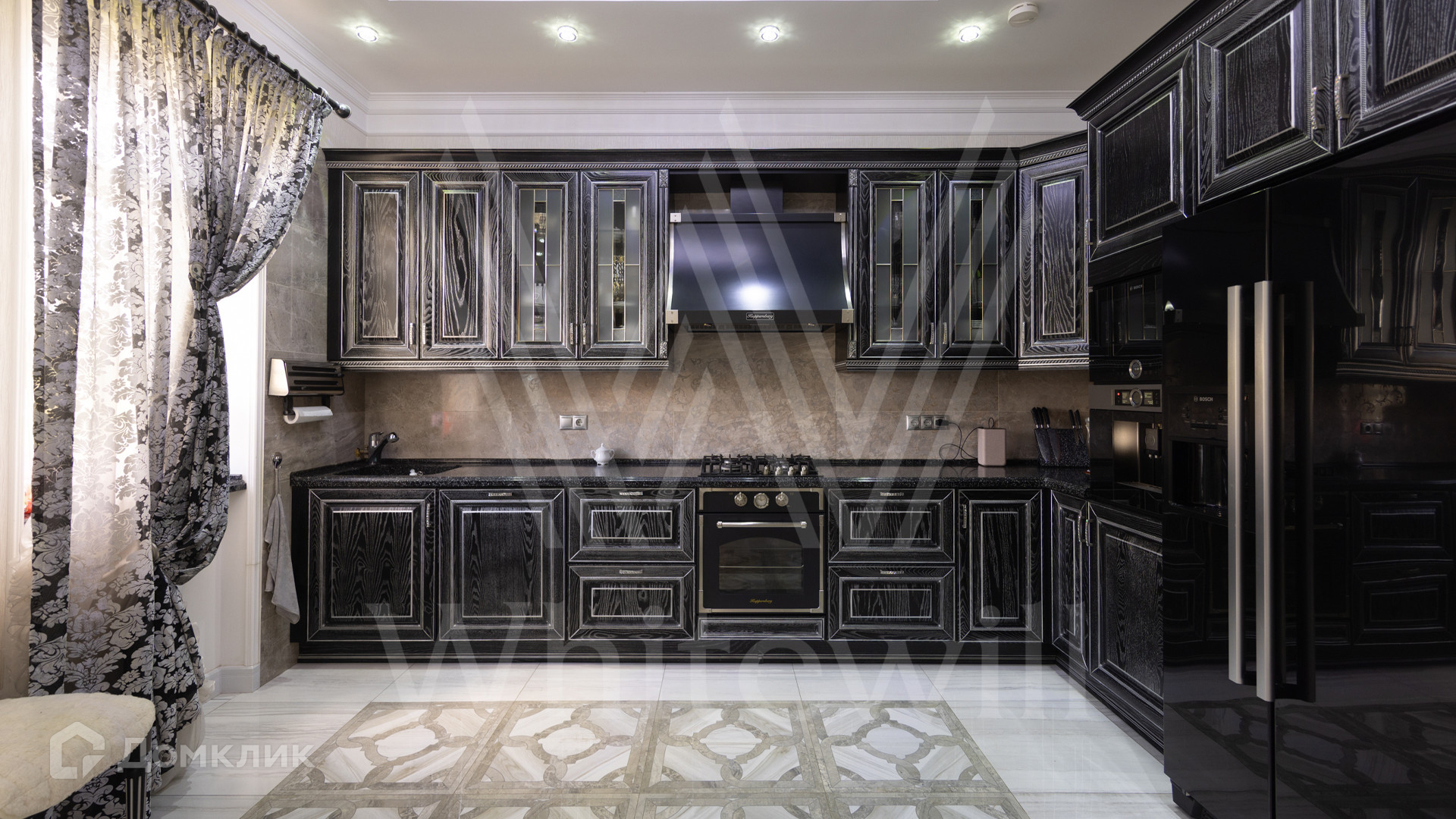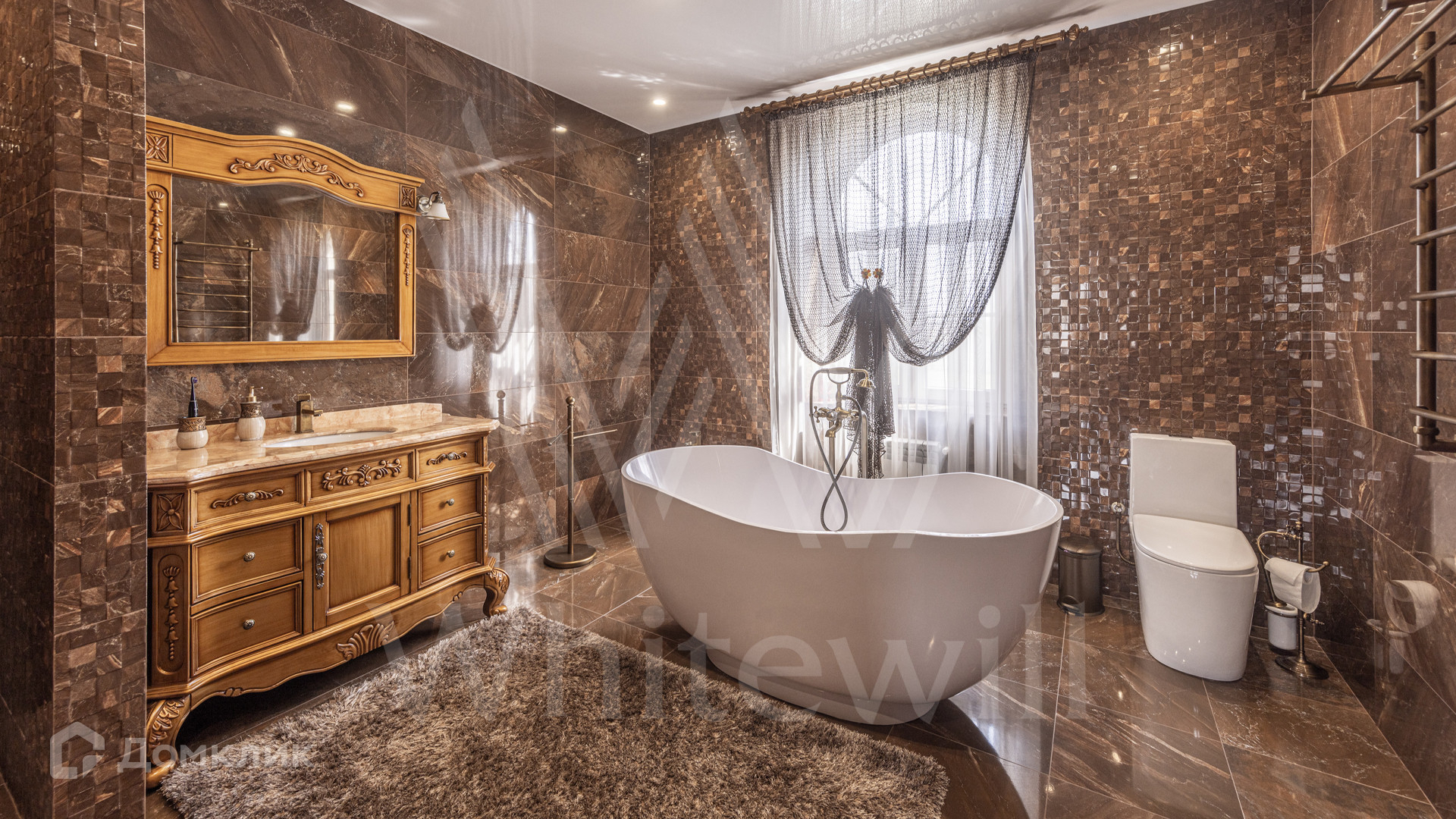 ID 12 539. Новорижский. Загородный дом площадью 368 м² построен на полевом участке 11 соток. Фасад здания облицован бежевым клинкером, декорирован колоннами и коваными элементами. В отделке интерьера в классическом стиле использованы теплые оттенки, орнаменты, ковка. Планировка резиденции включает 4 спальни, гостиную с действующим дровяным камином и домашним кинотеатром, кухню-столовую, зимний сад, комнату отдыха, сауну и бассейн. В контуре дома предусмотрен гараж на 2 машины. На участке выполнен ландшафтный дизайн и вымощена площадка перед домом.