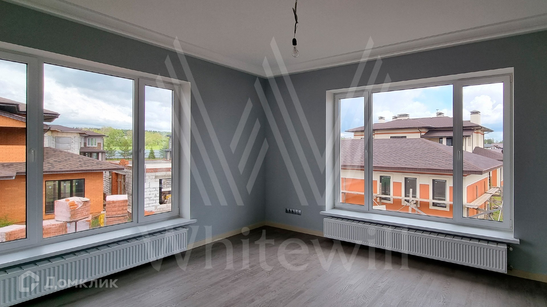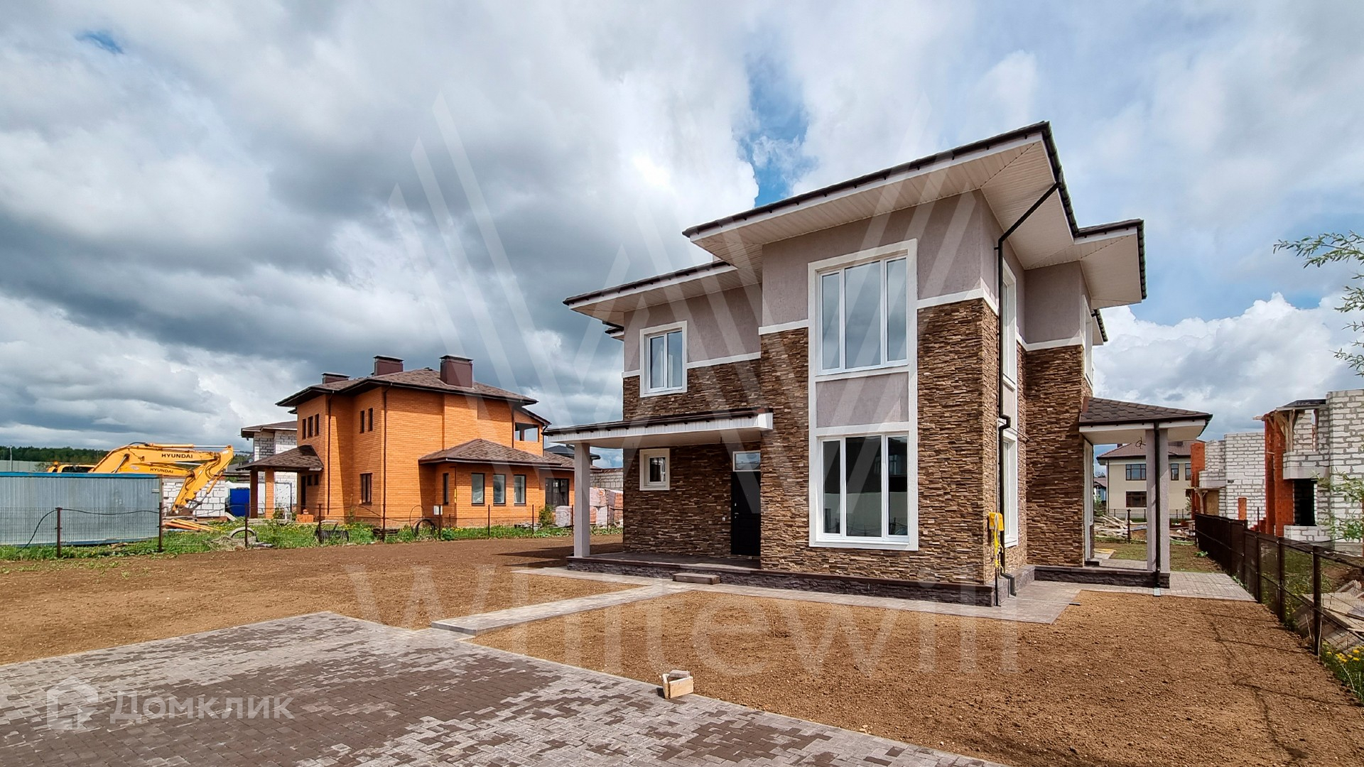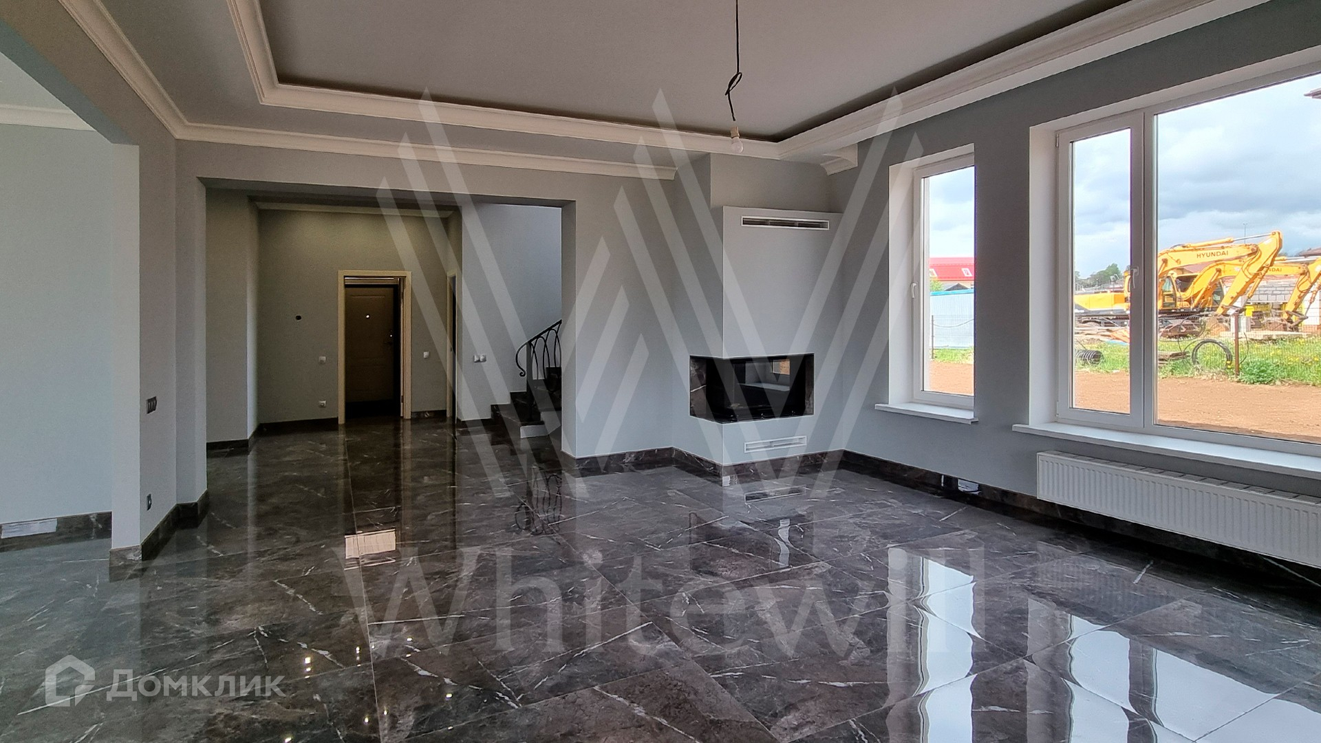 ID 10 379. Новорижский. Загородный дом площадью 310 м² расположен на полевом участке 12 соток без ландшафтного дизайна. Фасад облицован коричневой клинкерной плиткой и штукатуркой. Современный интерьер оформлен в серых оттенках. Высокие потолки и панорамные окна наполняют пространство светом и воздухом. В коттедже разместили 4 спальни, гостиную с камином и кухню с выходом на крытую террасу. На участке вымощены дорожки, на территории можно высадить сад и обустроить зону барбекю.