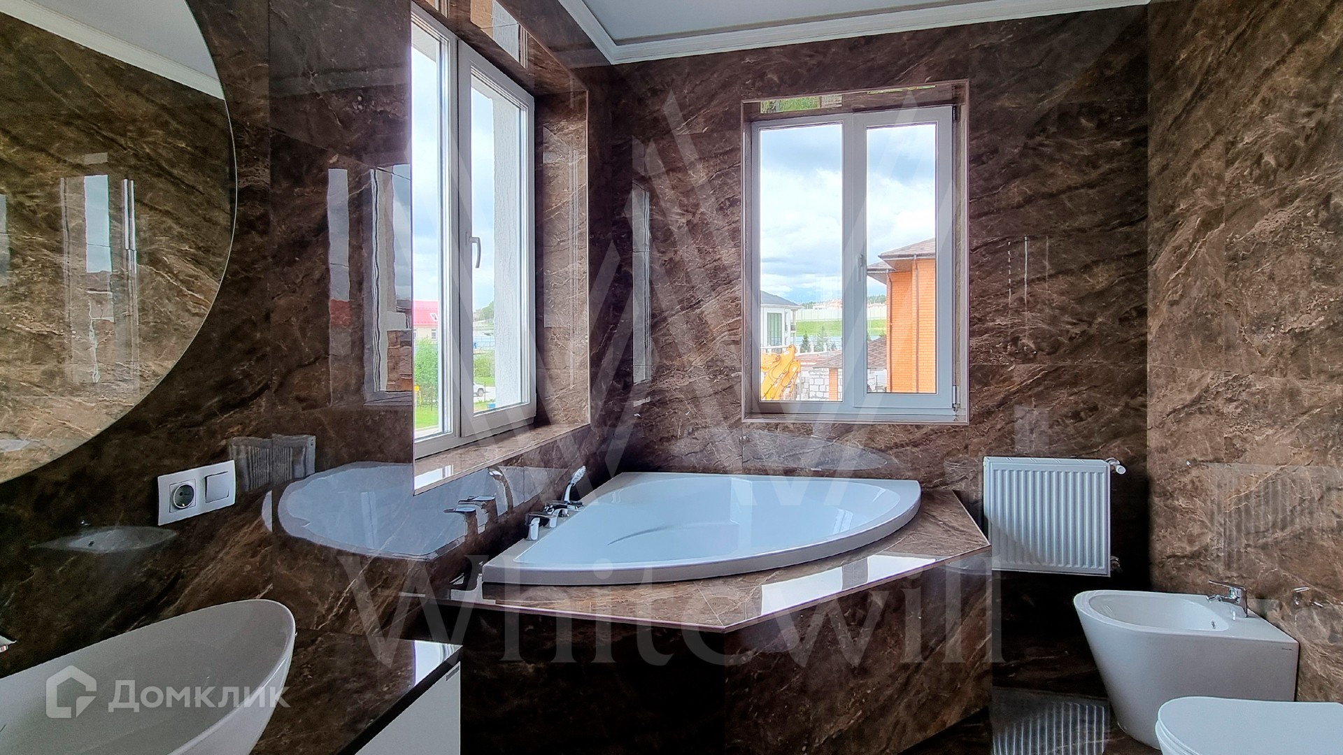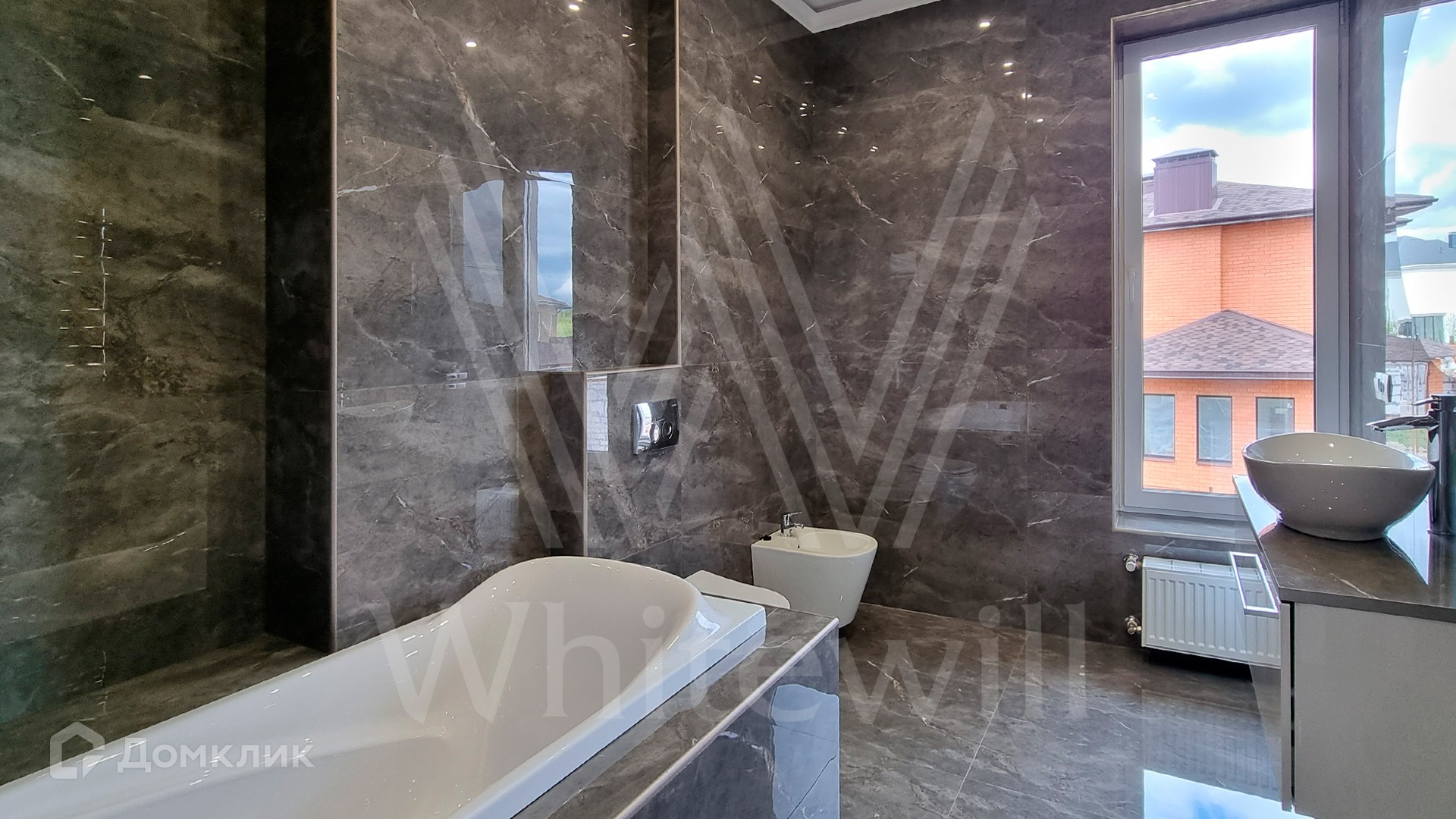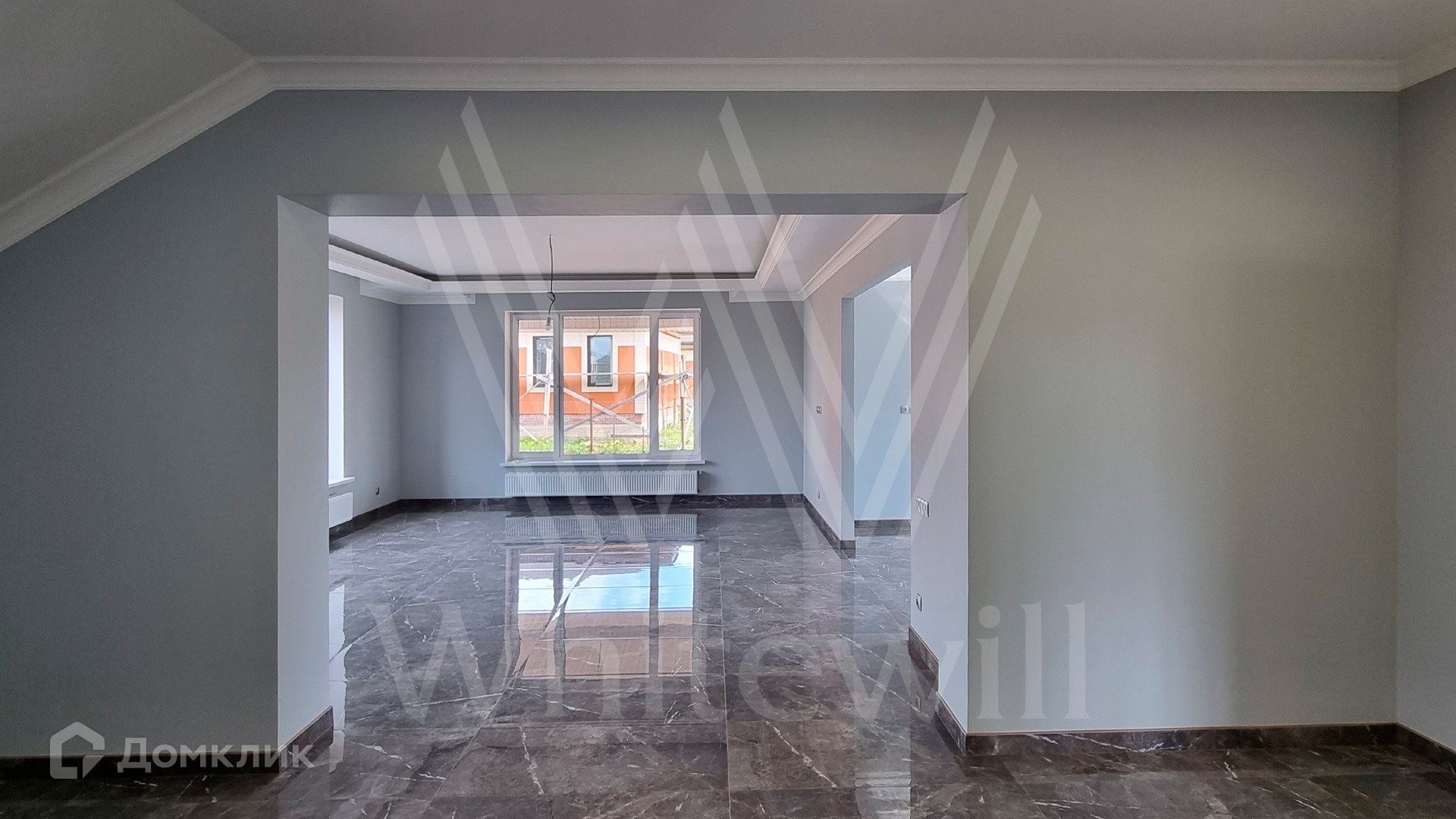 ID 10 379. Новорижский. Загородный дом площадью 310 м² расположен на полевом участке 12 соток без ландшафтного дизайна. Фасад облицован коричневой клинкерной плиткой и штукатуркой. Современный интерьер оформлен в серых оттенках. Высокие потолки и панорамные окна наполняют пространство светом и воздухом. В коттедже разместили 4 спальни, гостиную с камином и кухню с выходом на крытую террасу. На участке вымощены дорожки, на территории можно высадить сад и обустроить зону барбекю.