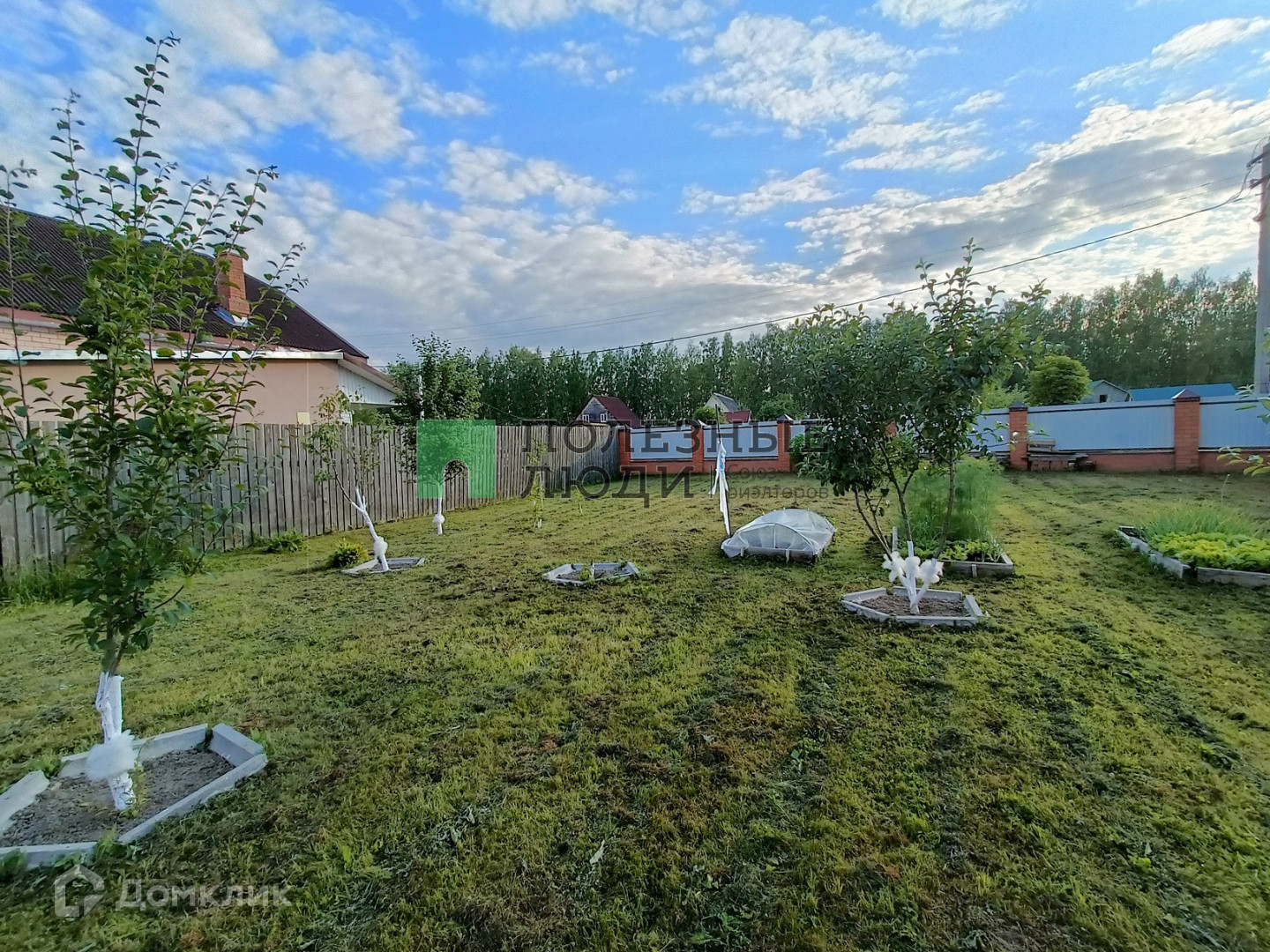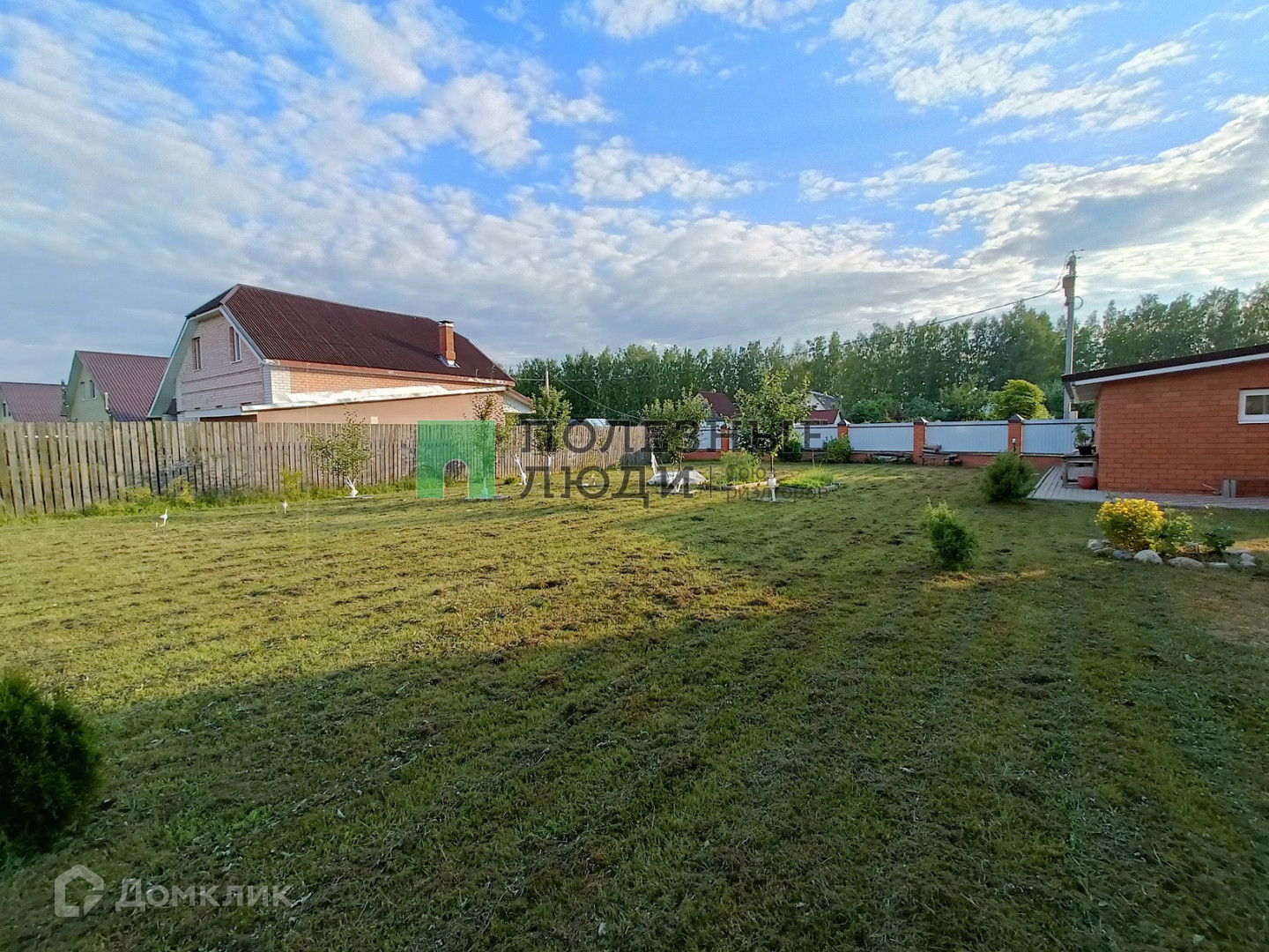 На участке множество культурных насаждений и газон для игр с детьми.