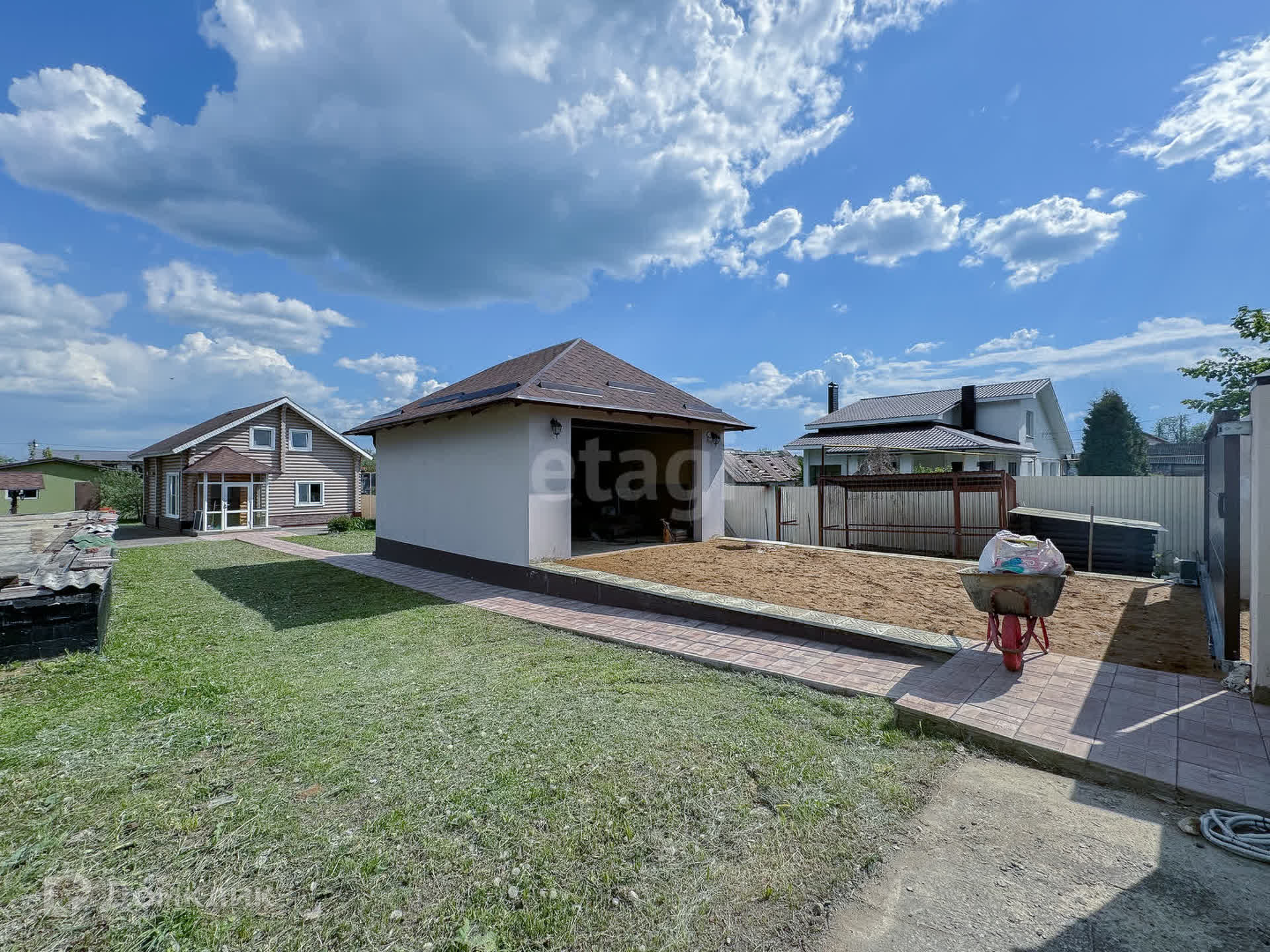 На участке есть гараж, летняя кухня (сарай), фундамент для строительства кирпичного дома и вольер. Гараж из керамзитобетона размером 7,5*5,5 м., автоматические ворота. Летняя кухня из керамзитобетона, размером 4*8 м. Фундамент для строительства кирпичного дома свайно-ростверковый размером 14*10 м., глубина 2,8 м. Новым покупателям проект дома в подарок.