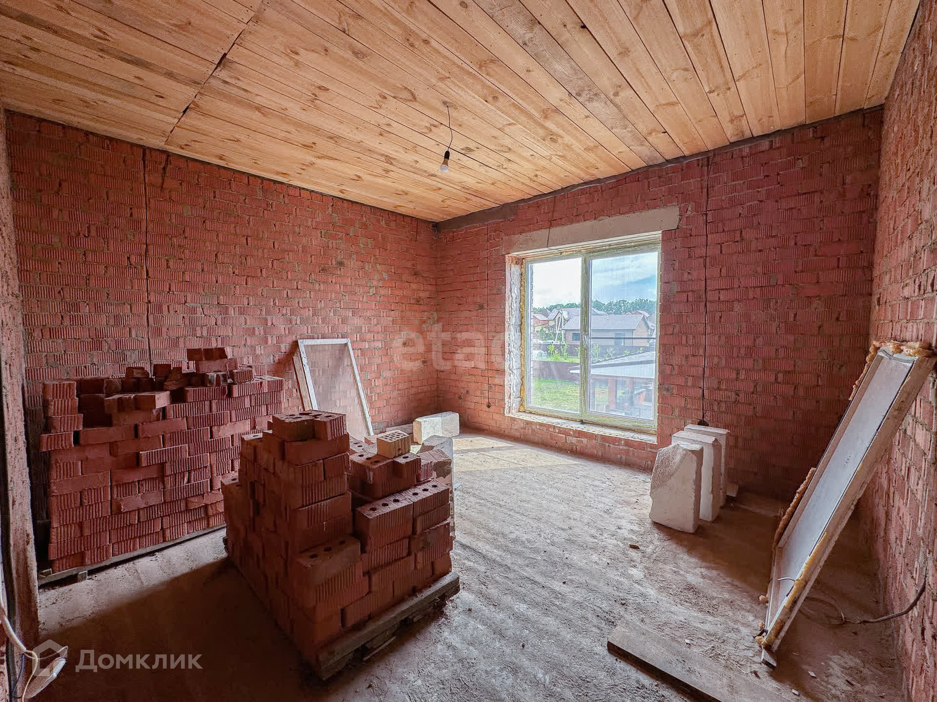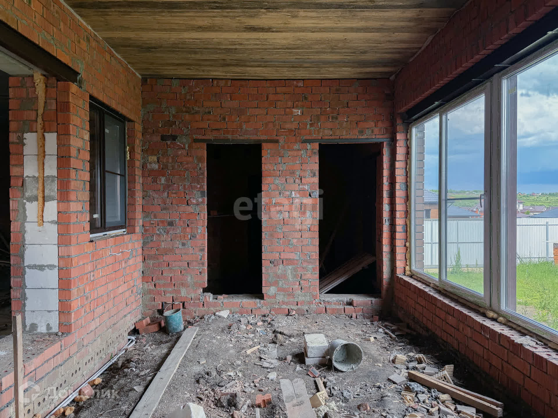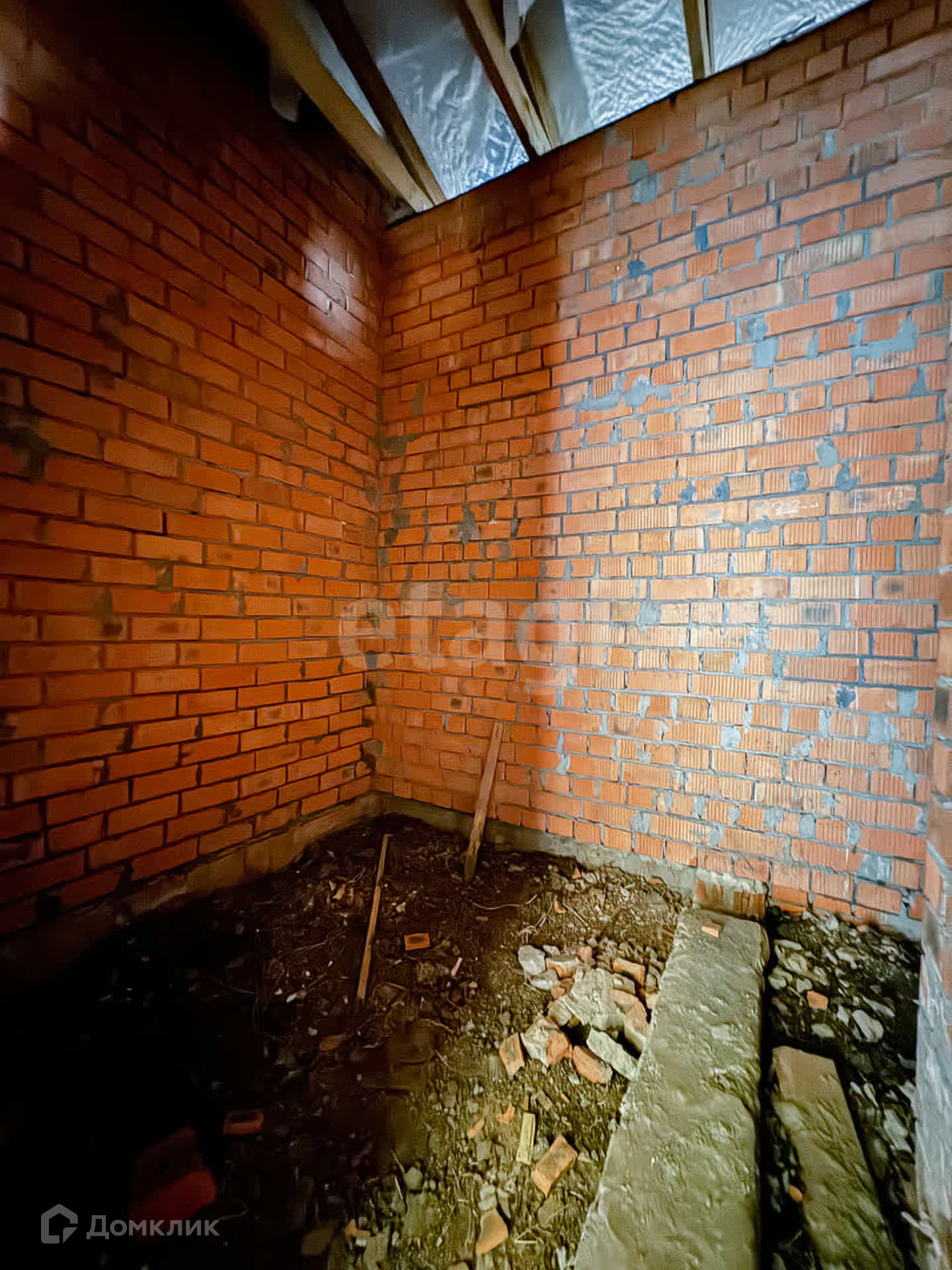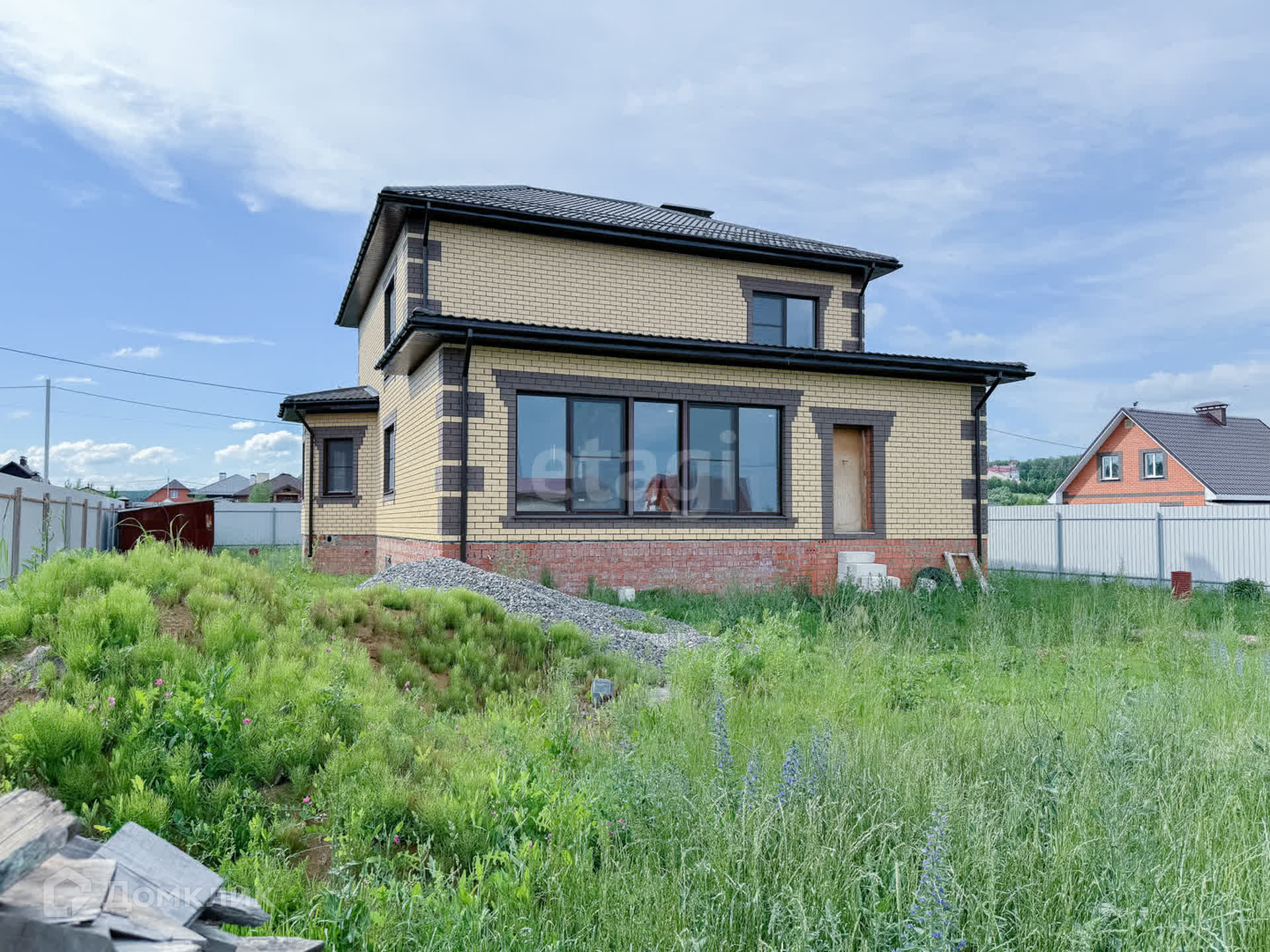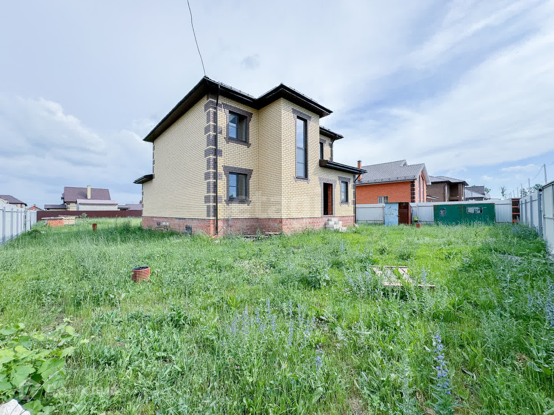 О доме: с цокольным — 3 этажа. Фундамент блочный. Стены из пенобетона, снаружи облицовочный кирпич, внутри выложены красным кирпичом. Толщина стен 45 см. Высота потолка цокольного этажа: 2,2 м. Первый этаж: 3 м. Окна — ПВХ, трехкамерные стеклопакеты. Крыша — металлочерепица. Участок: ровный, не разработан, размежеван.