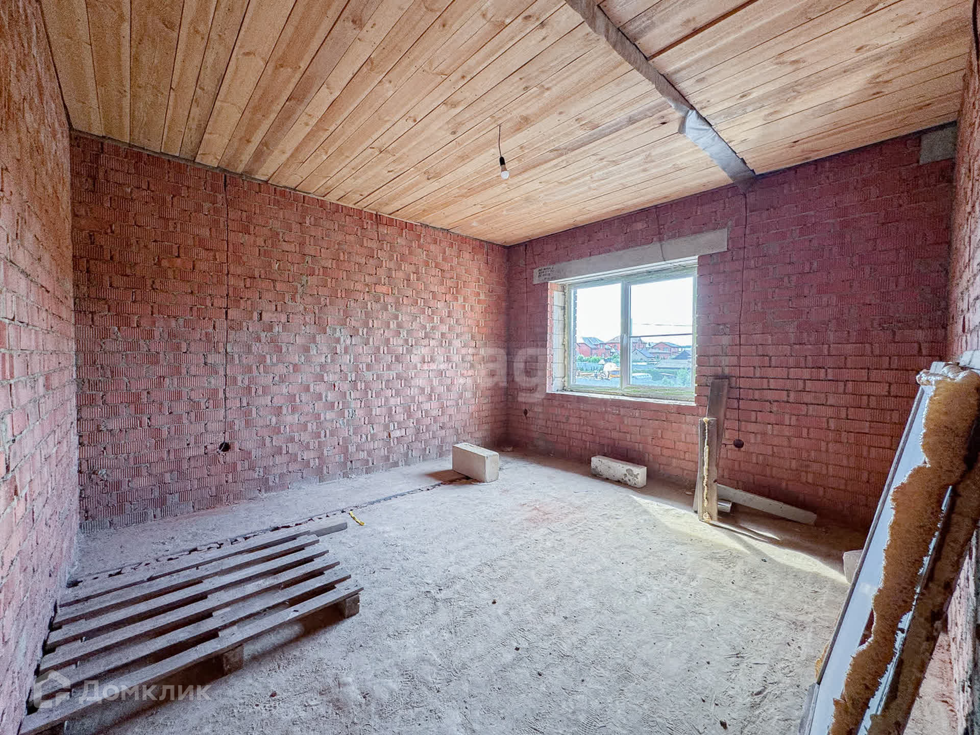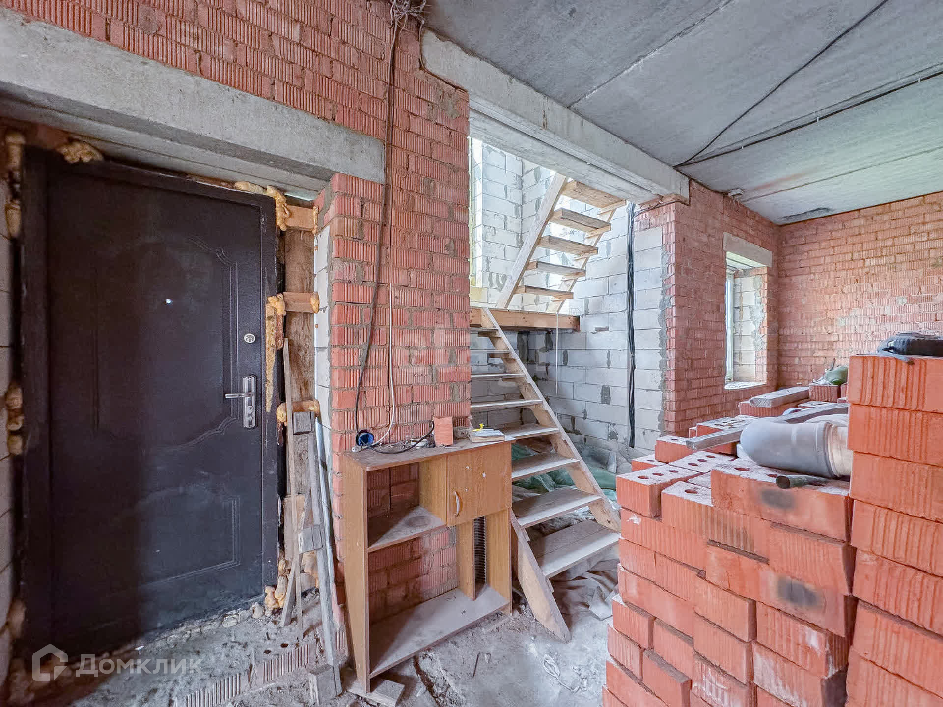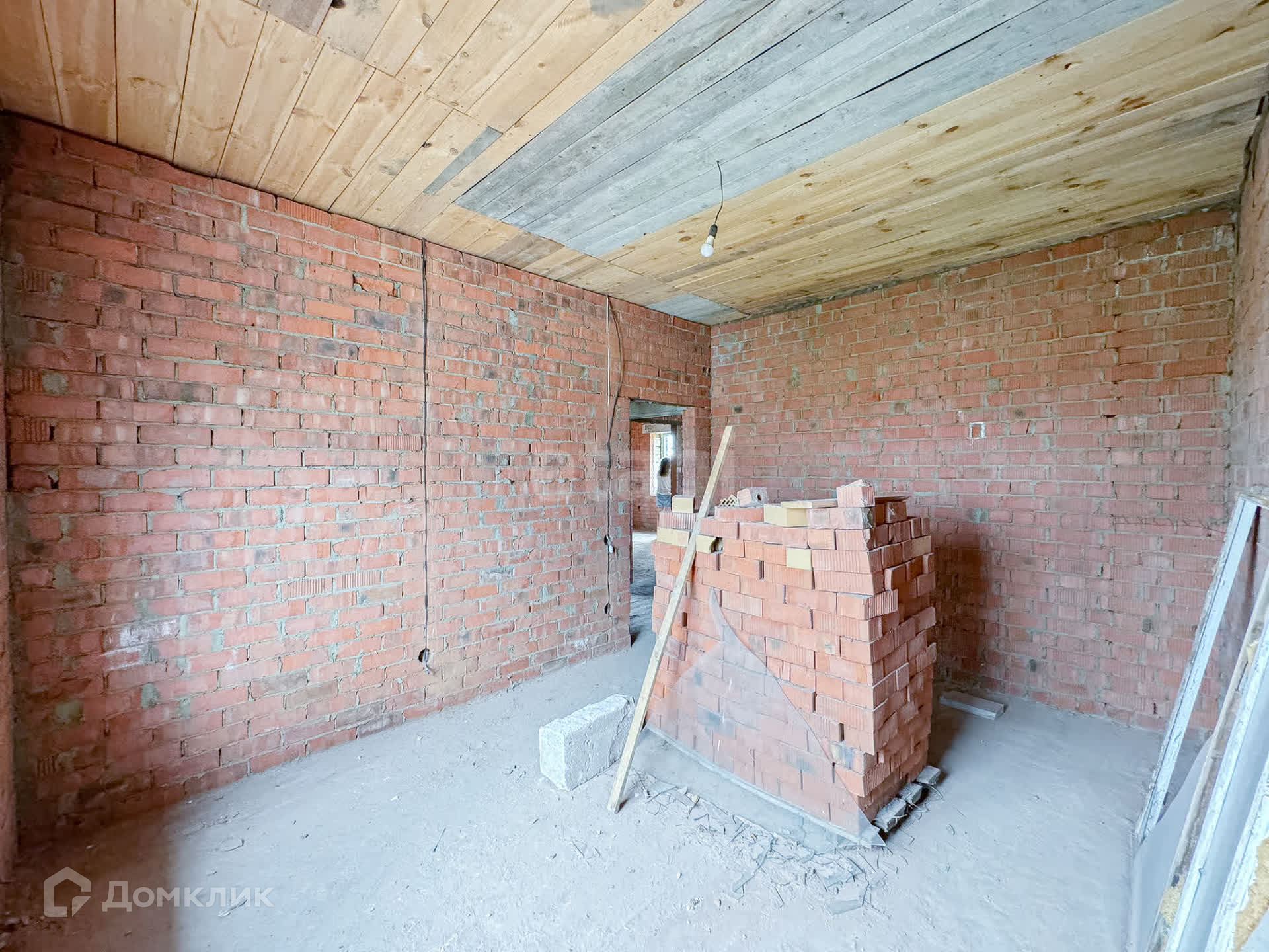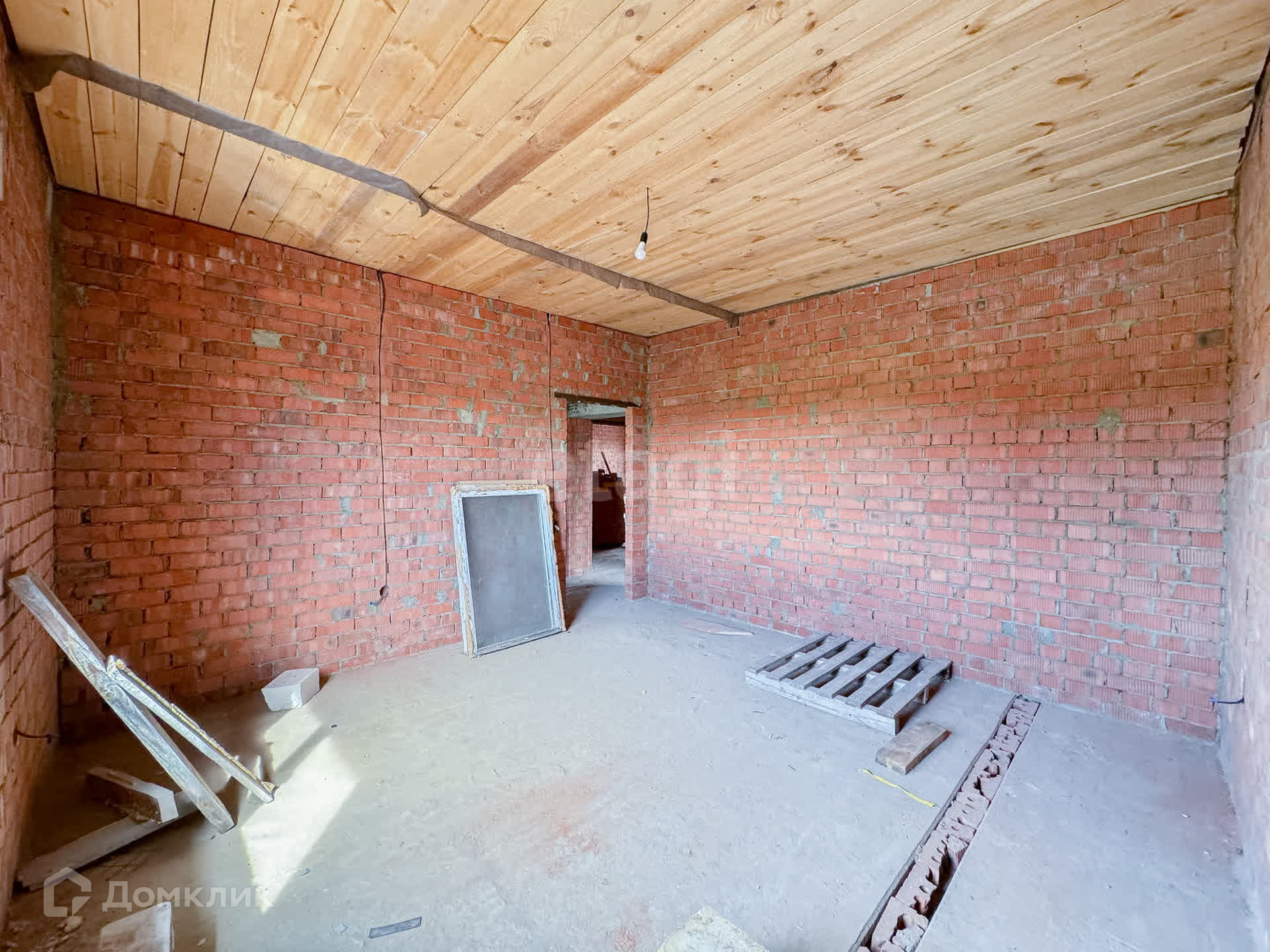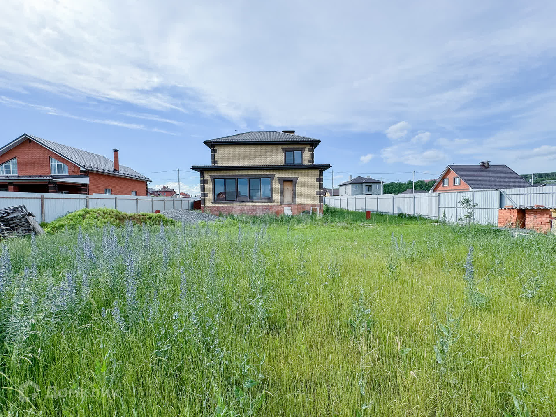 О доме: с цокольным — 3 этажа. Фундамент блочный. Стены из пенобетона, снаружи облицовочный кирпич, внутри выложены красным кирпичом. Толщина стен 45 см. Высота потолка цокольного этажа: 2,2 м. Первый этаж: 3 м. Окна — ПВХ, трехкамерные стеклопакеты. Крыша — металлочерепица. Участок: ровный, не разработан, размежеван.