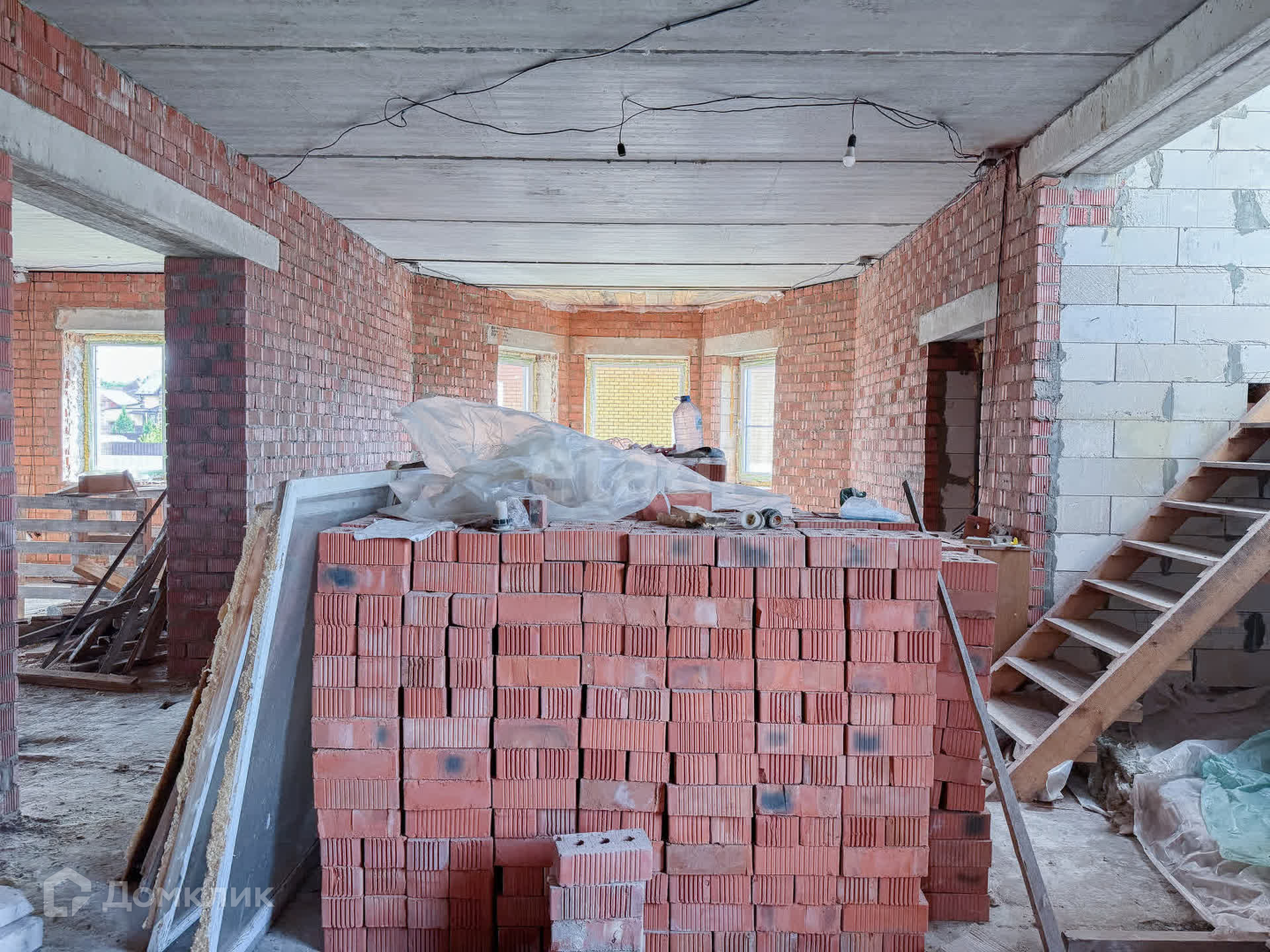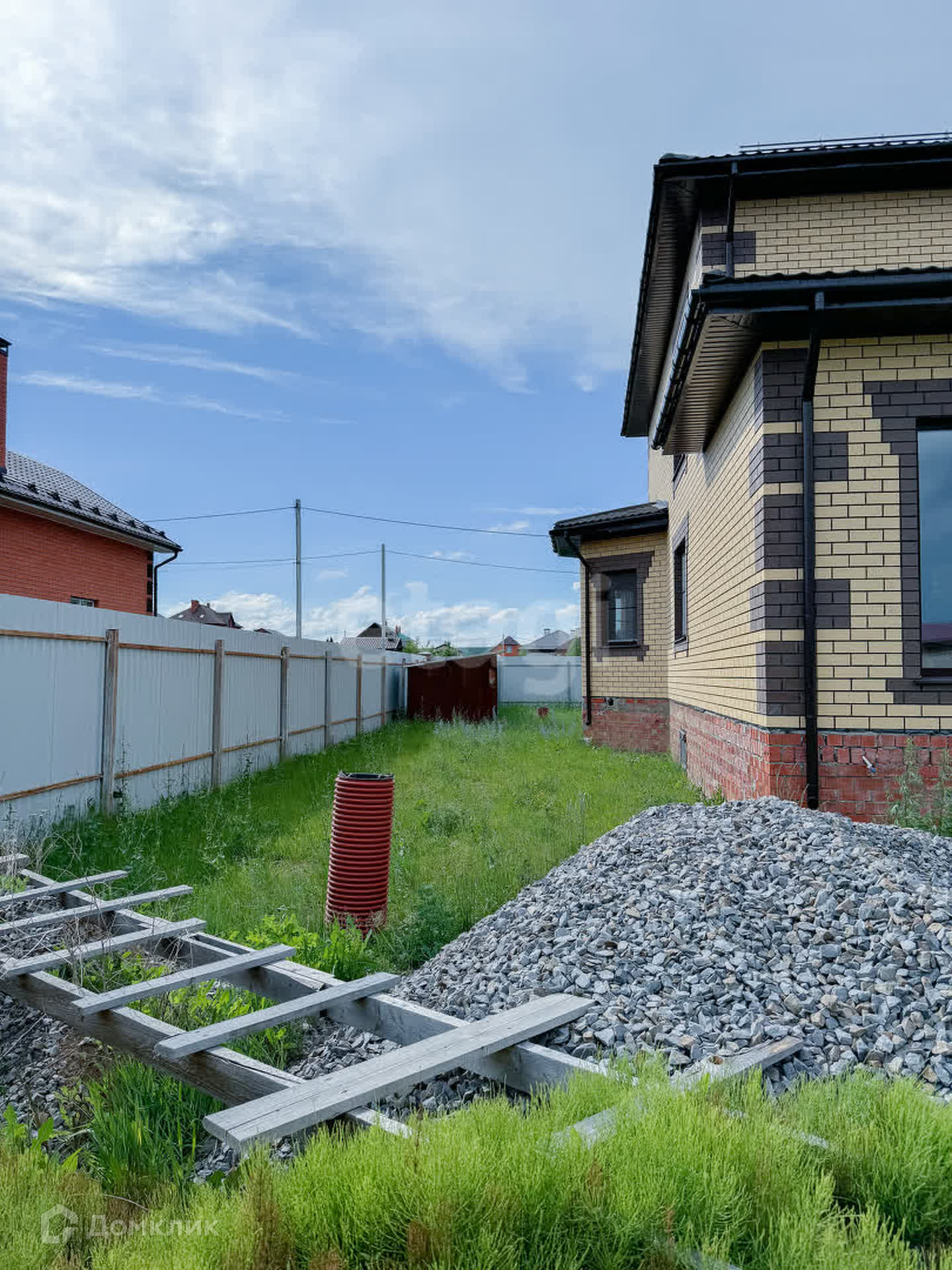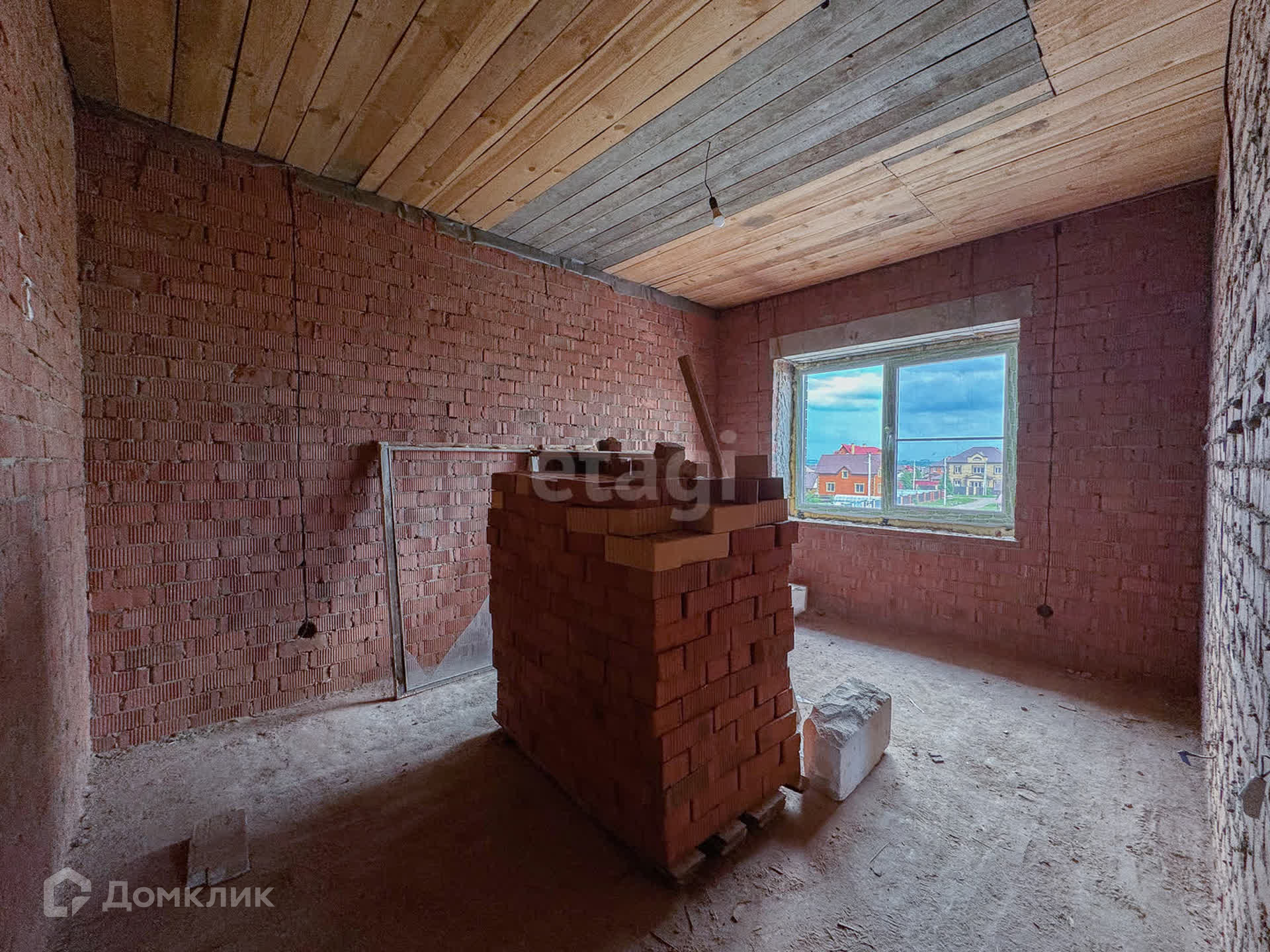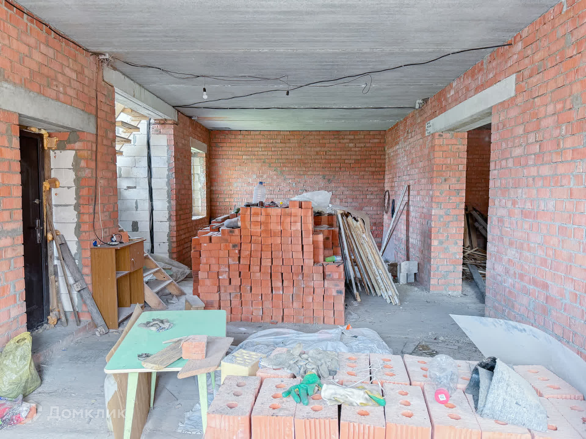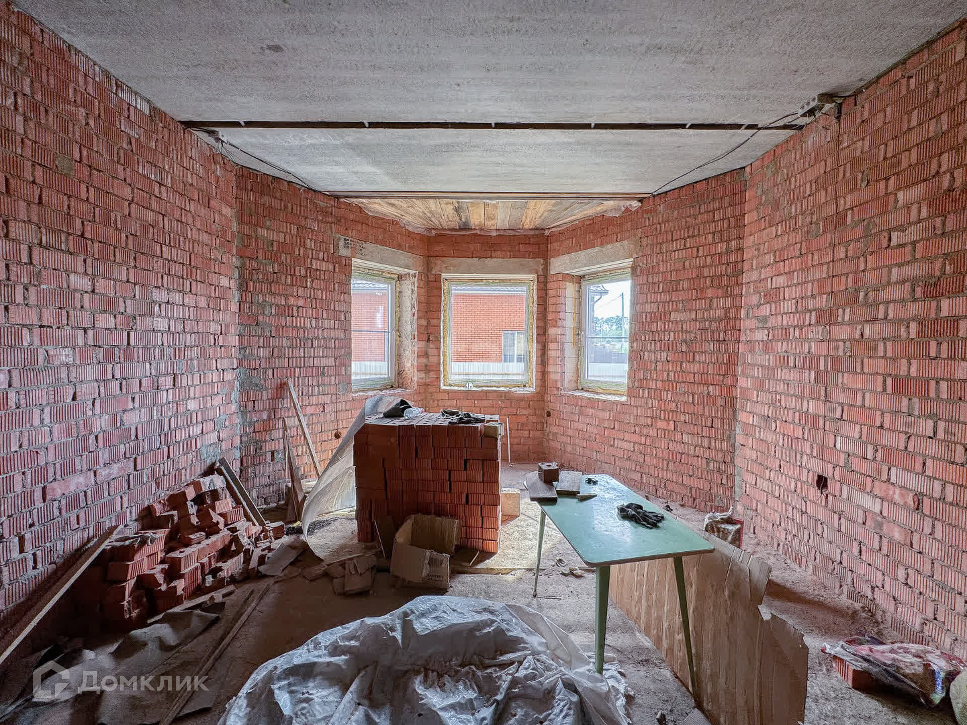 О доме: с цокольным — 3 этажа. Фундамент блочный. Стены из пенобетона, снаружи облицовочный кирпич, внутри выложены красным кирпичом. Толщина стен 45 см. Высота потолка цокольного этажа: 2,2 м. Первый этаж: 3 м. Окна — ПВХ, трехкамерные стеклопакеты. Крыша — металлочерепица. Участок: ровный, не разработан, размежеван.