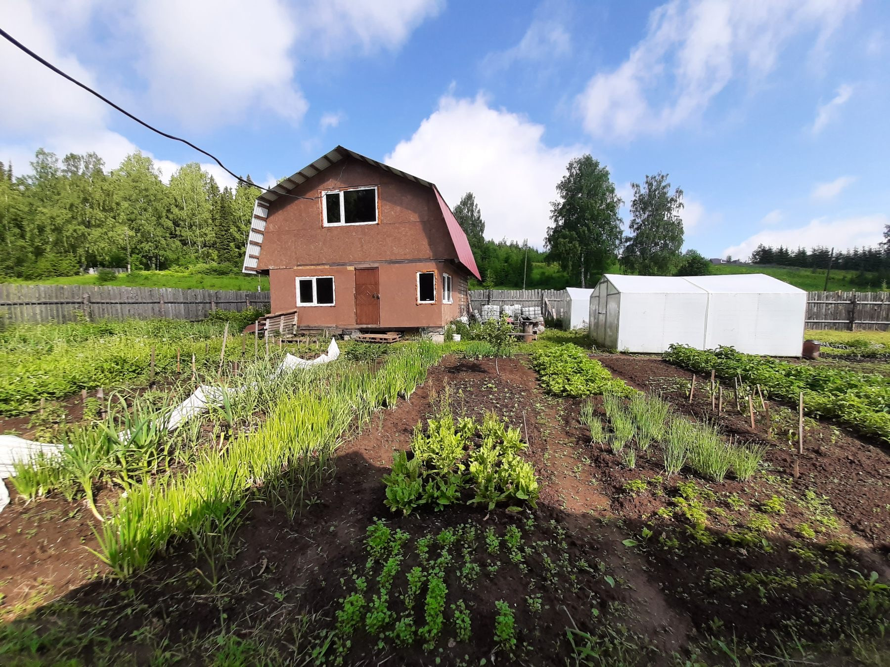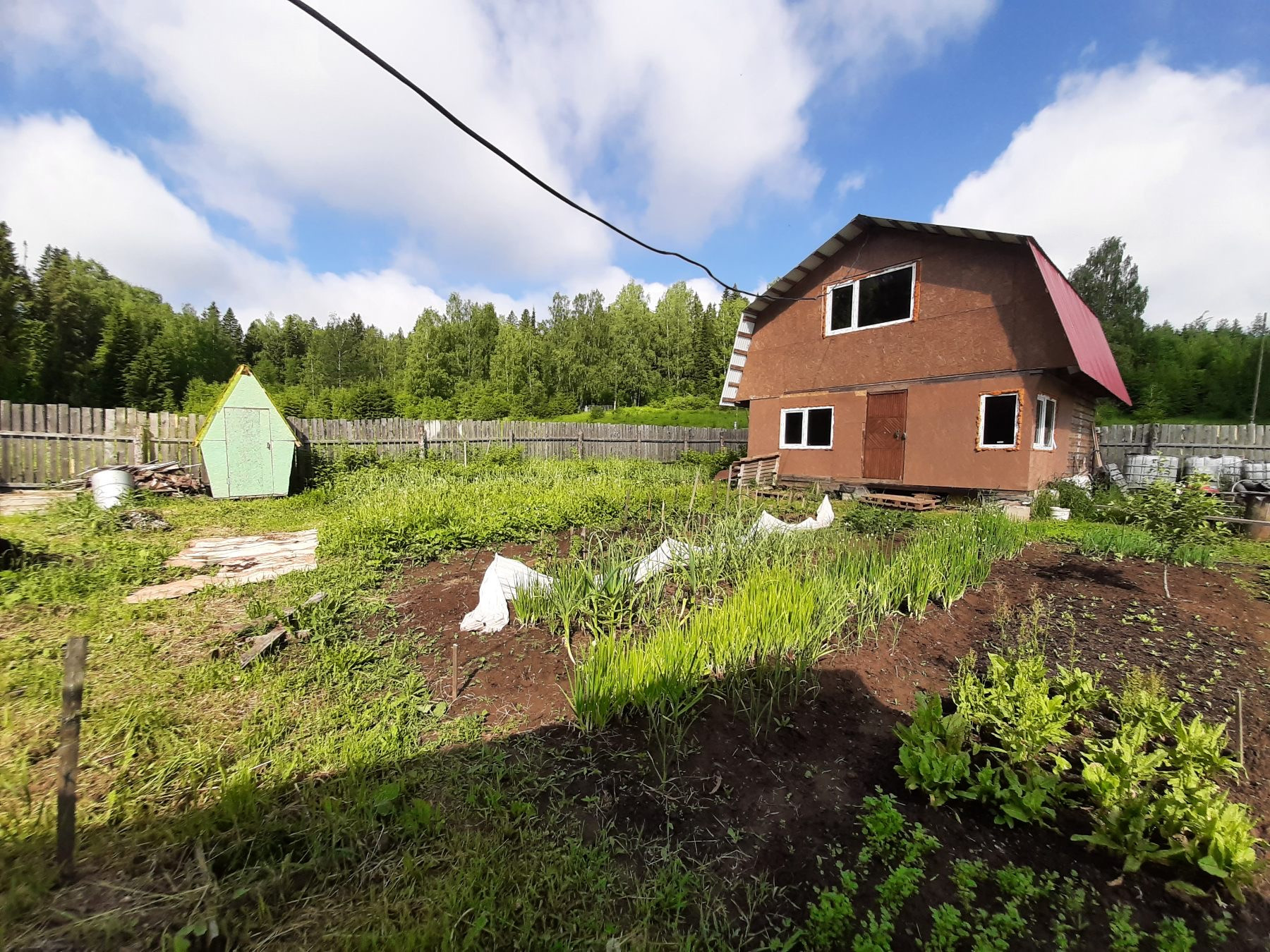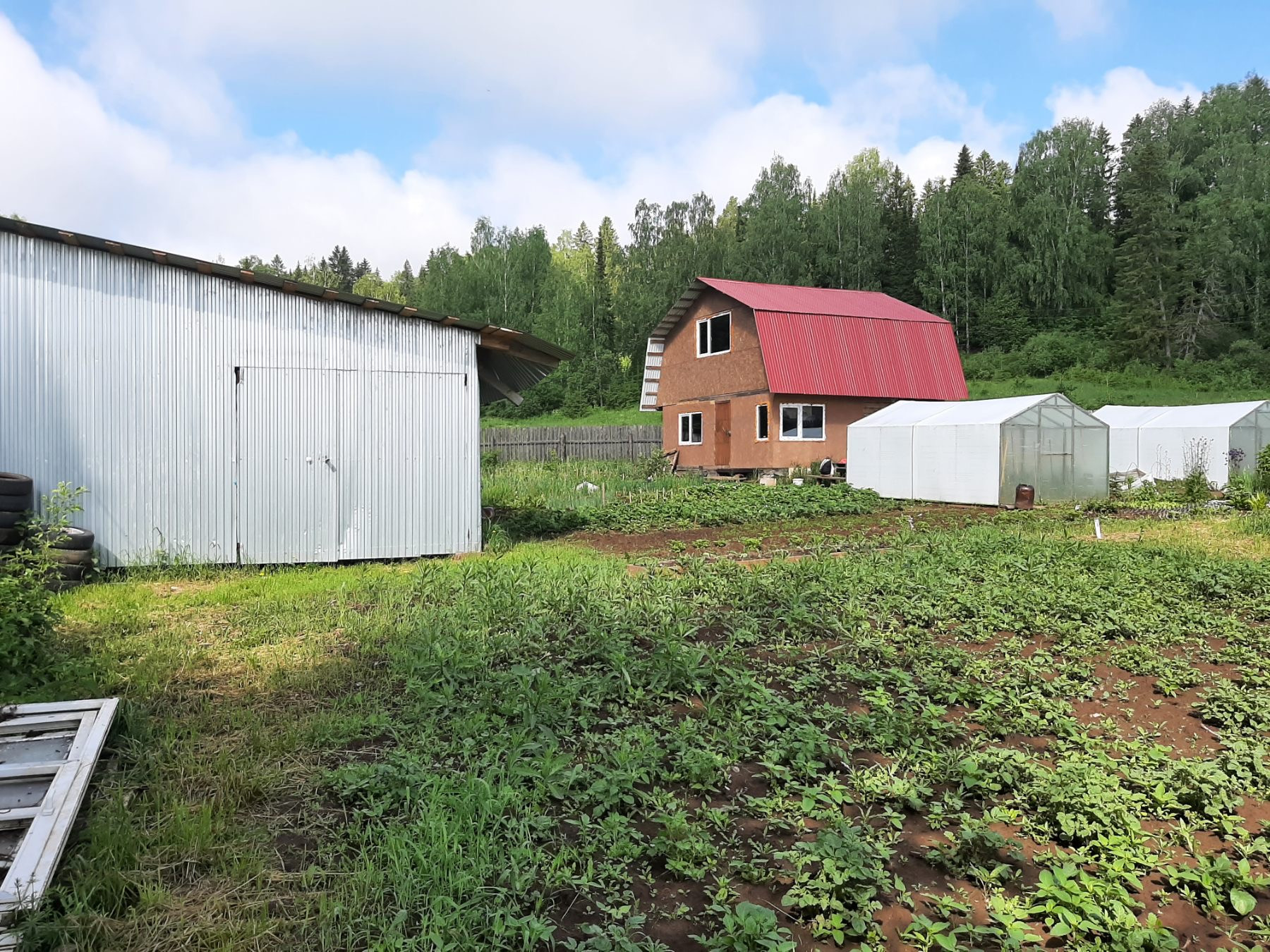 Земельный участок  в д. Долгий мост со всеми посадками, насаждениями разных сортов кустарников, ягод. На участке  дом-баня 36м2 из  бруса  без внутренней отделки, скважина, эл-во,  рядом родник.