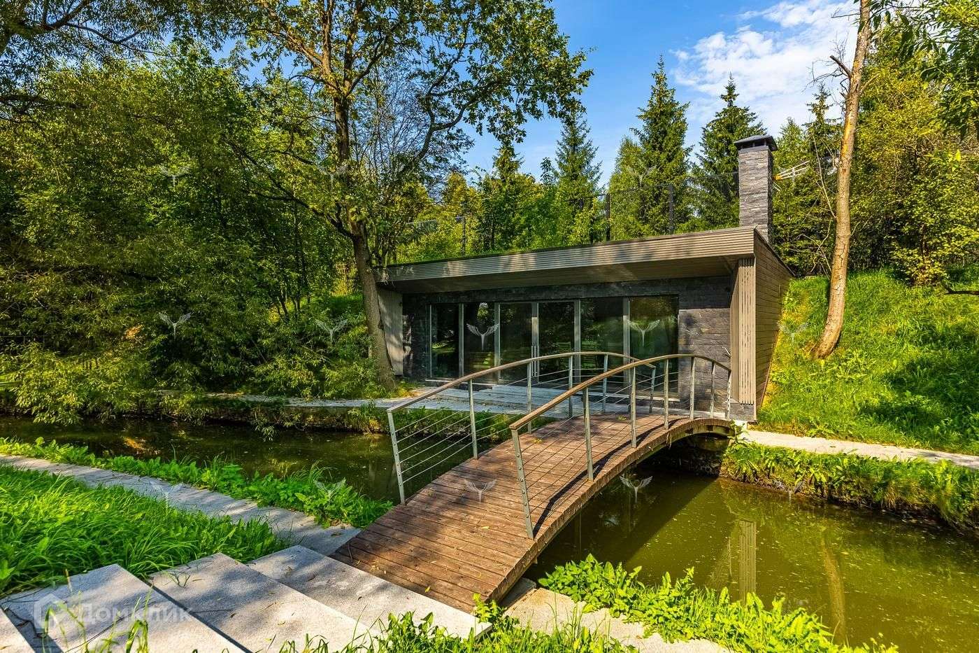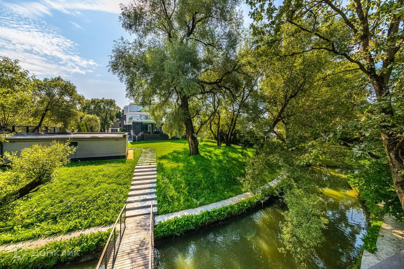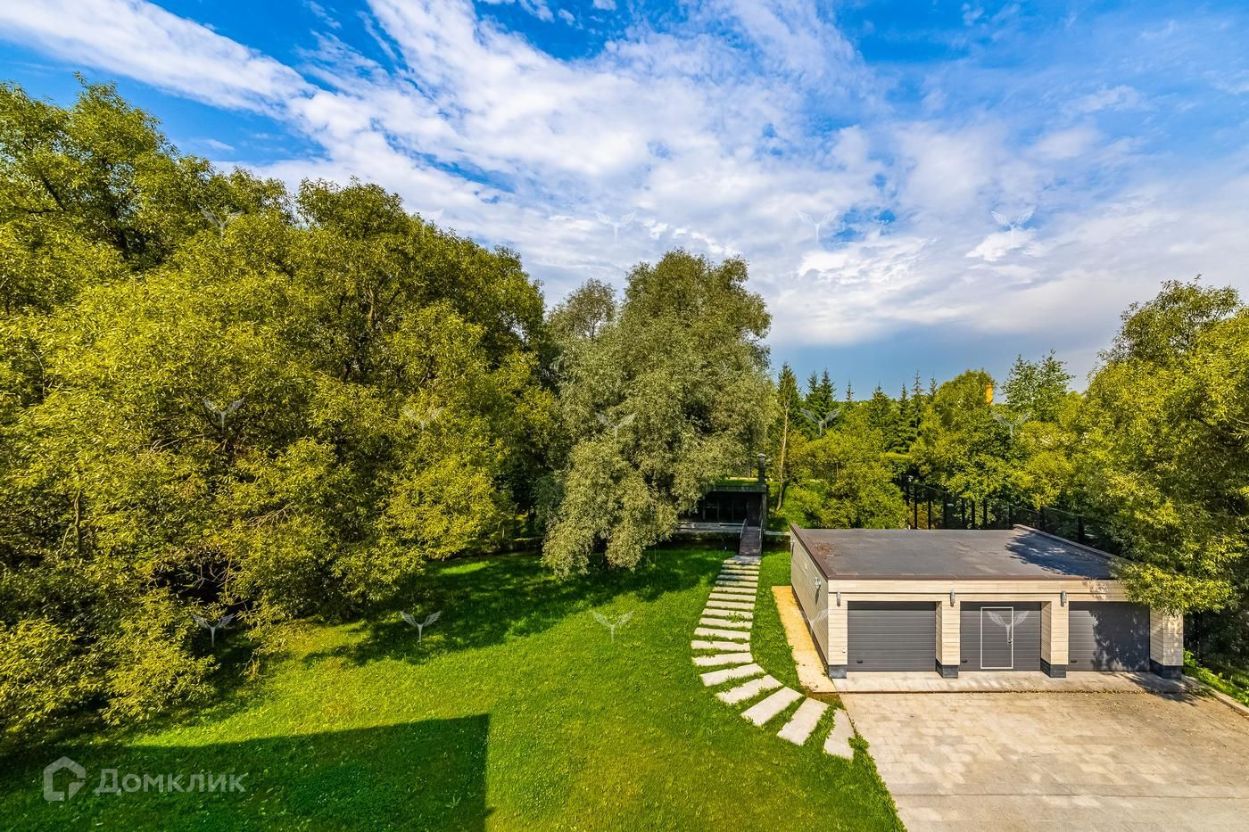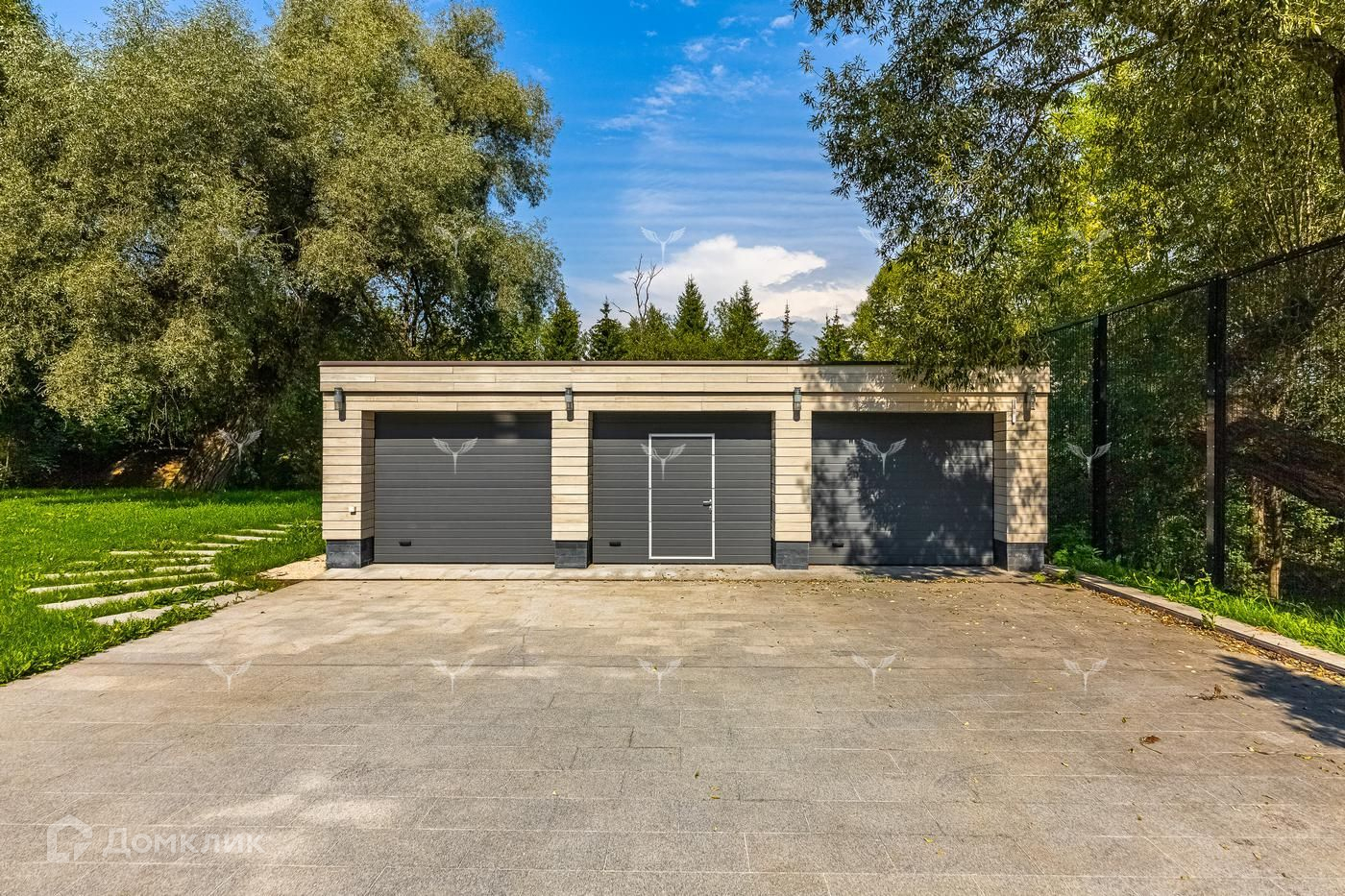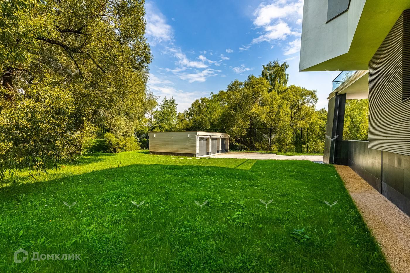 На участке два теплых гаража на 5 машин, круглогодичный павильон (барбекью и т.д.) со всеми коммуникациями, дом охраны и персонала.
