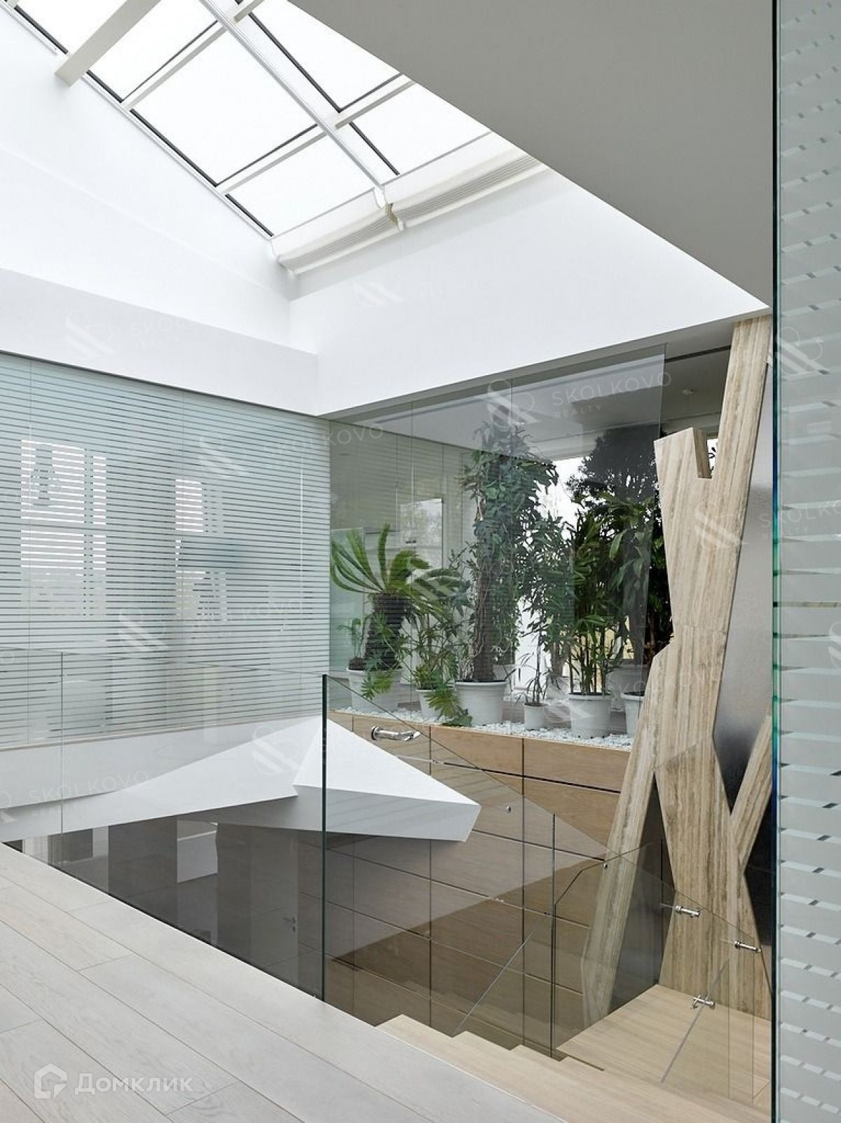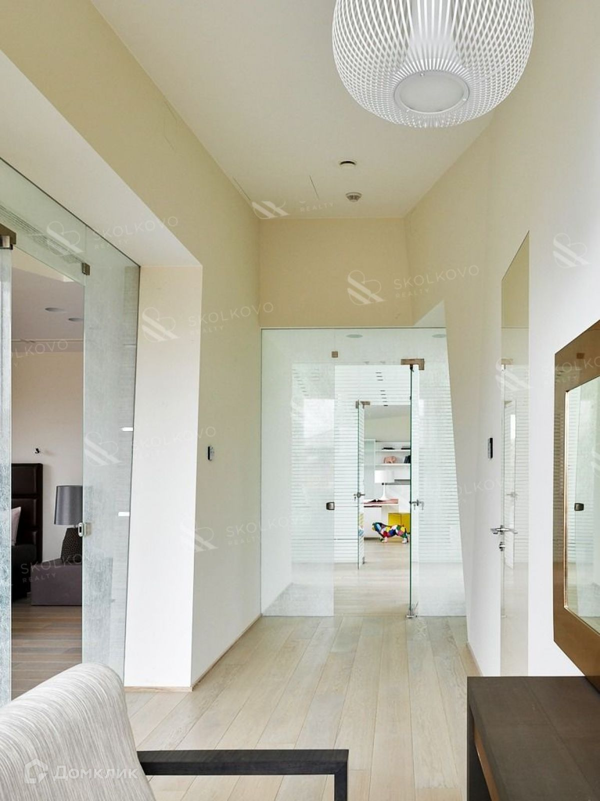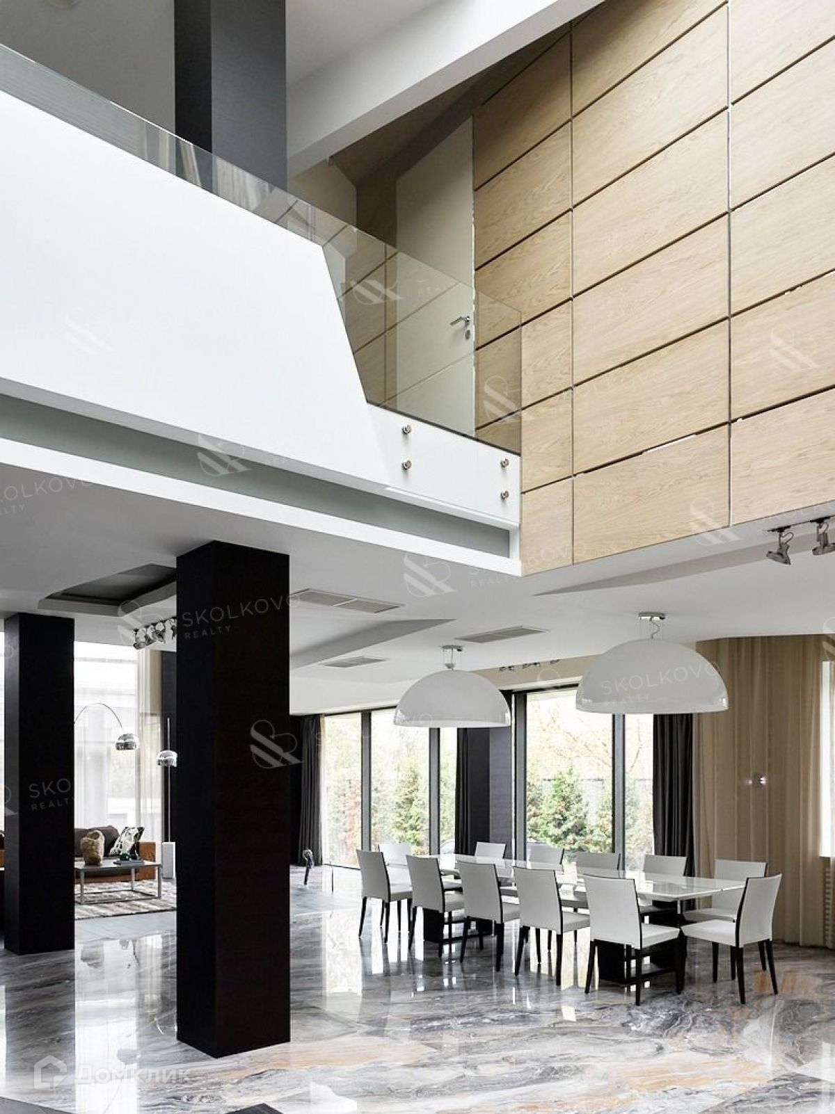 Четыре уровня дома позволят с комфортом разместиться большой семье. Восемь спален с санузлами, гардеробные, просторный зал-гостиная с камином, библиотека, два кабинета, зимний сад, игровая, тренажерный зал, кинозал, шубохранилище. Итальянский лифт, две кухни на разных этажах, прачечная, много подсобных помещений, отдельный вход и помещение для персонала.