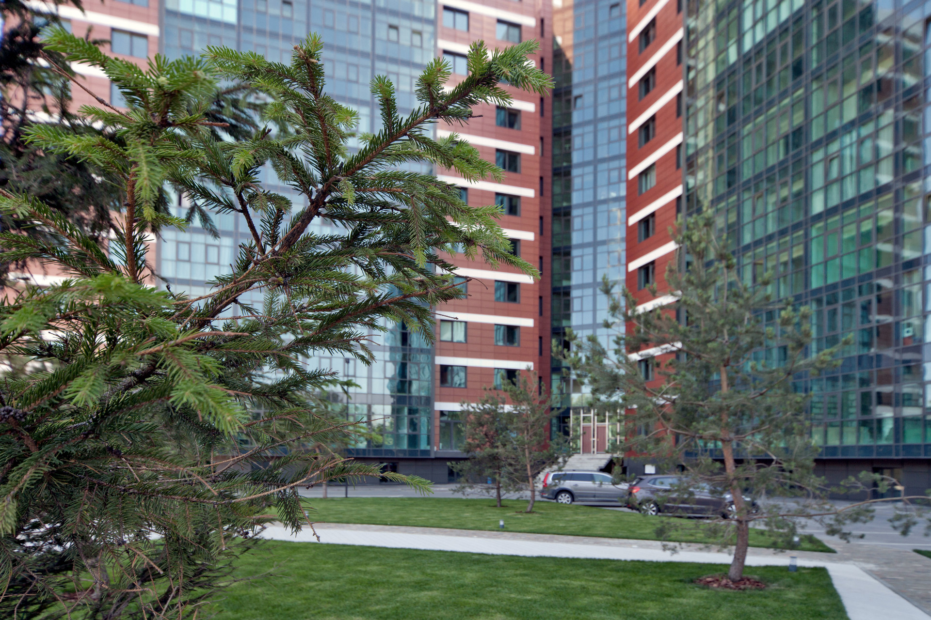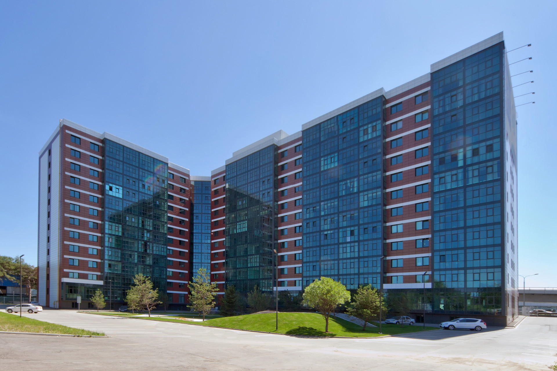 Архитектурная концепция комплекса в современном дизайне с эффектными остекленными фасадами. Стильные входные группы, уютные холлы с лаунж зонами.