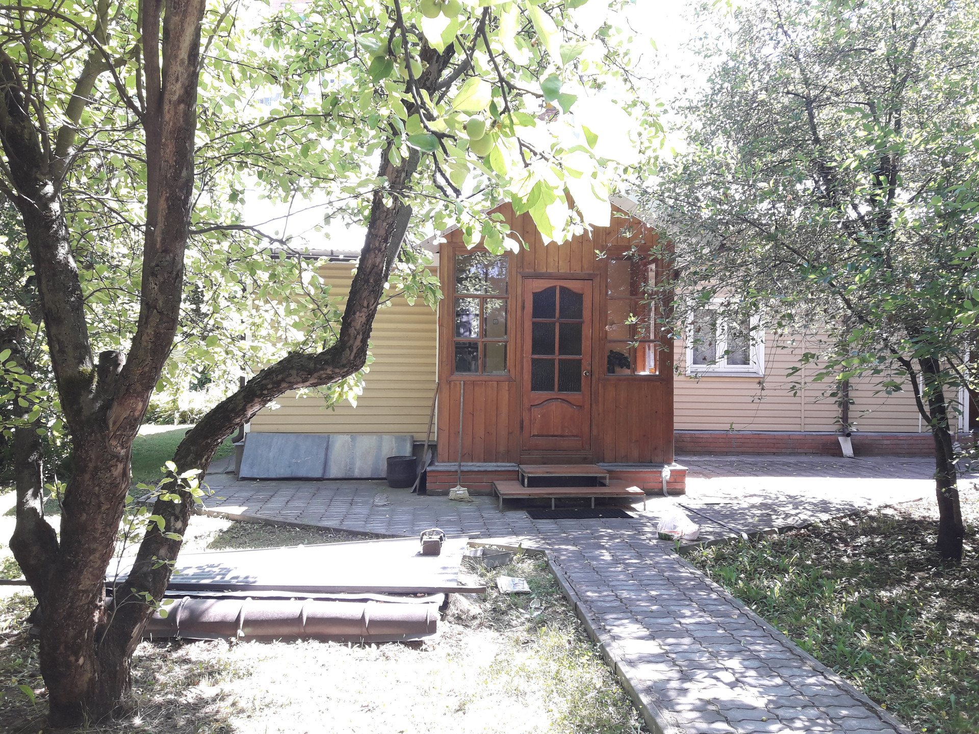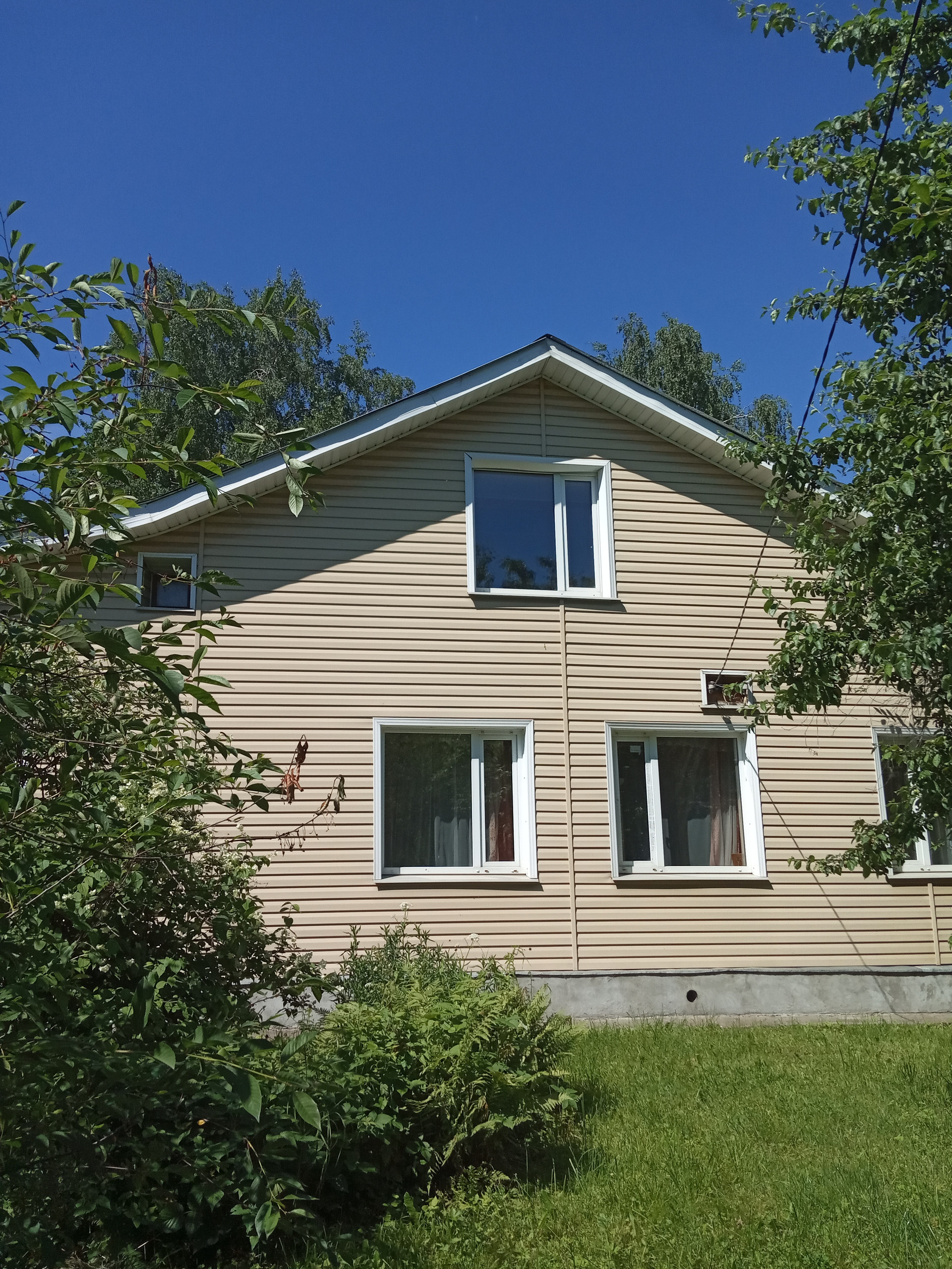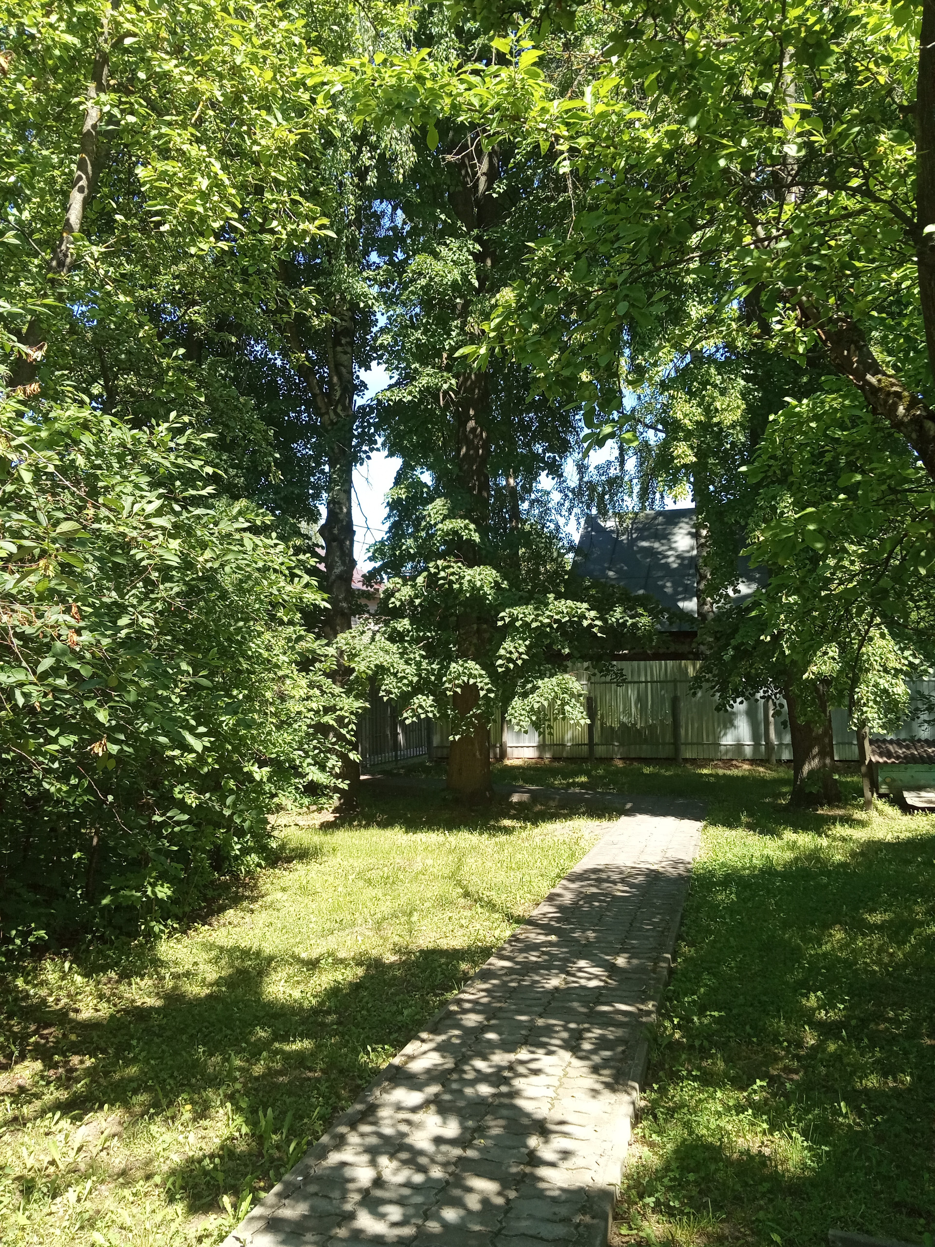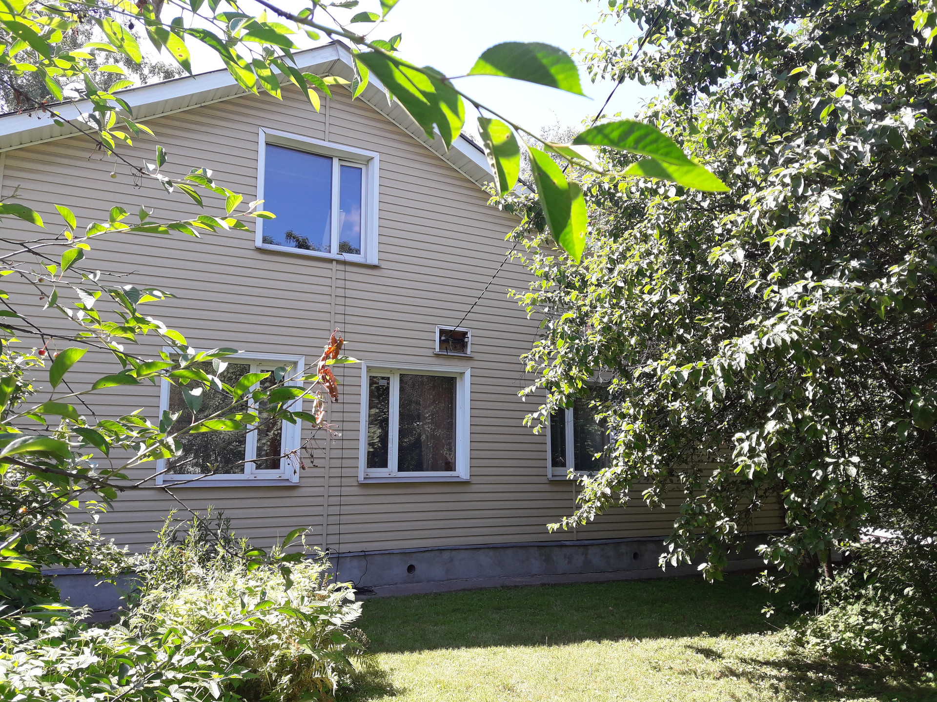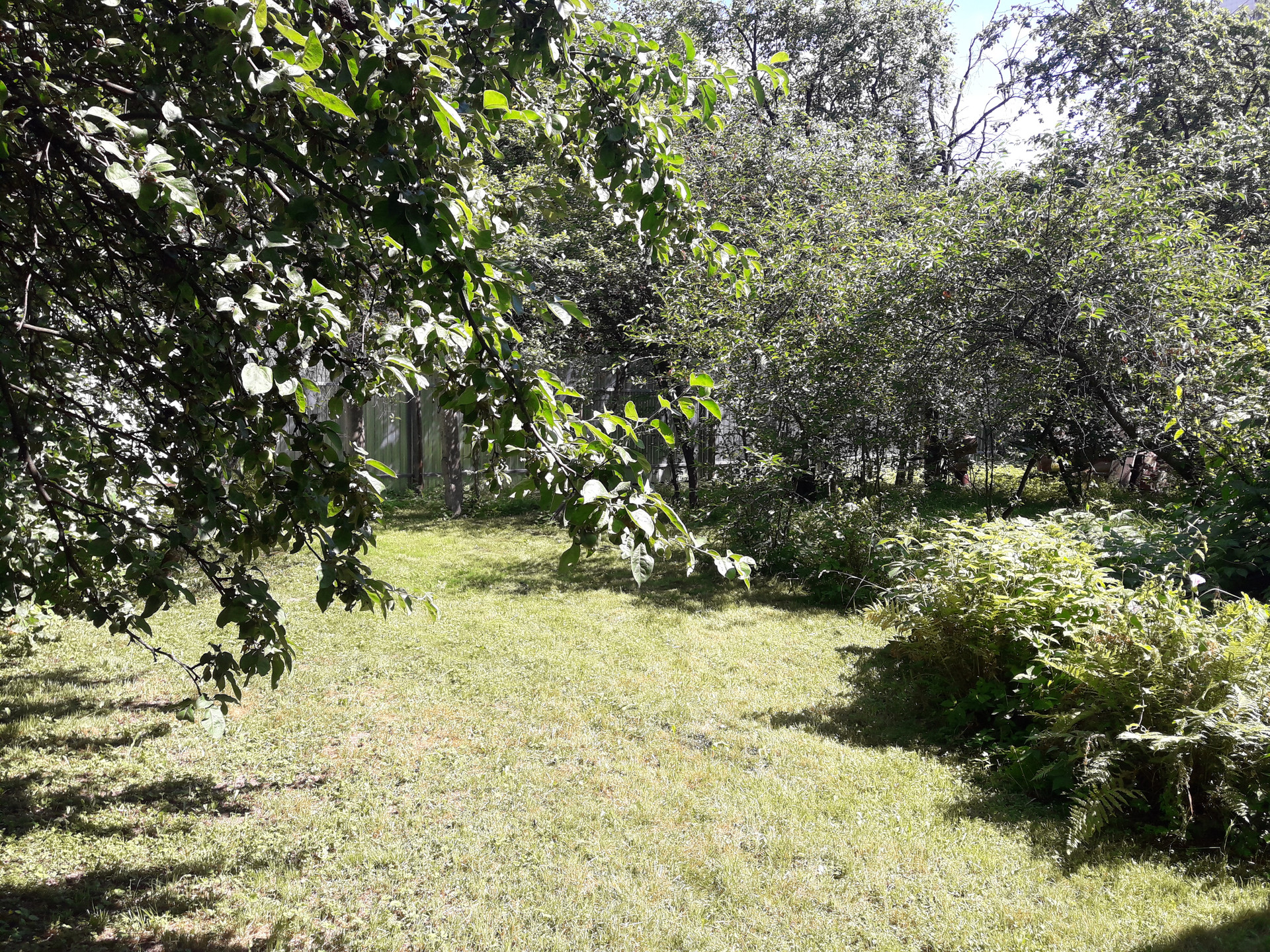 Участок находится на возвышенности, дом в окружении деревьев, кустарников, зелени: яблонь, вишен, слив, ирги, жасмина и других растений и цветов.