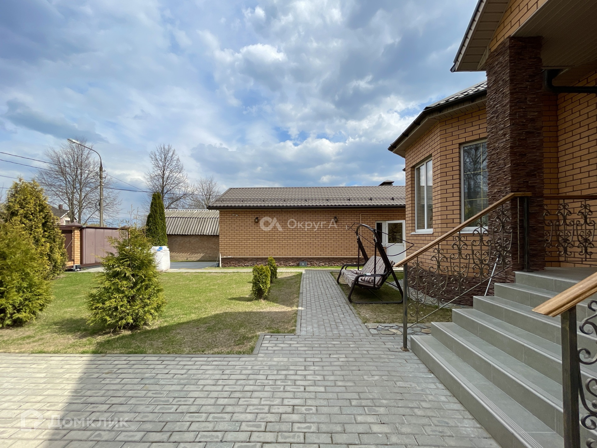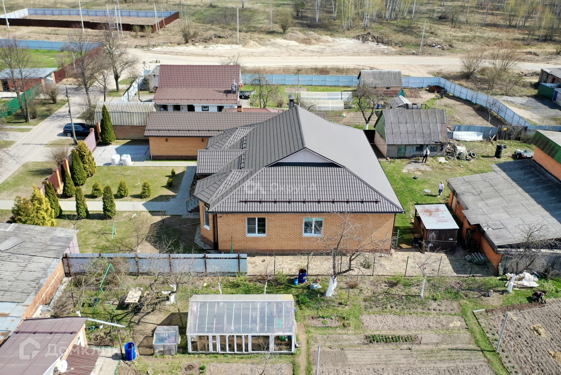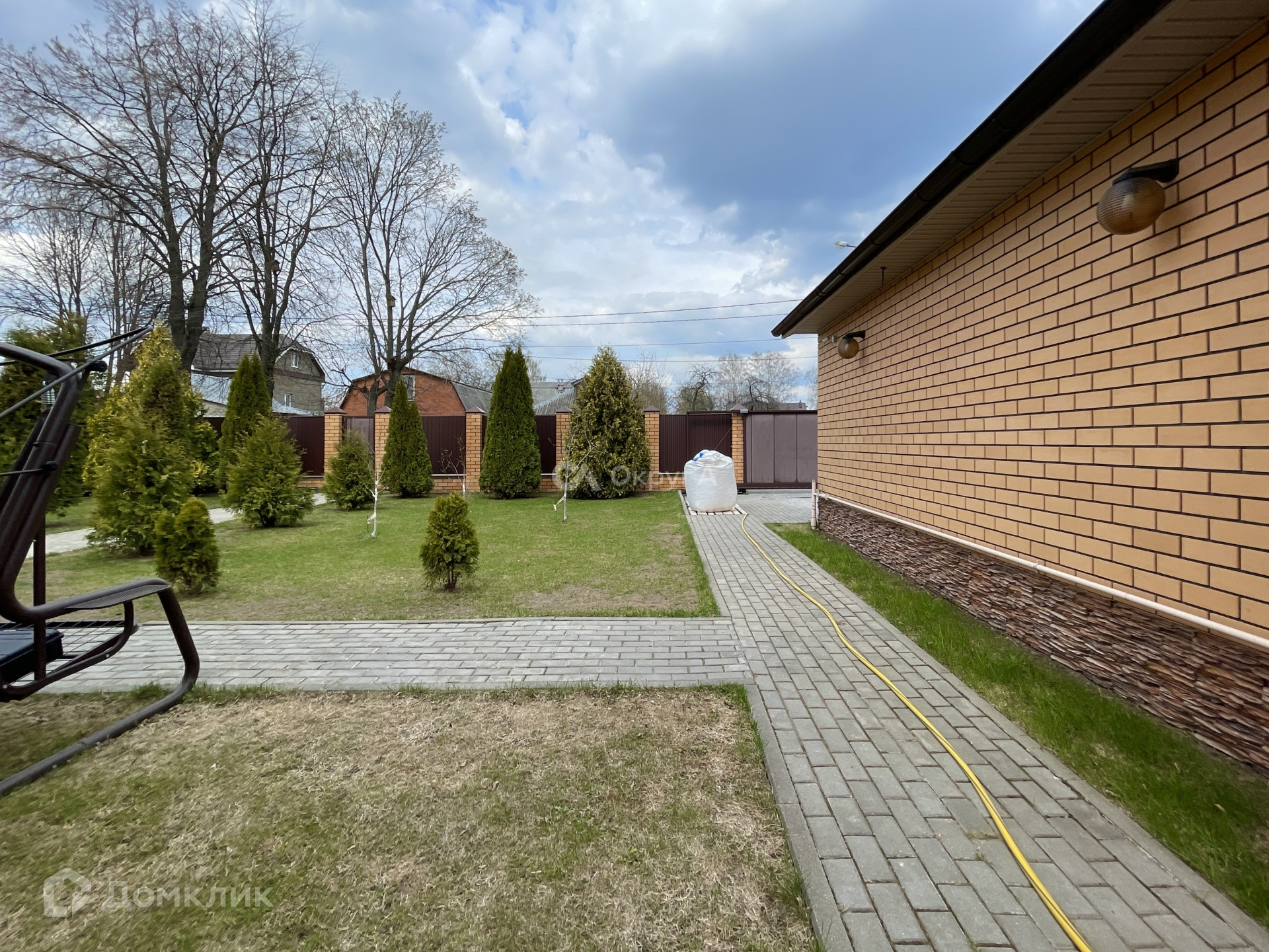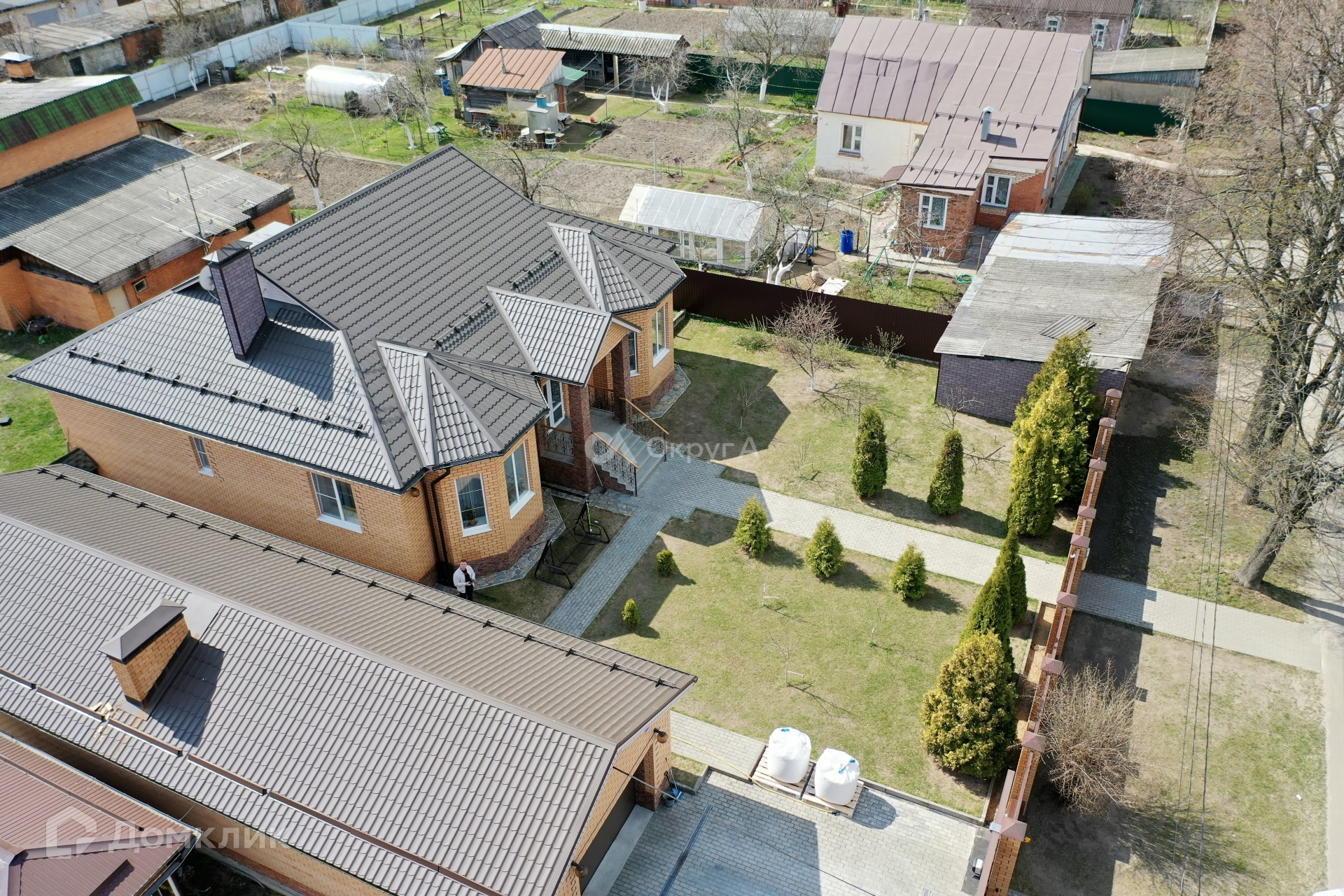Участок 9,7сот, правильной, прямоугольной формы, огорожен по периметру забором, откатные электронные ворота фирмы «ALUTECH». На участке засеяна газонная трава, вымощены дорожки, посажены туи, плодовые деревья (вишня, яблоня, груша, слива) и кустарники (крыжовник, красная и чёрная смородина). Хорошая, облагороженная придомовая территория. Вода – скважина 40м с системой фильтрации, канализация – септик (2 резервуара по 4 кольца с переливом), газ магистральный, электричество 10кВт.