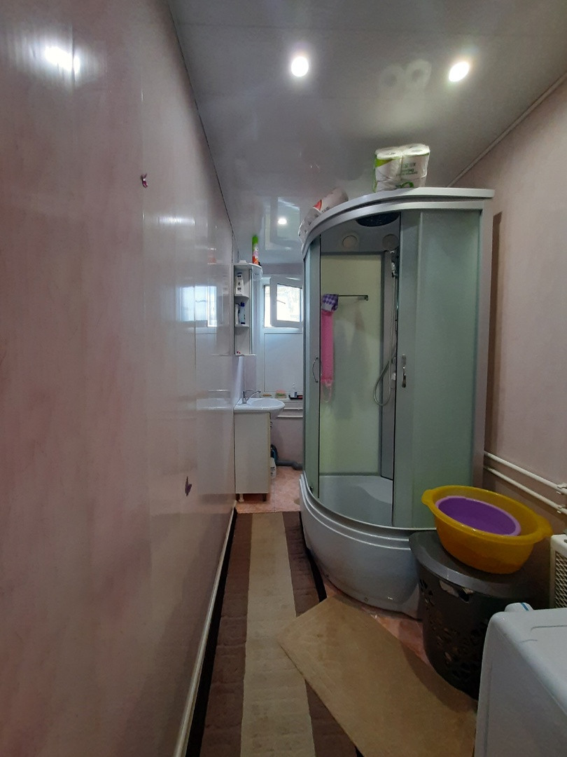 - с/у совмещен с ванной (стены обшиты ПВХ панелями, установлена душевая кабина)