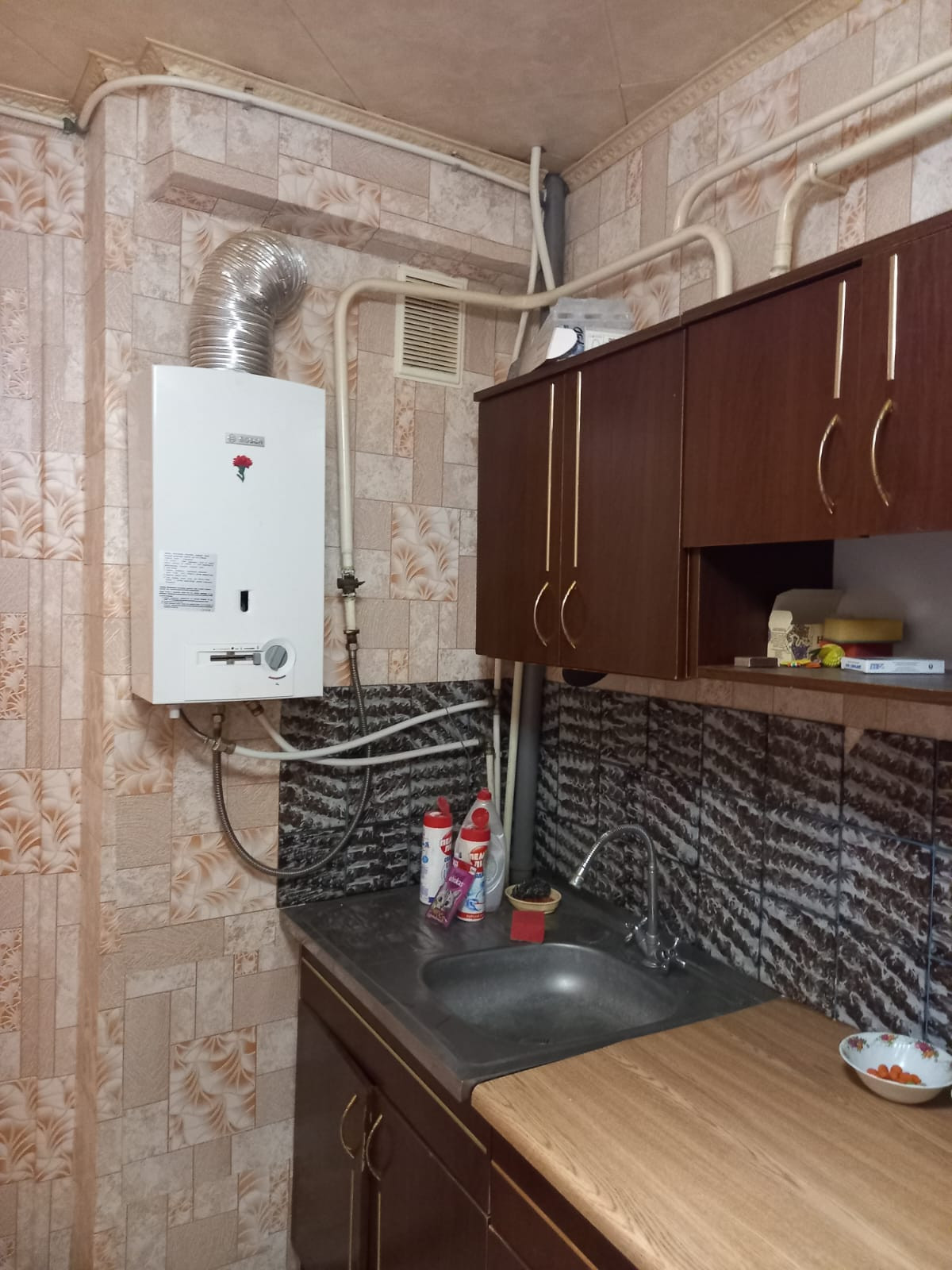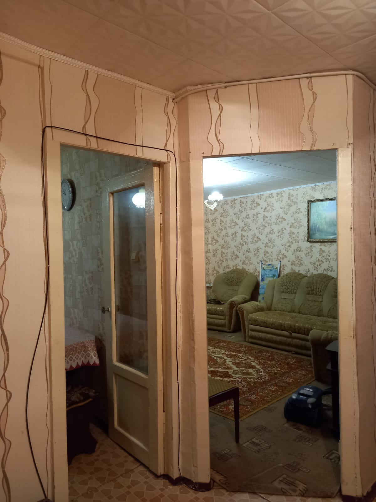 Квартира не угловая, тёплая, балкон застеклён пластик, газ, вода. Отопление центральное. Санузел раздельный. Остаётся мебель необходимая.