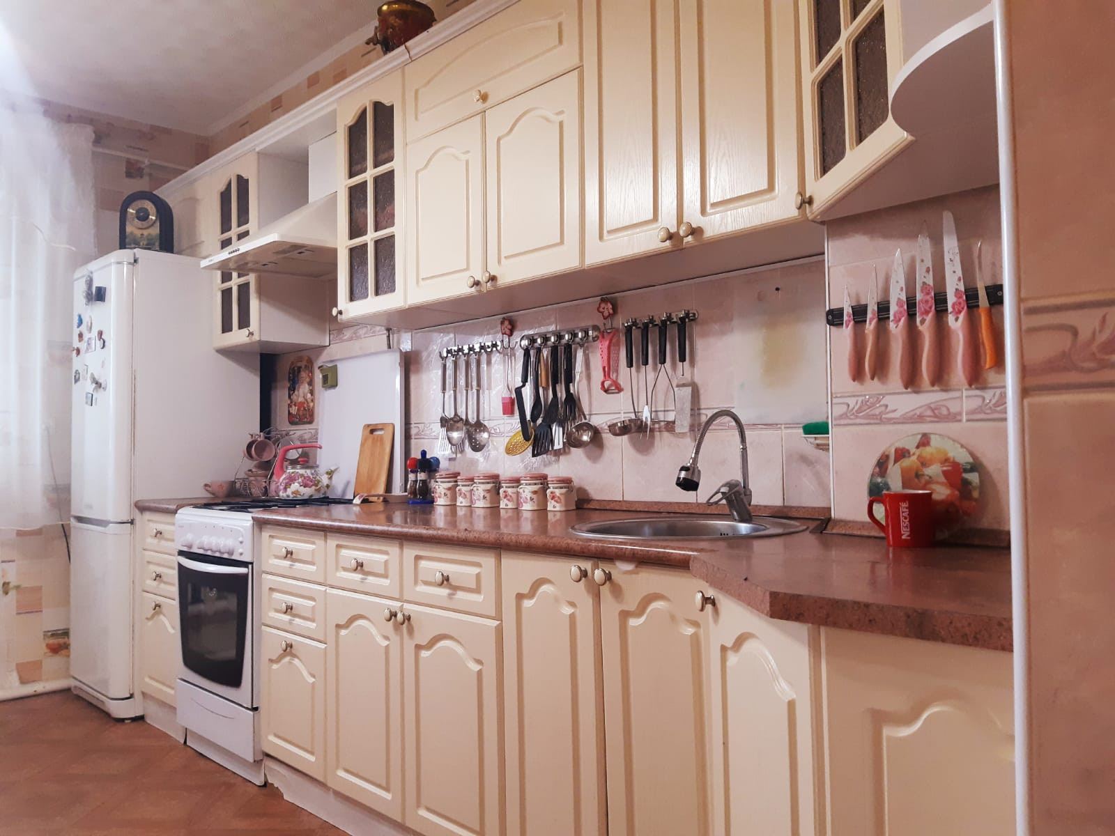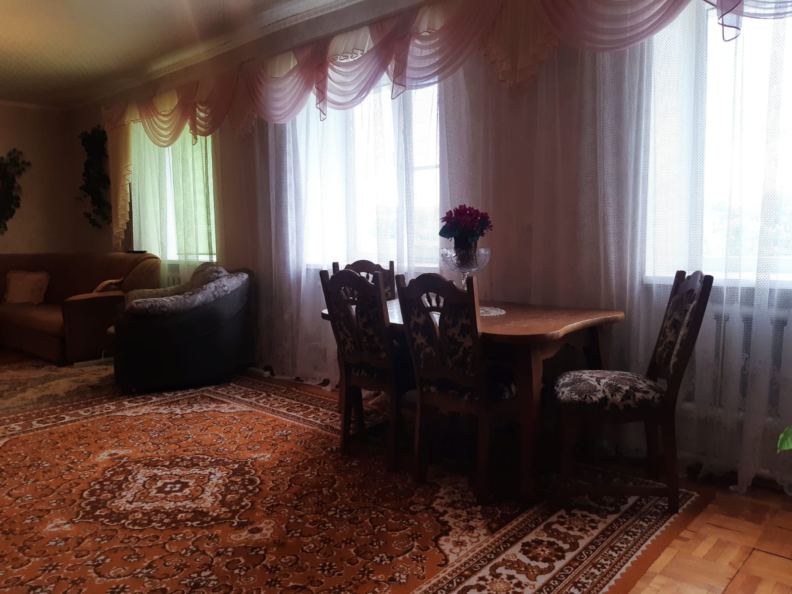 Напольное покрытие: в гостиной и 2 комнатах – паркет, в кухне – линолеум, в 2 комнатах – напольная доска, в санузлах и тепловом узле – керамическая плитка;