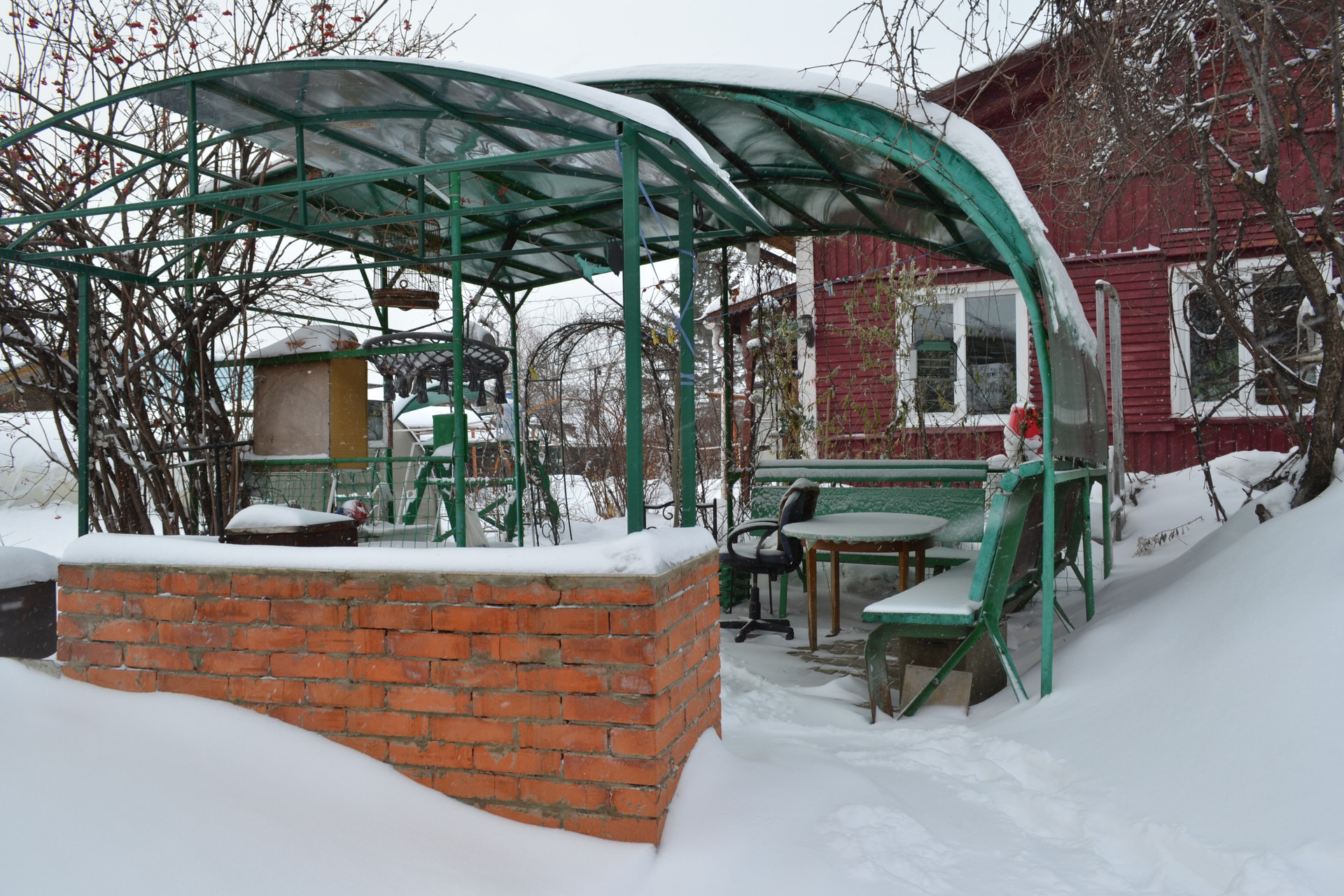 На участке находится три теплицы, баня, хоз. Постройки, зимний сад, мангальная зона и гараж с эстакадой, территория благоустроенна и ухожена.