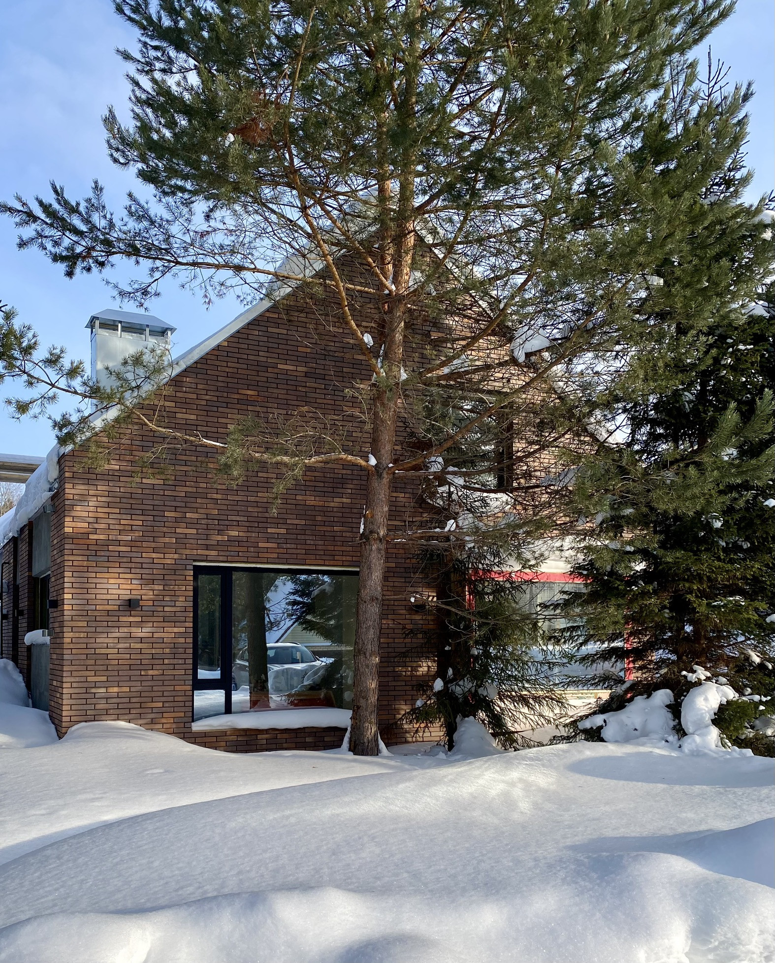Очень живописное место, но весьма неоднозначное. С одной стороны природа, с другой стороны активный ритм поселка. Человек как будто видит шум поселка, но не слышит его. Тишина, ветер проникают сквозь ритм витражей в интерьер дома. Коттедж наполнен воздухом. Ничего лишнего.