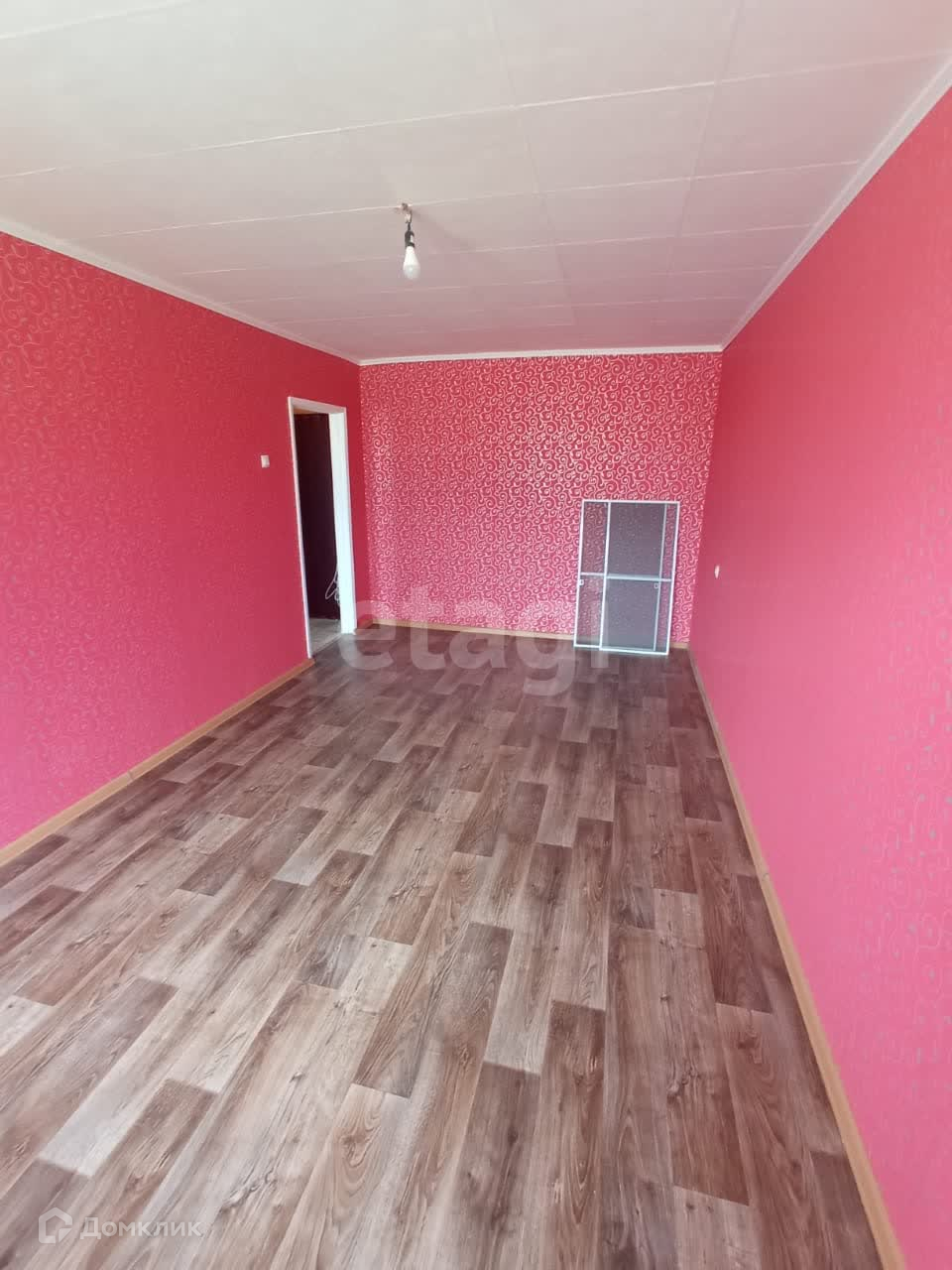 Комната 17,4 кв.м. На потолке плитка, на стенах обои, на полу ламинат. Батареи чугунные.