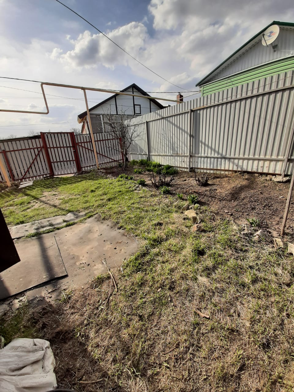Сад у дома накормит свежими фруктами. Имеются: две плодоносящие желтые с красным бочком черешни (одна черешня очень ранняя, вторая средняя), яблони, груши, крыжовник, виноград розовый и синий.