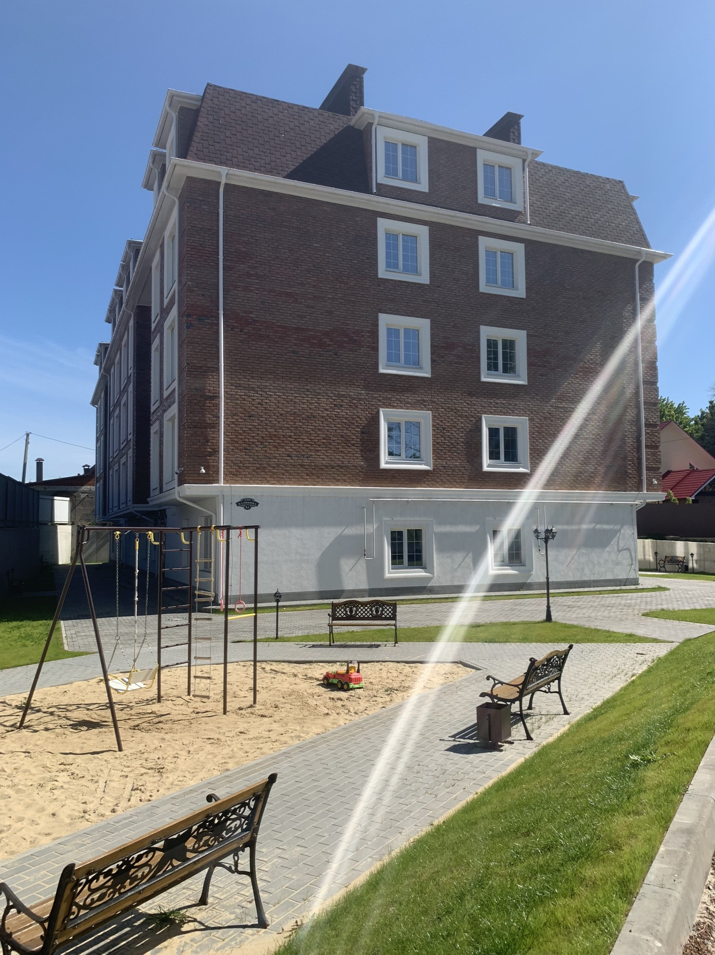 Охраняемая придомовая территория включает автопарковку, детскую площадку, зону отдыха, тротуары, клумбы и газоны.