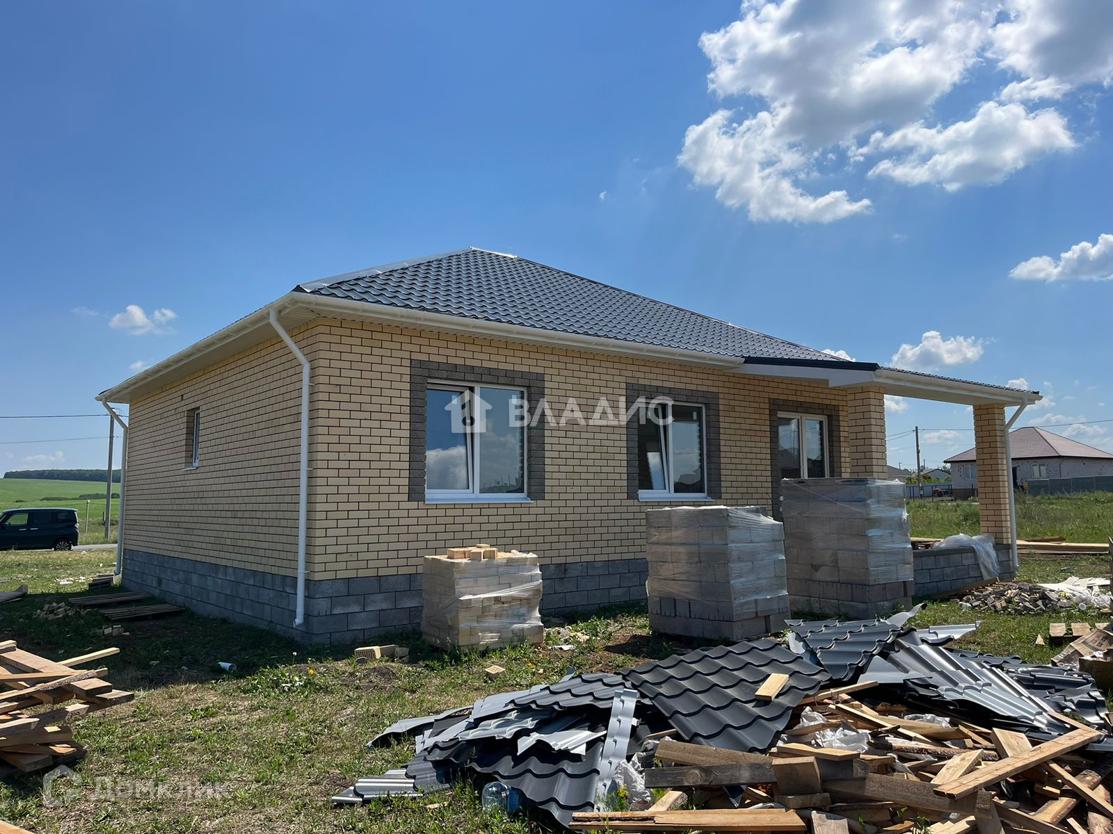 Дом построен из блоков и облицован кирпичом.