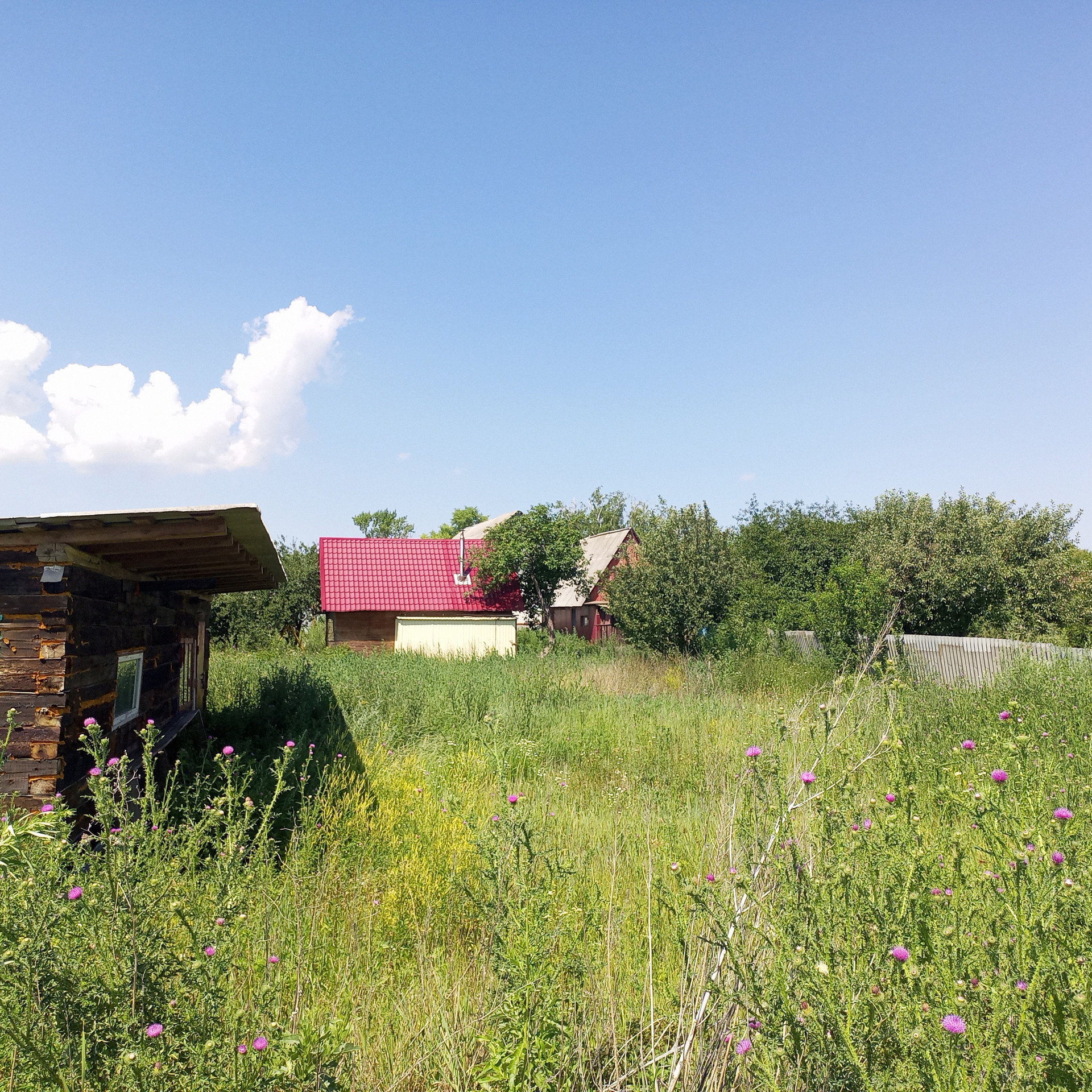 Ухоженный участок. Участок огорожен высоким забором. Есть плодовые деревья и кустарники.