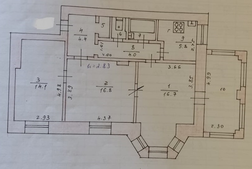 Общая площадь 66.2кв.м., комнаты 14/17/16.5кв.м., санузел раздельный, кухня 6кв.м., просторная лоджия. Квартира теплая, сухая, светлая. В квартире требуется ремонт. Квартира находится на стадии начавшегося ремонта. Частично поменяна эл. проводка, побелены потолки, сделана небольшая перепланировка, кухня соединена с комнатой, установлена новая железная входная дверь.