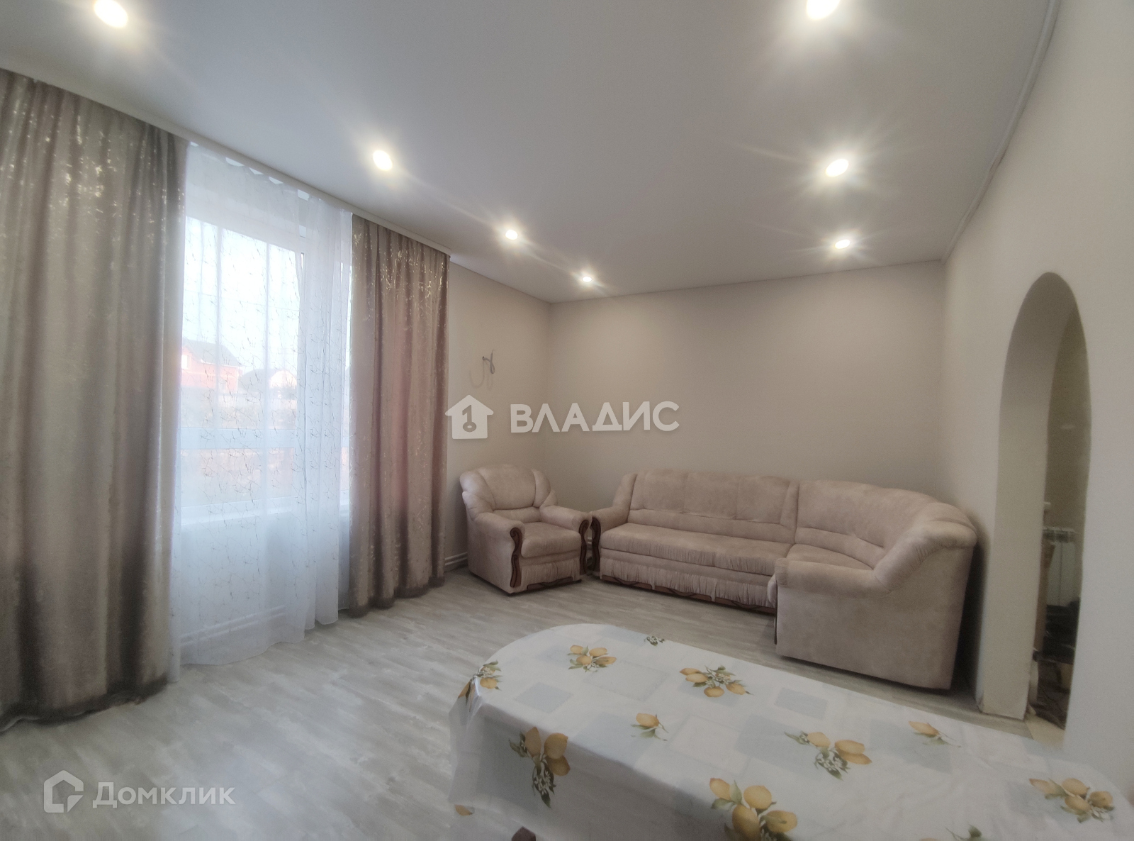 Внутреннее состояние дома: общая площадь 66,2 м2. В доме 2 спальни, кухня - гостиная, коридор, совмещенный санузел.  Напольное покрытие дома выполнено из – ламината и плитки. Стены оклеены обоями. Потолки натяжные. Окна ПВХ. "Теплый пол" в коридоре и в санузле