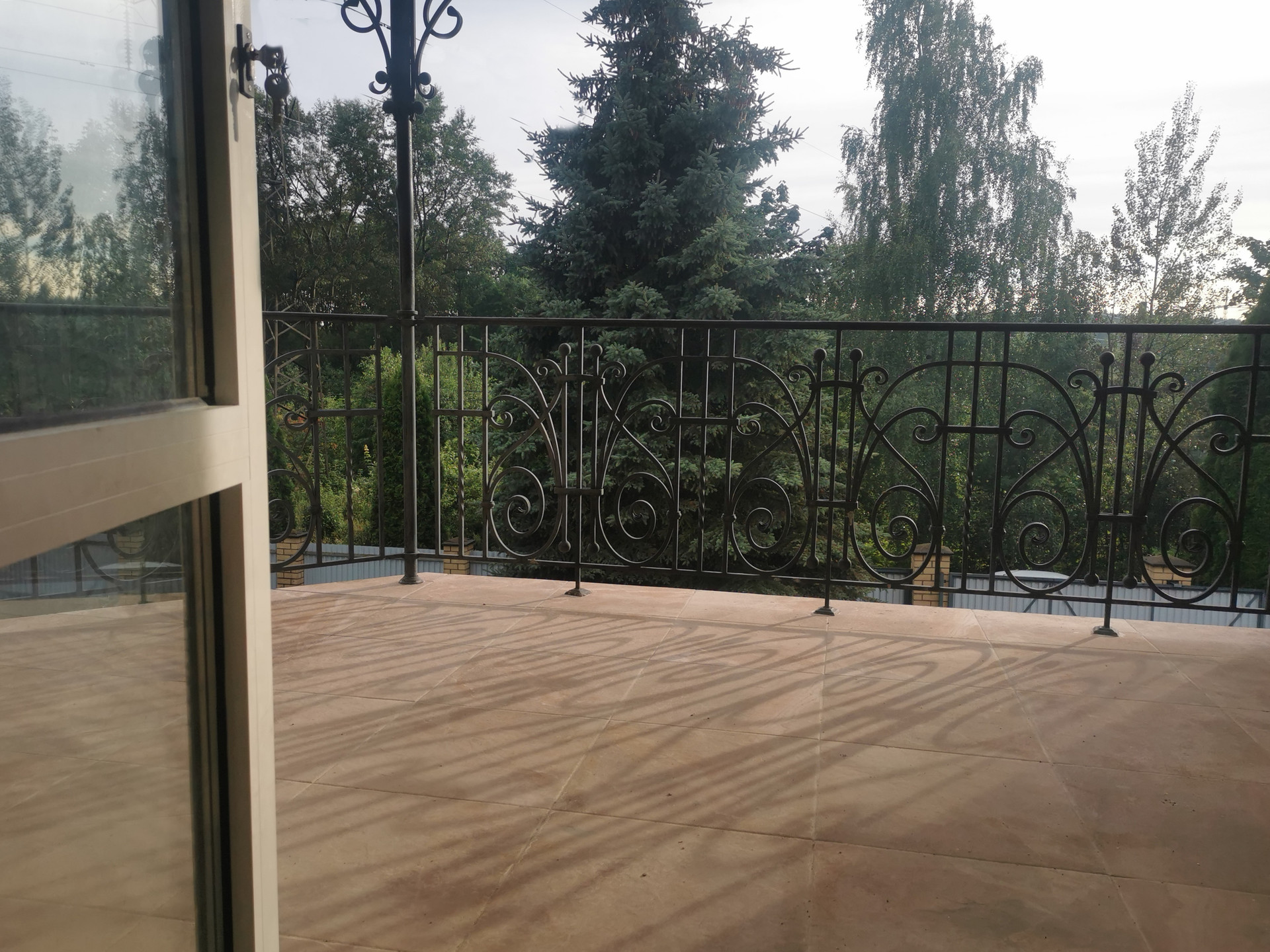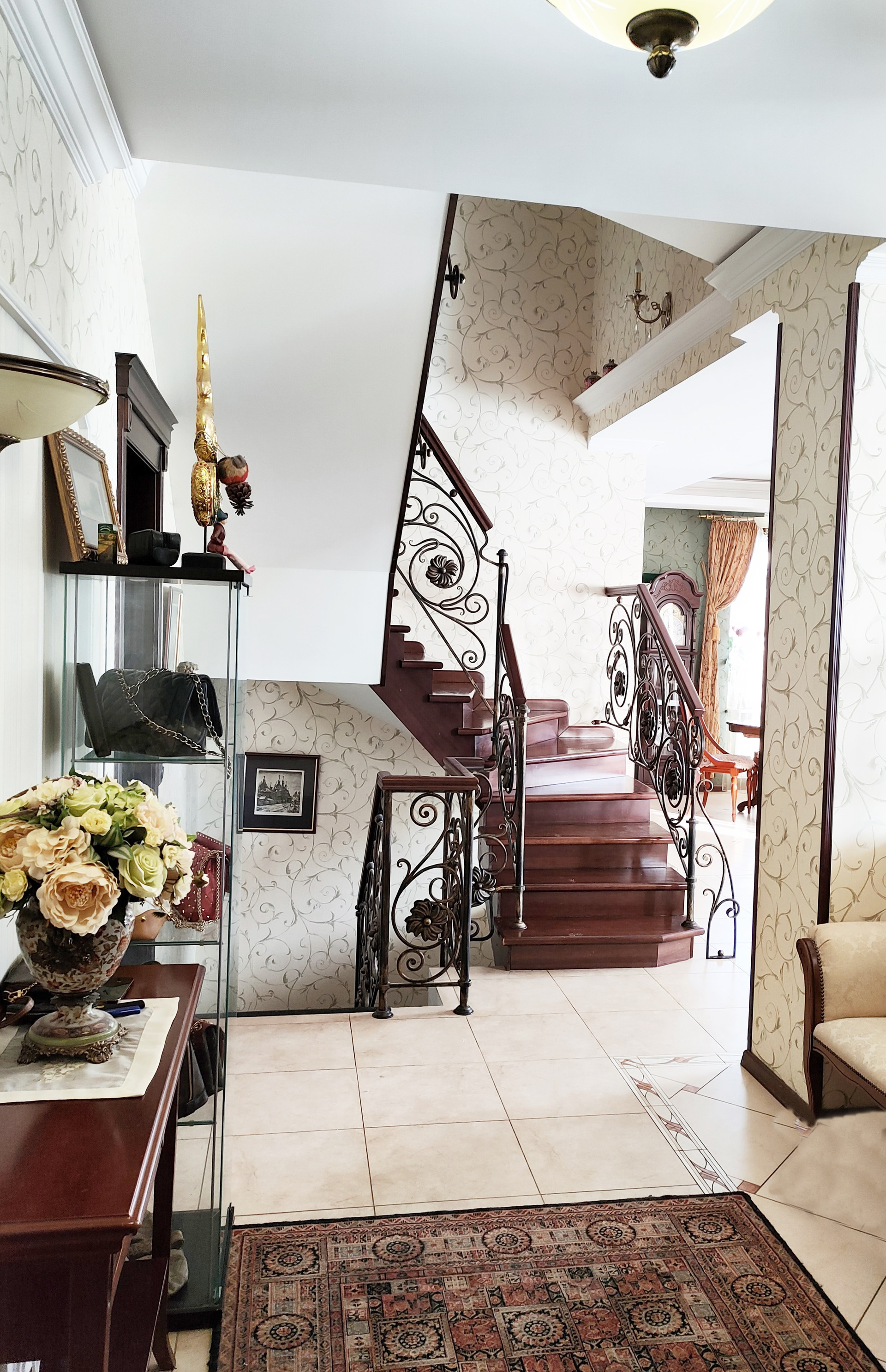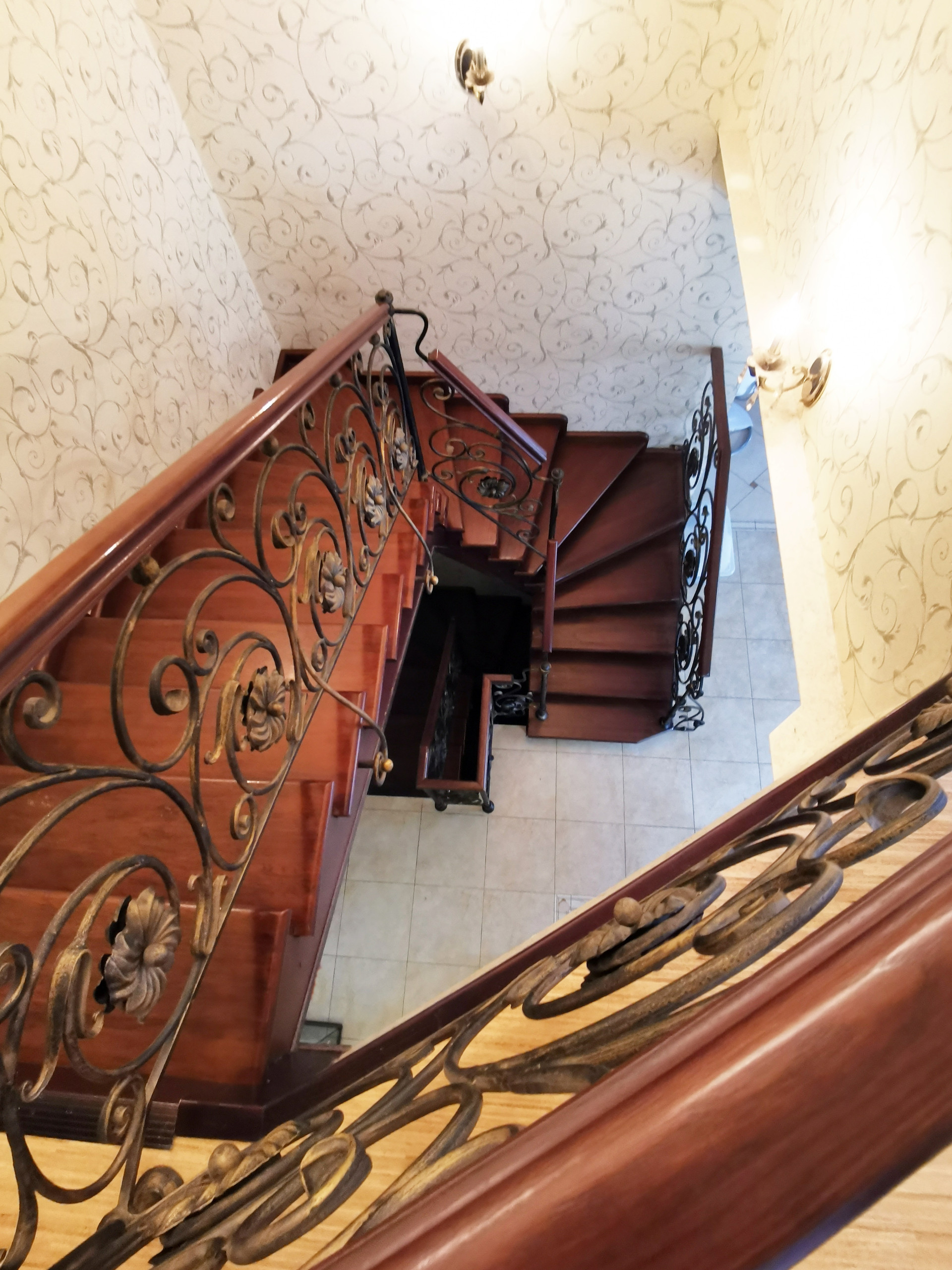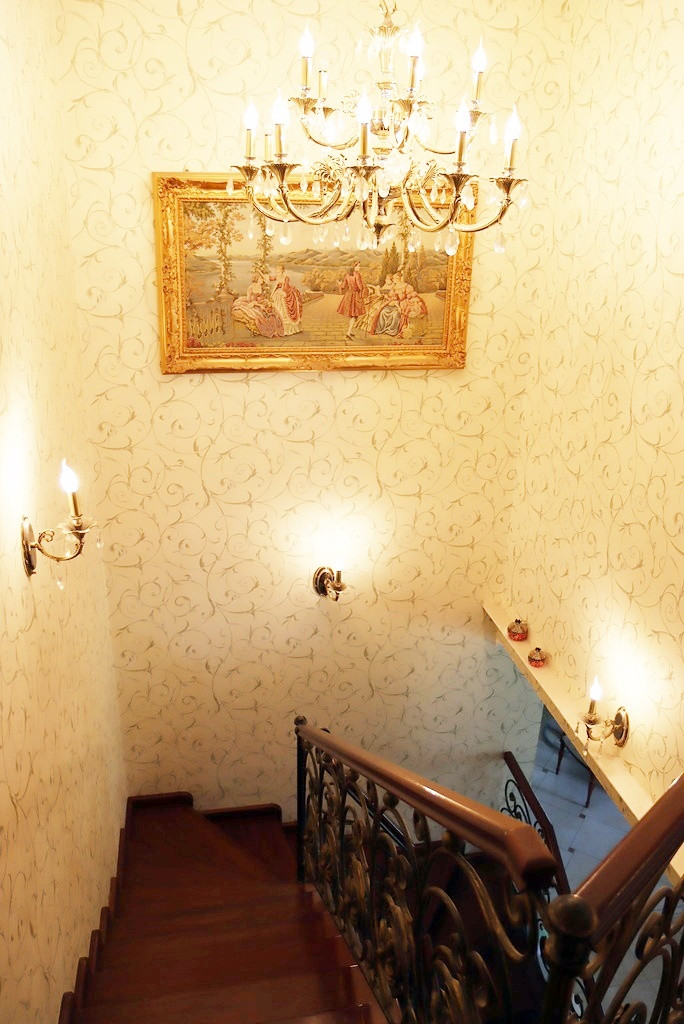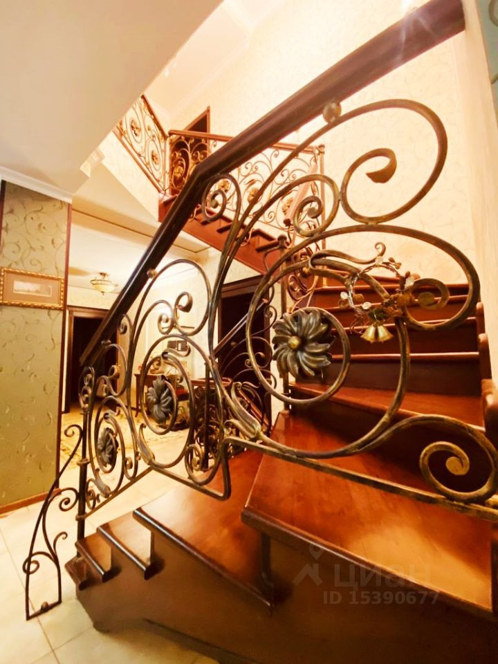 Лeстница-ручной ковки, деревянные ступени, от цокольного этажа до последнего выполнена на несущем металл-каркасе.