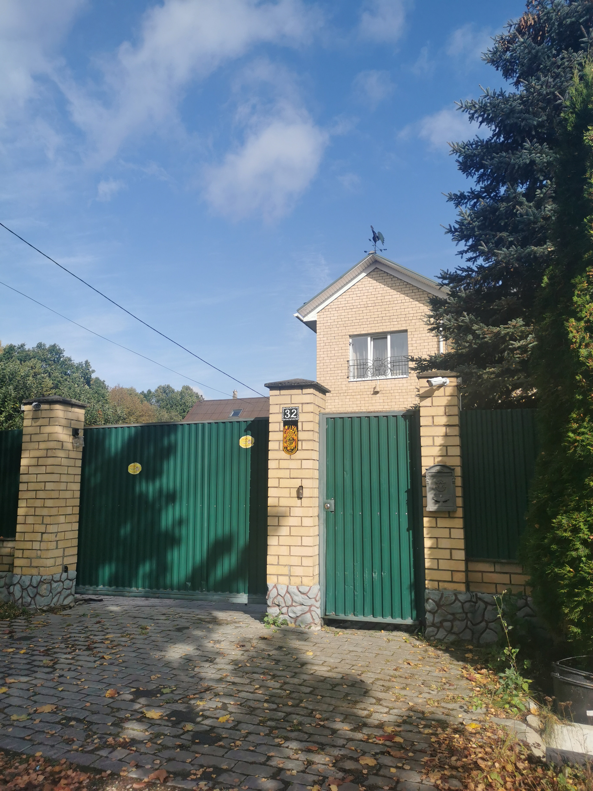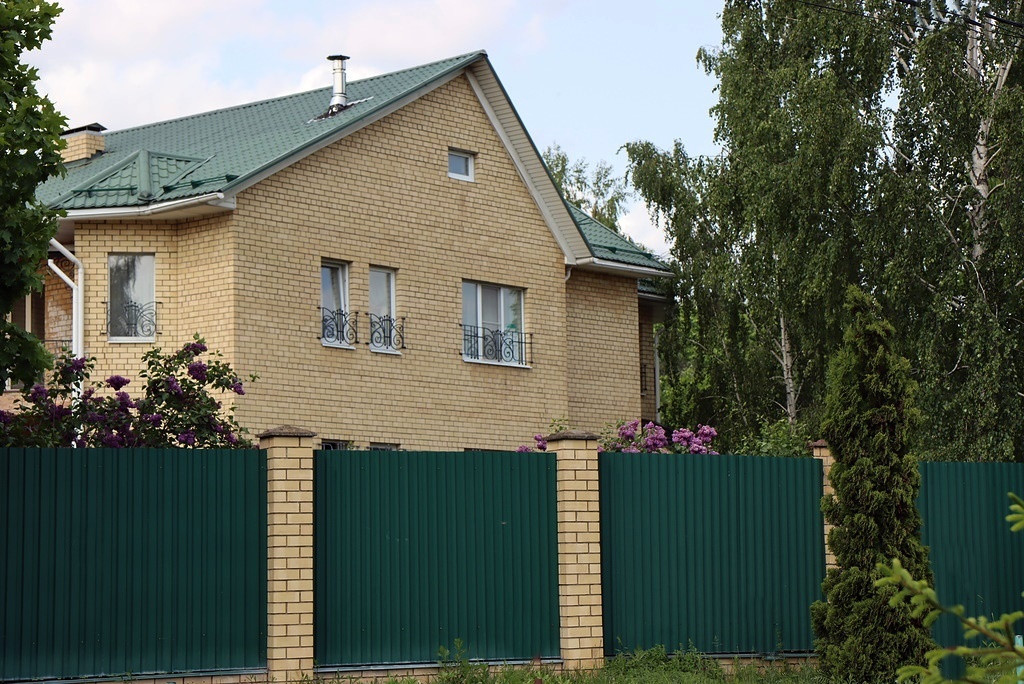 Забор выполнен на бетонном фундаменте, кирпичные столбы, пролеты - профлист, автоматические въездные ворота.